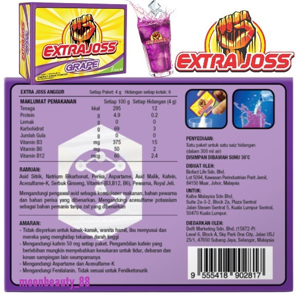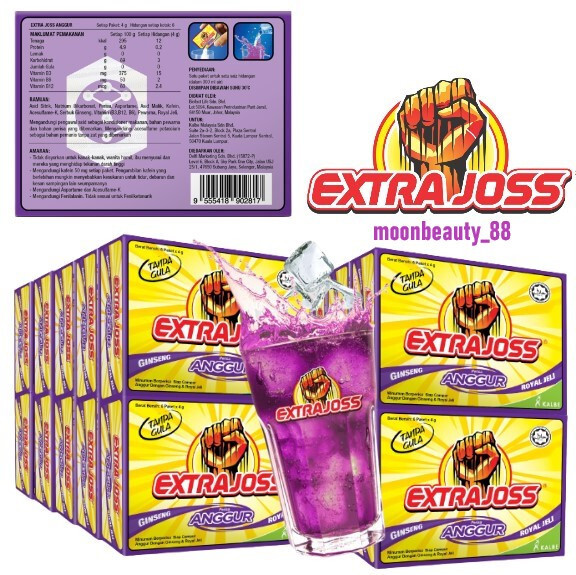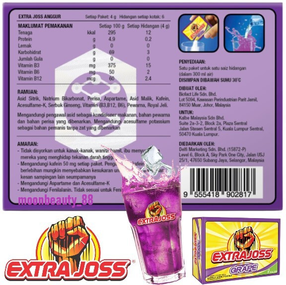 Product Details: 120 Sachet Extra Joss Grape Flavour Sugar Free Energy Drink Powder FREE SHIPPING Extra Joss is a health supplement that helps the body's metabolism to stay fit, it contains 7 Vitamin B, amino acids, caffeine, ginseng and royal jelly. Ingredients: Grape Extract 150 mg, Ginseng Extract 35 mg, Vitamin B1 1.5 mg / 1.1 mg, Vitamin B6 2 mg, Vitamin B12 2.4 mcg/2.0 mcg, Taurine 100 mg, Caffeine 50 mg, Sugar, Aspartame, Citric Acid, Royal Jelly Precautions: Not recommended for children, pregnant women, lactating mothers and hypertensive patients Storage Condition: Store below 30°C. Keep away from direct sunlight and humidity. Serving Suggestion: Dilute 1 sachet in 300ml cold water. Seller Responsibility 1- If item detained by custom full refund will given 2- Item receive damage ( please provide picture and full refund will given ) Handling Time One business day after receive payment EXPEDITE ETA - Estimate Time Arrive Within 7 days working days Shipping service Expedite Packaging Proper packaging with burble wrap and box Tracking number Provide and available to track via eBay system tracking. REMOTE AREA NOTICE !! Orders might be subject for extra/additional shipping charges if you are part of Remote Areas as per zip code system. Message will be sent to you for further discussion or before place order contact seller and provide Zip code and seller will help to checking with shipping courier service Tax & Duty We are not responsible for tax duty We will complete full fill shipping label form for ID Tax number information follow as given by eBay Seller Responsibility 1- If item detained by custom full refund will given 3- If item detained by custom due to REFUSE TO PAY TAX seller not responsibility 2- Item receive damage ( please provide picture and full refund will given )