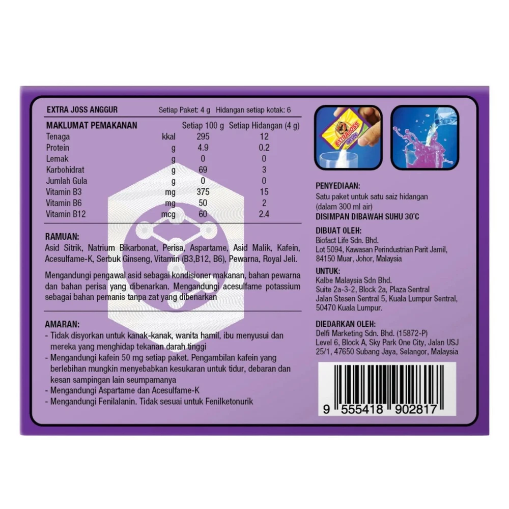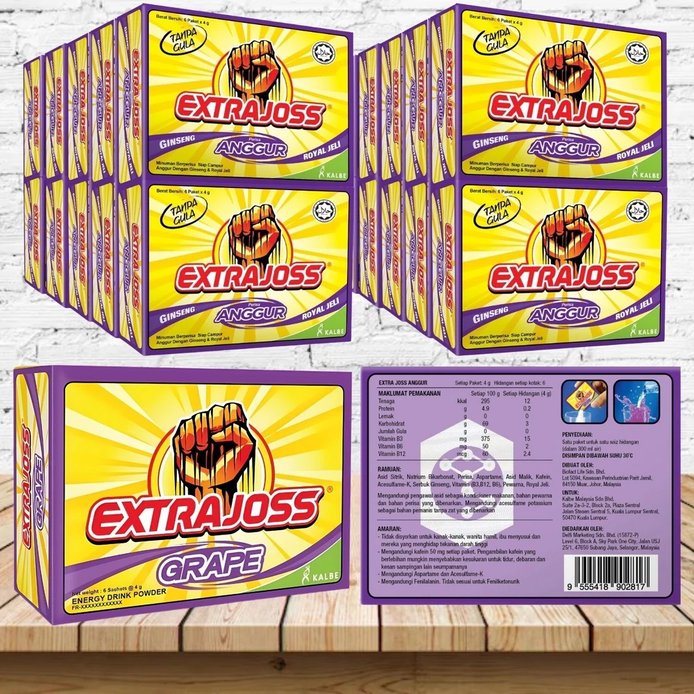 Created with Eselt - Responsive Templates for eBay Sellers Created with Eselt - Responsive Templates for eBay Sellers Our Store Seller Profile Feedback About us Contact Extra Joss Energy Boost Drink Powder Grape Flavor Description Introducing a new Extra Joss flavour: Grape! Savour the delightful blend of grape and blackberry flavours. Enjoy a sachet of Extra Joss Grape anytime for its delightful flavour. It’s ideal for any part of your day! Extra Joss Grape offers a rich grape flavour. Just throw the powder in your mouth, experience the sweet taste, and take a sip of your favourite drink. You can also dissolve it in a glass with water - the most purple drink you've ever seen! Discover the reason Extra Joss is celebrated all over the world. Originating from the vibrant culture of Indonesia, it now brings you the unique grape taste, perfect for your exciting moments! Extra Joss represents high quality, offering zero-sugar sachets made with premium ingredients. It's an excellent choice for your active days or leisure times, widely trusted by professionals and enthusiasts. Ingredients 50 mg Caffeine 35 mg Ginseng Extract 2 mg Royal Jelly 2.2 mg Vitamin B2 (138% RDA) 16 mg Vitamin B3 (100% RDA) 5 mg Vitamin B5 (100% RDA) 1.2 mg Vitamin B6 (80% RDA) 10 mg Vitamin B8 (25% RDA) 100 μg Vitamin B9 (50% RDA) 1 μg Vitamin B12 (40% RDA) Other ingredients: Acidity regulators E330, E500; Sweeteners E950, E951; Natural flavours. How to Prepare 2 sachets per day. Do not exceed recommended dose. Serving suggestion: dilute 1 sachet in 200 ml water. Extra Joss Mango is a powdered food supplement with sweeteners. Precautions Not recommended for children and pregnant women. Keep cool, dry, and out of reach of young children. Each sachet contains 50 mg caffeine. Contains aspartame (a source of phenylalanine). Food supplements are no substitute for a varied, balanced diet and healthy lifestyle. Payment Currently we accept payment through Ebay managed payment Shipping We provide FREE SHIPPING using Economy Shipping to USA. Your item will be shipped with a valid tracking number. Handling time is 6 BUSINESS DAYS. Estimated delivery is between 11-23 BUSINESS DAYS. Returns We provide 30-day RETURN and full refund policy. Your item can be returned for a full refund within 30 days from the date of receiving your items. You are responsible for the return shipping cost and the return shipping charges are not reimbursable. Please take note that we are not responsible for any inquiry after 30-day period. If you have any problems with your order, please contact us via eBay message. We are glad to assist you in solving the problem as soon as possible. Other Note: Import duties, taxes, and additional charges are not included in the item price or shipping charges. Please be aware this custom import duties and taxes are buyer's responsibility.