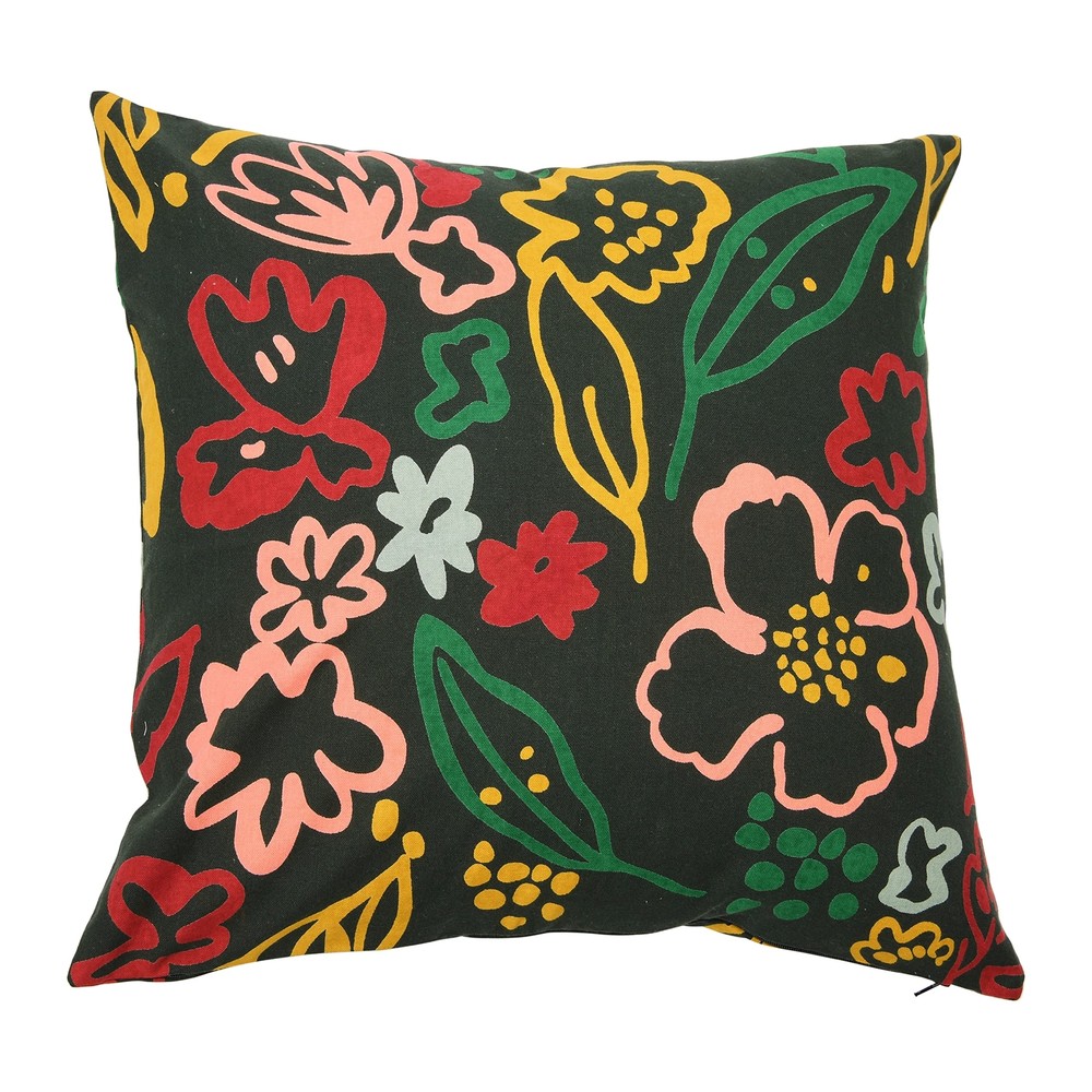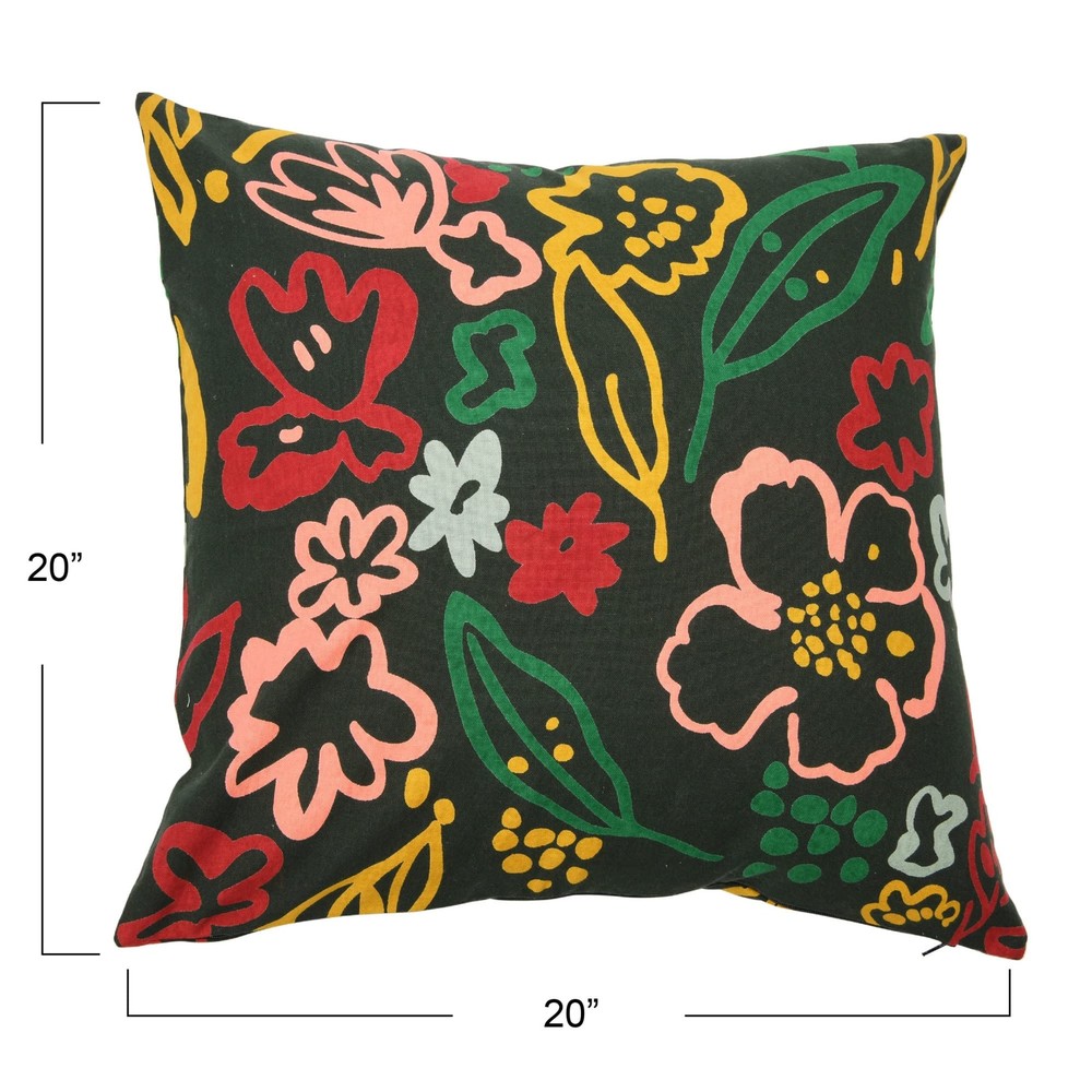 Add a hint of modern art to your bed, chaise, or loveseat with this lively throw pillow; With a bold floral print and contrasting colors, it is the ultimate plush accent This Scandinavian pillow showcases a jaunty floral pattern screen-printed on jet black cotton Botanical inspired pillow with a pop-art floral screen print on front and back Express your constantly evolving style with the simple addition of this eye-catching pillow; Pillow cover and synthetic down alternative insert Removable cotton pillow cover; in-seam zipper closure; machine wash warm, gentle cycle, do not bleach, tumble dry low, warm iron if needed Pillow Measures 20" L x 20" W