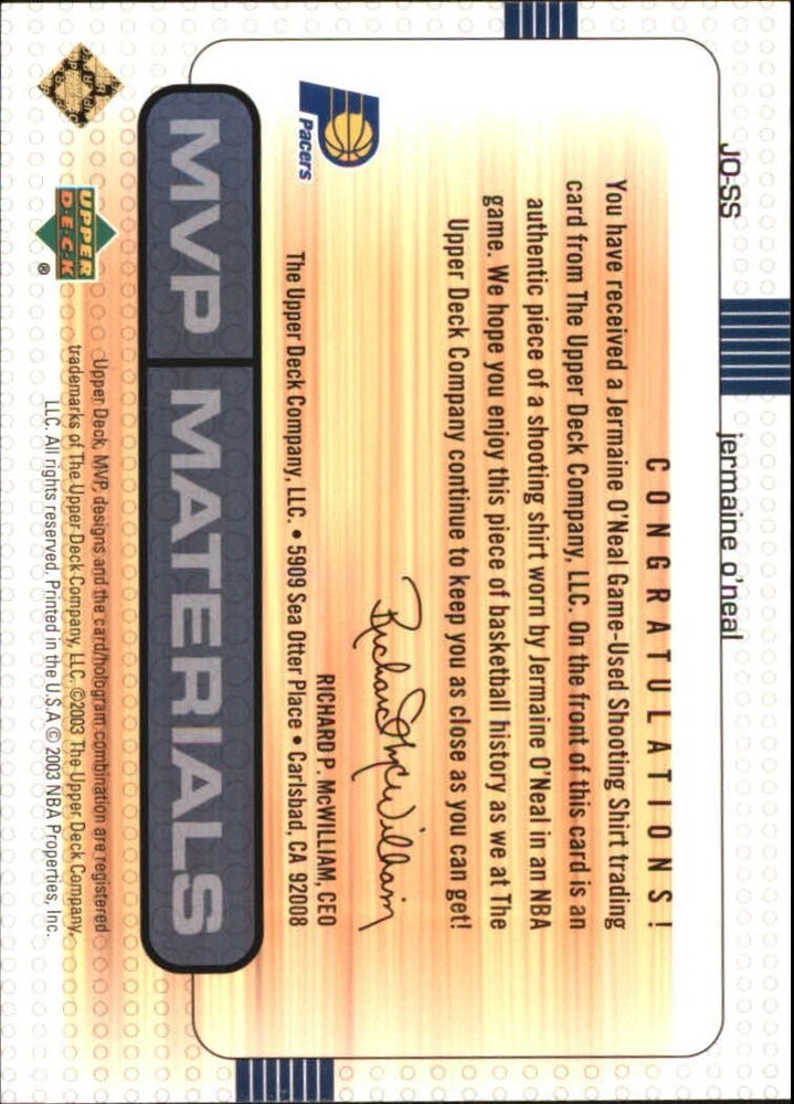 This jersey relic card is a must-have for Jermaine O'Neal fans! The fabric swatch adds great authenticity, and the design looks sharp. Love the nostalgic early 2000s upper deck style—simple but classic. Shipping cost is super reasonable when buying multiple items too. A solid addition to any basketball collection!