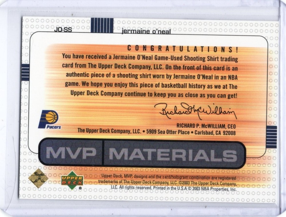 2003-04 Upper Deck MVP Materials Shirts #JOSS Jermaine O'Neal Item sold as is. * Please note that the card is not graded, nor have we made any determination of what the card may grade as. This is an opportunity to add to your collection. Shipping is free within the continental United States.