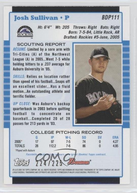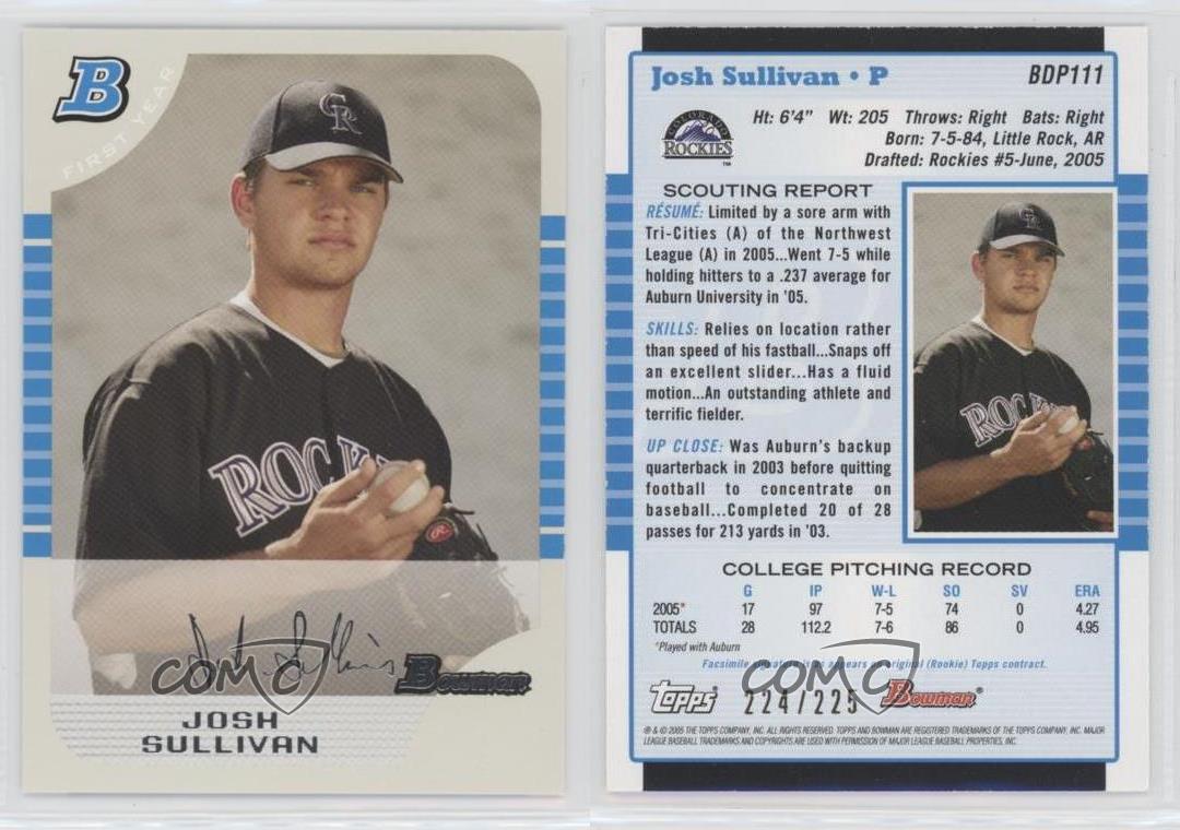 2005 Bowman Draft Picks & Prospects - [Base] - White #BDP111 Josh Sullivan Qty Made: 225 - Rookie - Baseball Card - Featuring the Colorado Rockies - Featuring Josh Sullivan Search for more: 2005 Bowman Draft Picks & Prospects Search for more: 2005 Bowman Draft Picks & Prospects - [Base] - White View all of our Listings Auctions Buy It Now About Us Located in the beautiful Pacific Northwest, COMC (Check Out My Cards) is the world's largest consignment service for trading card singles. More than 10,000 people have used our consignment service to list over 50 million trading cards. Find out how we can help you consign your items on eBay by contacting us through eBay messaging. COMC -- "The Safe & Easy Way to Buy & Sell" Representative Image - Select Specific Item above to see image of actual item Representative Image - Select Specific Item above to see image of actual item Raw Condition for Modern Cards Unless otherwise noted, raw modern cards are listed in Near Mint-Mint condition or better. A NM-MT card appears to be Mint at first glance, but upon closer inspection, may exhibit some of the following: minor print defects (e.g. roller marks, print line, dimple), minor scratches, slight edge wear, and slight corner wear. Centering is clearly visible in the images provided and does not factor into our condition assessment. Raw Condition for Vintage Cards Unless otherwise noted, raw vintage cards are listed in Excellent condition or better. An EX card may exhibit some of the following: minor rounding of corners, surface wear, print defects, light scratches, and slight edge wear/chipping. Centering is clearly visible in the images provided and does not factor into our condition assessment. Domestic Shipping Combined shipping for multiple items is available. To receive combined shipping, please ensure all desired items are in your eBay shopping cart before proceeding to checkout. eBay limits orders to 40 items per order. We automatically combine multiple orders placed on the same day. If you place multiple orders on the same day, please contact us to request a refund of applicable shipping costs. Signature confirmation may be required on invoices over $400. All cards are protected and shipped securely. International Shipping COMC offers eBay's International Shipping (EIS) for international orders under $2,500* (see country exceptions below). All duties and import fees are paid at checkout; in the rare event that there are additional import fees upon delivery, these are borne by the buyer. EIS packages route through a shipping hub in Erlanger, KY before shipping to their final destination. Please note that EIS does not allow for combined shipments. The shipping rates are determined by eBay and cannot be adjusted. *Maximum sale price exceptions: Colombia, Kuwait ($2,000); Taiwan ($1,539); Chile, Costa Rica, Guatemala, Honduras, Trinidad and Tobago ($1,000); Antigua and Barbuda, Aruba, Belize, Dominica, Grenada, Philippines, Saint Kitts and Nevis, Saint Lucia, Montserrat, Turks and Caicos Islands ($500); Dominican Republic, El Salvador ($200). Please request a shipping quote through eBay messaging for orders that exceed the maximum sale price supported by eBay's International Shipping. You will be responsible for all duties and import fees for international orders shipped outside the EIS. All cards are protected and shipped securely. Payment COMC does not accept offers on our cards through our eBay storefront. COMC utilizes eBay’s managed payments system. If you are experiencing difficulties making a payment, please contact eBay for assistance. Return Policy Returns are only accepted on the rare occasion the item is not as described. If you are making a return, please initiate the return process through eBay so a mailing label can be provided for you. Prior to listing, our expert team carefully assessed this item to represent it accurately. Please review the description and high-definition images prior to purchasing to ensure this item meets your satisfaction. We welcome you to contact us if you have further questions about this item. Trust and Integrity COMC carefully assesses each item consigned to us to prevent fraudulent items from entering the marketplace. If you believe an item offered on COMC may be fraudulent, please contact us with details so we can investigate the issue. Items we determine are outside our supported items policy may be removed. Last Modified: 5/6/2025 10:41:08 AM PDT