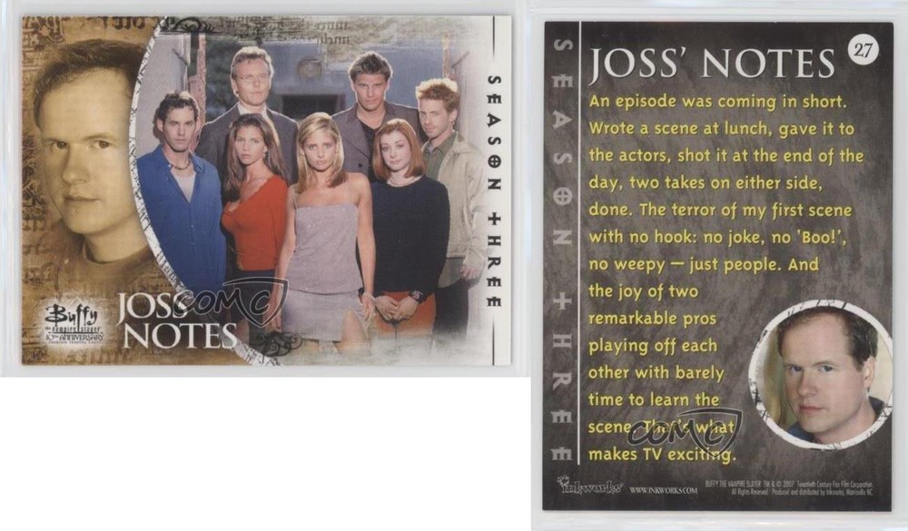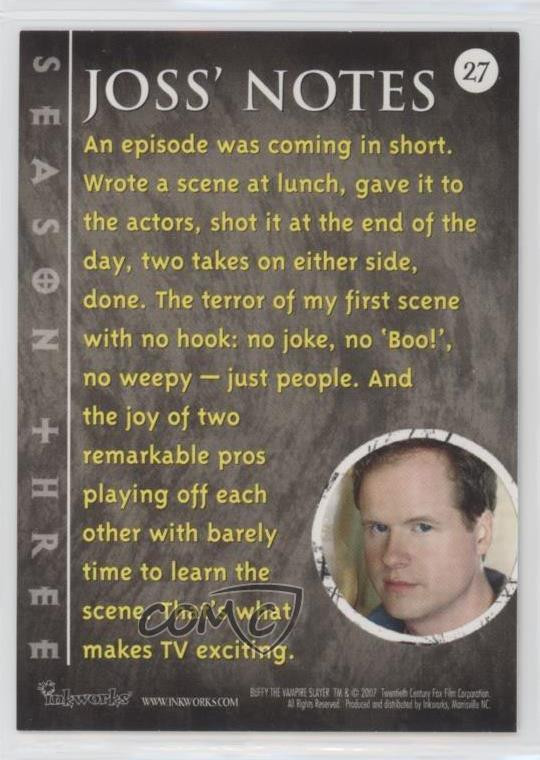 2007 Inkworks Buffy the Vampire Slayer 10th Anniversary - [Base] #27 Joss' Notes - Season Three COMC Item: 136607026 - Non-Sports Card Search for more: 2007 Inkworks Buffy the Vampire Slayer 10th Anniversary Search for more: 2007 Inkworks Buffy the Vampire Slayer 10th Anniversary - [Base] View all of our Listings Auctions Buy It Now About Us Located in the beautiful Pacific Northwest, COMC (Check Out My Cards) is the world's largest consignment service for trading card singles. More than 10,000 people have used our consignment service to list over 50 million trading cards. Find out how we can help you consign your items on eBay by contacting us through eBay messaging. COMC -- "The Safe & Easy Way to Buy & Sell" Raw Condition for Modern Cards Unless otherwise noted, raw modern cards are listed in Near Mint-Mint condition or better. A NM-MT card appears to be Mint at first glance, but upon closer inspection, may exhibit some of the following: minor print defects (e.g. roller marks, print line, dimple), minor scratches, slight edge wear, and slight corner wear. Centering is clearly visible in the images provided and does not factor into our condition assessment. Raw Condition for Vintage Cards Unless otherwise noted, raw vintage cards are listed in Excellent condition or better. An EX card may exhibit some of the following: minor rounding of corners, surface wear, print defects, light scratches, and slight edge wear/chipping. Centering is clearly visible in the images provided and does not factor into our condition assessment. Domestic Shipping Combined shipping for multiple items is available. To receive combined shipping, please ensure all desired items are in your eBay shopping cart before proceeding to checkout. eBay limits orders to 40 items per order. We automatically combine multiple orders placed on the same day. If you place multiple orders on the same day, please contact us to request a refund of applicable shipping costs. Signature confirmation may be required on invoices over $400. All cards are protected and shipped securely. International Shipping COMC offers eBay's International Shipping (EIS) for international orders under $2,500* (see country exceptions below). All duties and import fees are paid at checkout; in the rare event that there are additional import fees upon delivery, these are borne by the buyer. EIS packages route through a shipping hub in Erlanger, KY before shipping to their final destination. Please note that EIS does not allow for combined shipments. The shipping rates are determined by eBay and cannot be adjusted. *Maximum sale price exceptions: Colombia, Kuwait ($2,000); Taiwan ($1,539); Chile, Costa Rica, Guatemala, Honduras, Trinidad and Tobago ($1,000); Antigua and Barbuda, Aruba, Belize, Dominica, Grenada, Philippines, Saint Kitts and Nevis, Saint Lucia, Montserrat, Turks and Caicos Islands ($500); Dominican Republic, El Salvador ($200). Please request a shipping quote through eBay messaging for orders that exceed the maximum sale price supported by eBay's International Shipping. You will be responsible for all duties and import fees for international orders shipped outside the EIS. All cards are protected and shipped securely. Payment COMC does not accept offers on our cards through our eBay storefront. COMC utilizes eBay’s managed payments system. If you are experiencing difficulties making a payment, please contact eBay for assistance. Return Policy Returns are only accepted on the rare occasion the item is not as described. If you are making a return, please initiate the return process through eBay so a mailing label can be provided for you. Prior to listing, our expert team carefully assessed this item to represent it accurately. Please review the description and high-definition images prior to purchasing to ensure this item meets your satisfaction. We welcome you to contact us if you have further questions about this item. Trust and Integrity COMC carefully assesses each item consigned to us to prevent fraudulent items from entering the marketplace. If you believe an item offered on COMC may be fraudulent, please contact us with details so we can investigate the issue. Items we determine are outside our supported items policy may be removed. Last Modified: 5/6/2025 10:40:37 PM PDT
