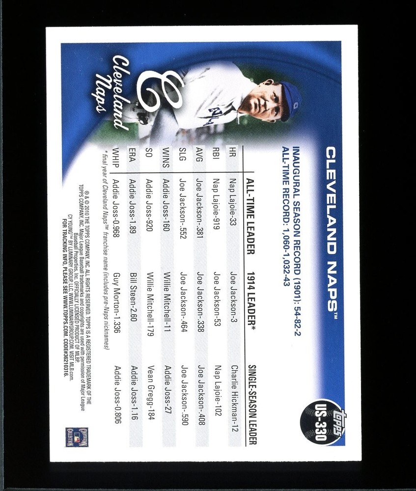 2010 Topps Update Legend Variation #US-330 Cleveland Naps SP Short Print Mint Centered Will Consider Reasonable Offers. Please see the high-res images for details. Feel free to reach out with any questions or if you're looking for something specific. Please follow the Big Joe Knows Cards Store for new items coming soon! We’ll be listing from a large and carefully curated collection of Vintage & Modern Baseball, Basketball, Football, Hockey, Garbage Pail Kids, Magic: The Gathering, Marvel, Pokémon, and Disney cards, etc. CONTENTS OF UNOPENED PACKS: - With the exception of the players visible on the front and/or back of a pack, there are no guarantees about the contents of any unopened material. Higher value packs have been authenticated and/or graded by the foremost industry experts from PSA & BBCE. Packs that have not been wrapped or graded by BBCE or PSA are being SOLD AS FACTORY SEALED . If you have any questions about the authenticity of any product being sold, please feel free to ask for additional photographs and/or information. ITEM(S) IN IMAGES: - Unless otherwise noted, the item(s) in the images are of the exact product that you will receive. Please be sure to review the high-resolution images. CARD CONDITION OF RAW/UNGRADED CARDS: - When assigning the condition of a card, we use the eBay card condition guidelines , which include i) Poor, ii) Very Good, iii) Excellent, and iv) Near Mint or Better. Please note, these four conditions (and standards) do not necessarily correspond directly with professional grading services. - When e stimated grades are provided, they are being provided for evaluation purposes only. While the best efforts have been made to provide an accurate assessment of the condition of the cards, these estimates are not a guarantee of grades. Actual grades assigned by a professional grading service (PSA, SGC, etc.) may be lower or higher than the estimates that have been provided. - If there is an issue with the card that does not seem to show up in the scan, best efforts will be made to call them out in the ' Condition description ' section of the listing. When the word ' Mint ' is used in the listing title and/or description, it means that, in my opinion, the card has a very good chance on receiving a grade of 8 NM-MT, 9 Mint, or 10 Gem Mint from a reputable professional grading service like PSA. Again, this description is no guarantee of the actual grade that a card may receive and should be used for evaluation purposes only. SHIPPING & COMBINED SHIPPING: - We take great care to ensure that our collectibles arrive in the same condition that you purchase them. All of our shipments are insured, and we photograph/record the packaging of our high-end products. - When requested, we will do our best to combine shipping when multiple items are purchased. There is a $0.99 handling fee built into the shipping cost you see listed. When shipping is combined, the total shipping cost will be equal to a) the actual cost of shipping the combined items via your preferred method; plus, b) a handling fee ($0.99 on the first item and $0.50 for each additional item). If you are purchasing more than 2 cards, the handling fee for the additional items will be waived. Typically, you will have the option to select eBay's Standard Envelope Shipping or USPS Ground Advantage. - Please note, when we ship raw/ungraded cards via eBay's Standard Envelope Shipping Program, the cards will be placed in a new penny sleeve inside a new Card Saver I. The card(s) are then placed into a cardboard mail stiffener secured by painter's tape. Due to the weight and size requirements of the Standard Envelope program, we cannot combine more than three (3) cards into a Standard Envelope. We will not combine shipping using eBay's Standard Envelope Program when the combined value of the cards exceeds $25. You will have the option to have the cards shipped individually using the Standard Envelope or combine up to fifty (50) cards with a combined value of up to $500 via USPS Ground Advantage.
