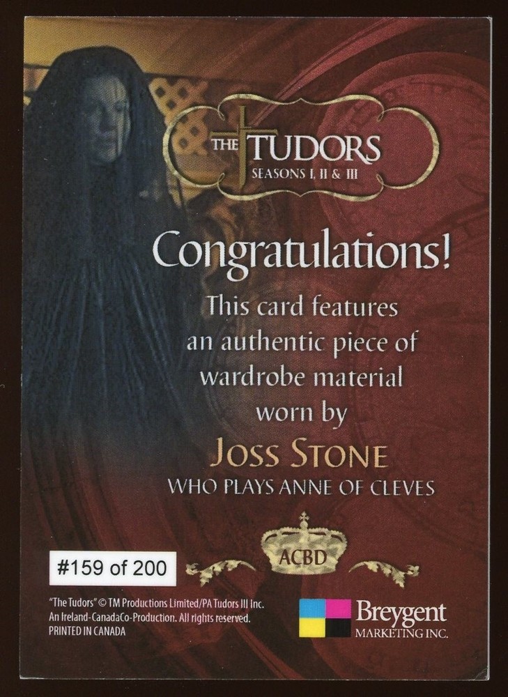 2011 Breygent Marketing The Tudors: Seasons 1-2-3 Joss Stone Wardrobe Card /200 Description Attached is a high resolution scan of the card for sale Shipping Terms Upon receipt of payment, items will typically ship within 1-2 business days. If multiple items are purchased together, shipping will be automatically combined at checkout. About Us BBC Emporium is always aggressively buying sports cards from 1975 and older. We travel the entire country and always offer competitive pricing. Contact us for a quote on your collection.