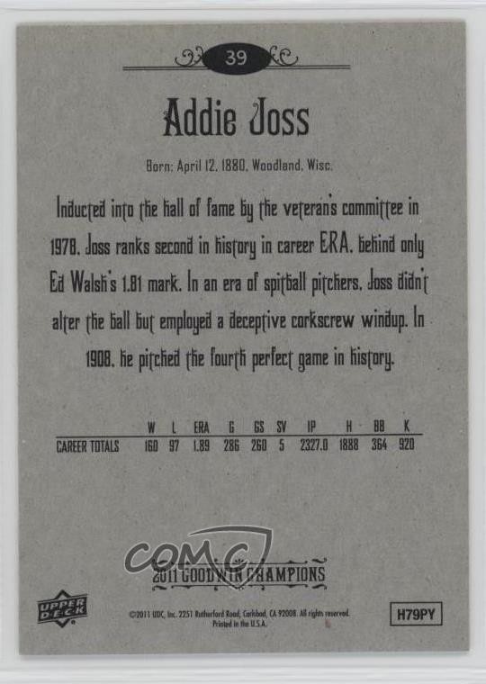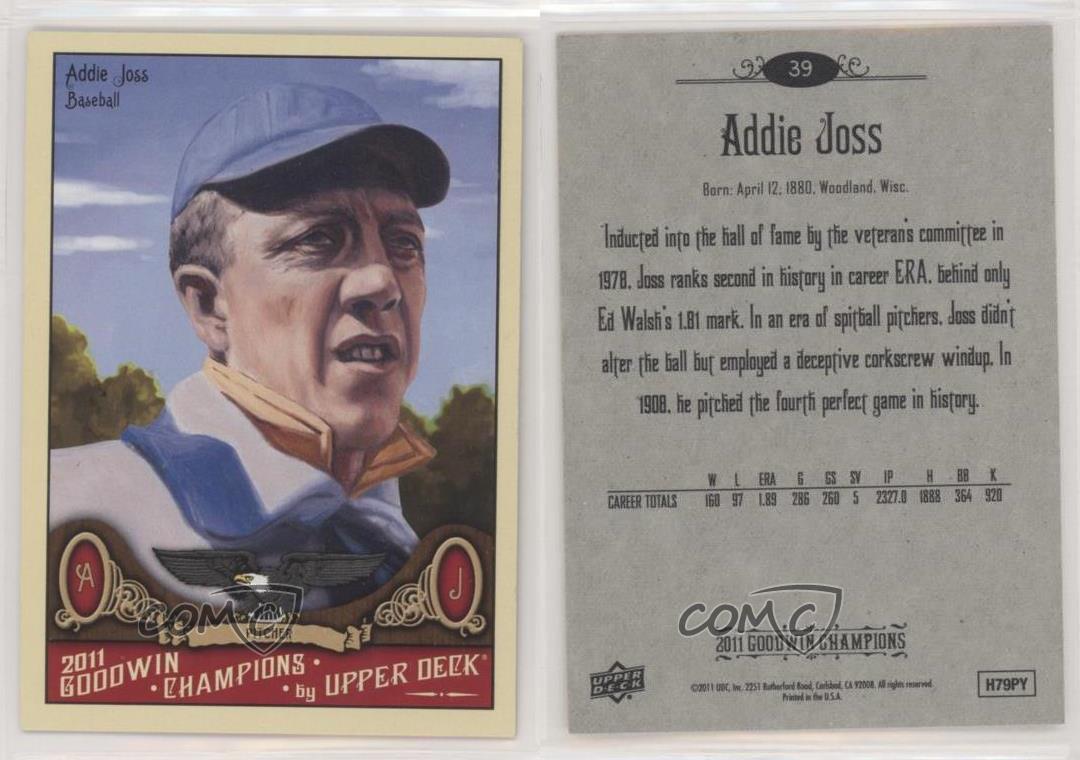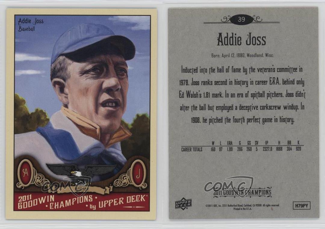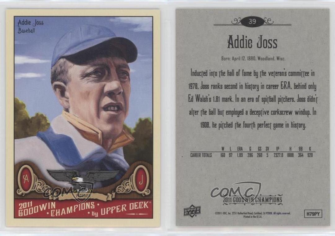 2011 Upper Deck Goodwin Champions - [Base] #39 Addie Joss - Rookie - MultiSport Card - Featuring Addie Joss Search for more: 2011 Upper Deck Goodwin Champions Search for more: 2011 Upper Deck Goodwin Champions - [Base] View all of our Listings Auctions Buy It Now About Us Located in the beautiful Pacific Northwest, COMC (Check Out My Cards) is the world's largest consignment service for trading card singles. More than 10,000 people have used our consignment service to list over 50 million trading cards. Find out how we can help you consign your items on eBay by contacting us through eBay messaging. COMC -- "The Safe & Easy Way to Buy & Sell" Representative Image - Select Specific Item above to see image of actual item Representative Image - Select Specific Item above to see image of actual item Raw Condition for Modern Cards Unless otherwise noted, raw modern cards are listed in Near Mint-Mint condition or better. A NM-MT card appears to be Mint at first glance, but upon closer inspection, may exhibit some of the following: minor print defects (e.g. roller marks, print line, dimple), minor scratches, slight edge wear, and slight corner wear. Centering is clearly visible in the images provided and does not factor into our condition assessment. Raw Condition for Vintage Cards Unless otherwise noted, raw vintage cards are listed in Excellent condition or better. An EX card may exhibit some of the following: minor rounding of corners, surface wear, print defects, light scratches, and slight edge wear/chipping. Centering is clearly visible in the images provided and does not factor into our condition assessment. Domestic Shipping Combined shipping for multiple items is available. To receive combined shipping, please ensure all desired items are in your eBay shopping cart before proceeding to checkout. eBay limits orders to 40 items per order. We automatically combine multiple orders placed on the same day. If you place multiple orders on the same day, please contact us to request a refund of applicable shipping costs. Signature confirmation may be required on invoices over $400. All cards are protected and shipped securely. International Shipping COMC offers eBay's International Shipping (EIS) for international orders under $2,500* (see country exceptions below). All duties and import fees are paid at checkout; in the rare event that there are additional import fees upon delivery, these are borne by the buyer. EIS packages route through a shipping hub in Erlanger, KY before shipping to their final destination. Please note that EIS does not allow for combined shipments. The shipping rates are determined by eBay and cannot be adjusted. *Maximum sale price exceptions: Colombia, Kuwait ($2,000); Taiwan ($1,539); Chile, Costa Rica, Guatemala, Honduras, Trinidad and Tobago ($1,000); Antigua and Barbuda, Aruba, Belize, Dominica, Grenada, Philippines, Saint Kitts and Nevis, Saint Lucia, Montserrat, Turks and Caicos Islands ($500); Dominican Republic, El Salvador ($200). Please request a shipping quote through eBay messaging for orders that exceed the maximum sale price supported by eBay's International Shipping. You will be responsible for all duties and import fees for international orders shipped outside the EIS. All cards are protected and shipped securely. Payment COMC does not accept offers on our cards through our eBay storefront. COMC utilizes eBay’s managed payments system. If you are experiencing difficulties making a payment, please contact eBay for assistance. Return Policy Returns are only accepted on the rare occasion the item is not as described. If you are making a return, please initiate the return process through eBay so a mailing label can be provided for you. Prior to listing, our expert team carefully assessed this item to represent it accurately. Please review the description and high-definition images prior to purchasing to ensure this item meets your satisfaction. We welcome you to contact us if you have further questions about this item. Trust and Integrity COMC carefully assesses each item consigned to us to prevent fraudulent items from entering the marketplace. If you believe an item offered on COMC may be fraudulent, please contact us with details so we can investigate the issue. Items we determine are outside our supported items policy may be removed. Last Modified: 7/11/2025 9:33:21 AM PDT