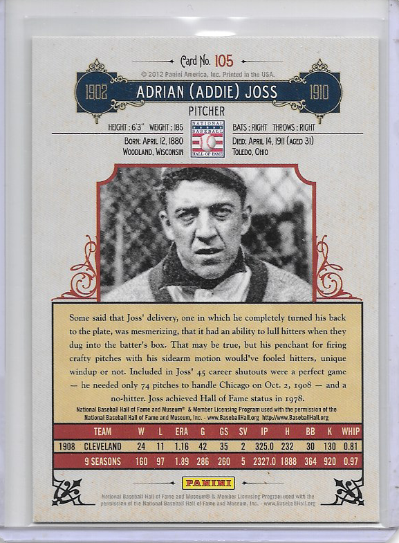 This Auction is for an authentic baseball card: 2012 Addie Joss Panini Cooperstown Card #105 Which is in NEAR MINT To MINT condition or better Shipping terms: Post can take up to 3 to 4 weeks to get to the United States from Canada Unfortunately this is out of my control with customs at the boarder Please be certain I ship always as fast as I can Here are the shipping costs: Canada : $2.75 USA: $3.00 (All prices in Canadian) I do combine shipping Combined Shipping For Americans buyers: Maximum 1 additional standard thickness(55 point) card=$2.75 for the 2 cards All c ombined orders that total under $99 = $14 total shipping (Tracking & Insurance) All c ombined orders that total over $99 but under $999 = $20 total shipping (Tracking & Insurance) All c ombined orders that total over $999 = contact for shipping shipping (Tracking & Insurance) Request an invoice please or pay the amount stated in your cart at checkout and we will refund the amount your overpaid to match the combined layout describe above. Combined Shipping For Canadians buyers: Please add 0.25$ for each additional card won, a ll combined orders over $25 Canadian or 200 grams in weight or 2cm in thickness will require Tracking and Insurance All c ombined orders that total over $25 but under $99 = $15 total shipping (Tracking & Insurance) All c ombined orders that total over $99 but under $999 = $20 total shipping (Tracking & Insurance) All c ombined orders that total over $999 = contact for shipping shipping (Tracking & Insurance) Request an invoice please or pay the amount stated in your cart at checkout and we will refund the amount your overpaid to match the combined layout describe above. If you do not agree with this terms please do not bid. Thanks for your time!