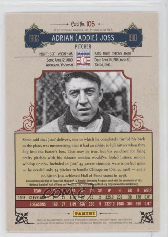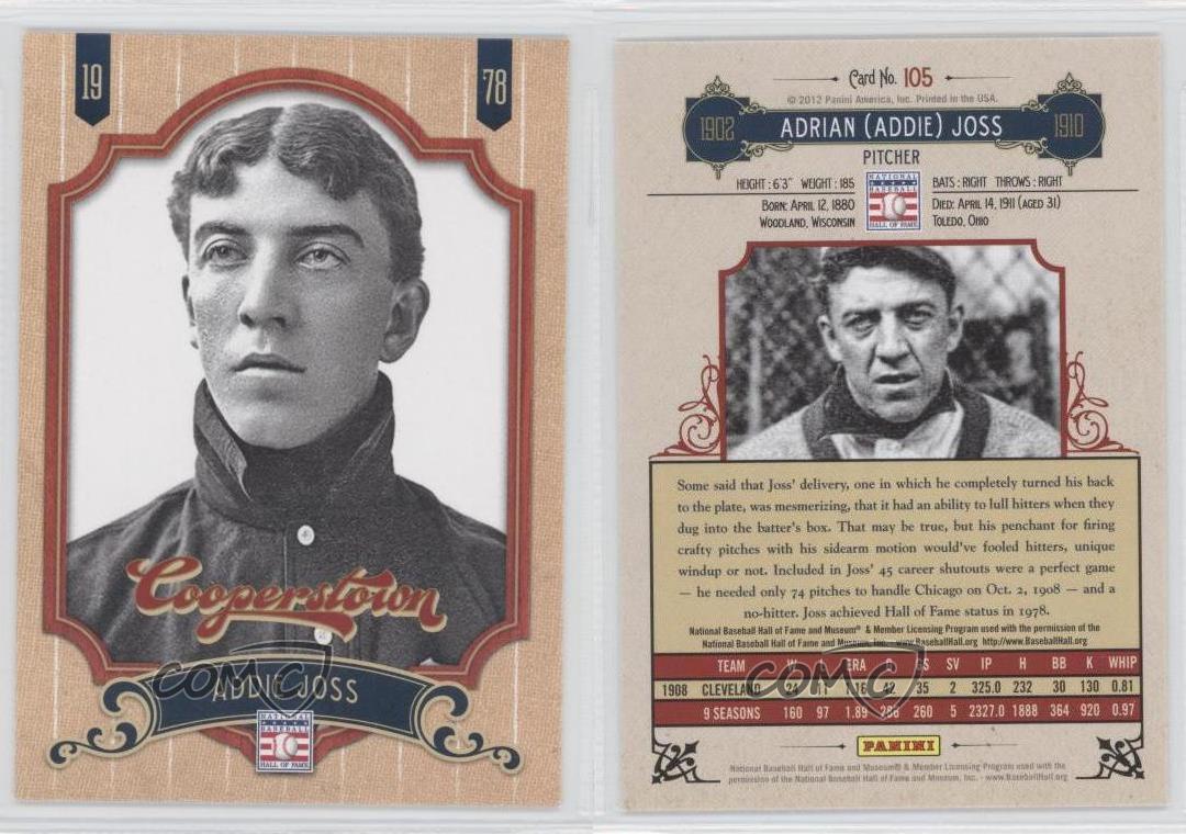 2012 Panini Cooperstown - [Base] #105 Addie Joss - Rookie - Baseball Card - Featuring the Cleveland Naps - Featuring Addie Joss Search for more: 2012 Panini Cooperstown Search for more: 2012 Panini Cooperstown - [Base] View all of our Listings Auctions Buy It Now About Us Located in the beautiful Pacific Northwest, COMC (Check Out My Cards) is the world's largest consignment service for trading card singles. More than 10,000 people have used our consignment service to list over 50 million trading cards. Find out how we can help you consign your items on eBay by contacting us through eBay messaging. COMC -- "The Safe & Easy Way to Buy & Sell" Representative Image - Select Specific Item above to see image of actual item Representative Image - Select Specific Item above to see image of actual item Raw Condition for Modern Cards Unless otherwise noted, raw modern cards are listed in Near Mint-Mint condition or better. A NM-MT card appears to be Mint at first glance, but upon closer inspection, may exhibit some of the following: minor print defects (e.g. roller marks, print line, dimple), minor scratches, slight edge wear, and slight corner wear. Centering is clearly visible in the images provided and does not factor into our condition assessment. Raw Condition for Vintage Cards Unless otherwise noted, raw vintage cards are listed in Excellent condition or better. An EX card may exhibit some of the following: minor rounding of corners, surface wear, print defects, light scratches, and slight edge wear/chipping. Centering is clearly visible in the images provided and does not factor into our condition assessment. Domestic Shipping Combined shipping for multiple items is available. To receive combined shipping, please ensure all desired items are in your eBay shopping cart before proceeding to checkout. eBay limits orders to 40 items per order. We automatically combine multiple orders placed on the same day. If you place multiple orders on the same day, please contact us to request a refund of applicable shipping costs. Signature confirmation may be required on invoices over $400. All cards are protected and shipped securely. International Shipping COMC offers eBay's International Shipping (EIS) for international orders under $2,500* (see country exceptions below). All duties and import fees are paid at checkout; in the rare event that there are additional import fees upon delivery, these are borne by the buyer. EIS packages route through a shipping hub in Erlanger, KY before shipping to their final destination. Please note that EIS does not allow for combined shipments. The shipping rates are determined by eBay and cannot be adjusted. *Maximum sale price exceptions: Colombia, Kuwait ($2,000); Taiwan ($1,539); Chile, Costa Rica, Guatemala, Honduras, Trinidad and Tobago ($1,000); Antigua and Barbuda, Aruba, Belize, Dominica, Grenada, Philippines, Saint Kitts and Nevis, Saint Lucia, Montserrat, Turks and Caicos Islands ($500); Dominican Republic, El Salvador ($200). Please request a shipping quote through eBay messaging for orders that exceed the maximum sale price supported by eBay's International Shipping. You will be responsible for all duties and import fees for international orders shipped outside the EIS. All cards are protected and shipped securely. Payment COMC does not accept offers on our cards through our eBay storefront. COMC utilizes eBay’s managed payments system. If you are experiencing difficulties making a payment, please contact eBay for assistance. Return Policy Returns are only accepted on the rare occasion the item is not as described. If you are making a return, please initiate the return process through eBay so a mailing label can be provided for you. Prior to listing, our expert team carefully assessed this item to represent it accurately. Please review the description and high-definition images prior to purchasing to ensure this item meets your satisfaction. We welcome you to contact us if you have further questions about this item. Trust and Integrity COMC carefully assesses each item consigned to us to prevent fraudulent items from entering the marketplace. If you believe an item offered on COMC may be fraudulent, please contact us with details so we can investigate the issue. Items we determine are outside our supported items policy may be removed. Last Modified: 3/18/2025 6:18:54 AM PDT