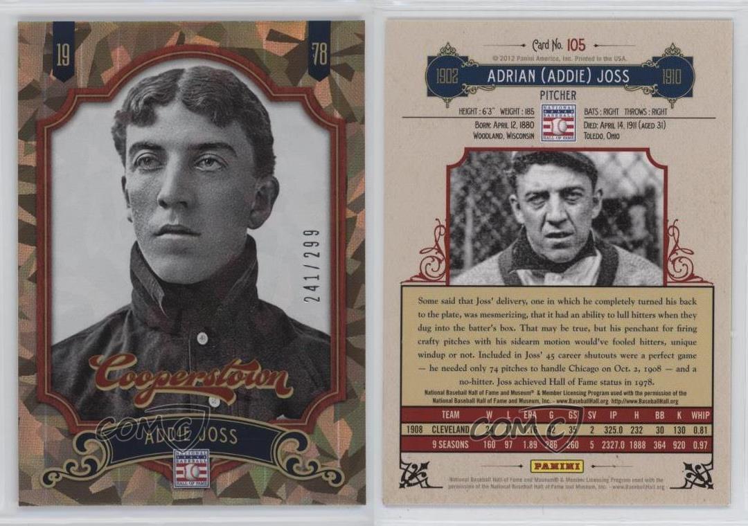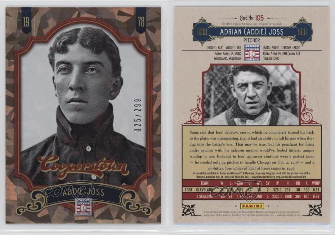 2012 Panini Cooperstown - [Base] - Crystal Collection #105 Addie Joss Qty Made: 299 - Rookie - Baseball Card - Featuring the Cleveland Naps - Featuring Addie Joss Search for more: 2012 Panini Cooperstown Search for more: 2012 Panini Cooperstown - [Base] - Crystal Collection View all of our Listings Auctions Buy It Now About Us Located in the beautiful Pacific Northwest, COMC (Check Out My Cards) is the world's largest consignment service for trading card singles. More than 10,000 people have used our consignment service to list over 50 million trading cards. Find out how we can help you consign your items on eBay by contacting us through eBay messaging. COMC -- "The Safe & Easy Way to Buy & Sell" Representative Image - Select Specific Item above to see image of actual item Representative Image - Select Specific Item above to see image of actual item Raw Condition for Modern Cards Unless otherwise noted, raw modern cards are listed in Near Mint-Mint condition or better. A NM-MT card appears to be Mint at first glance, but upon closer inspection, may exhibit some of the following: minor print defects (e.g. roller marks, print line, dimple), minor scratches, slight edge wear, and slight corner wear. Centering is clearly visible in the images provided and does not factor into our condition assessment. Raw Condition for Vintage Cards Unless otherwise noted, raw vintage cards are listed in Excellent condition or better. An EX card may exhibit some of the following: minor rounding of corners, surface wear, print defects, light scratches, and slight edge wear/chipping. Centering is clearly visible in the images provided and does not factor into our condition assessment. Domestic Shipping Combined shipping for multiple items is available. To receive combined shipping, please ensure all desired items are in your eBay shopping cart before proceeding to checkout. eBay limits orders to 40 items per order. We automatically combine multiple orders placed on the same day. If you place multiple orders on the same day, please contact us to request a refund of applicable shipping costs. Signature confirmation may be required on invoices over $400. All cards are protected and shipped securely. International Shipping COMC offers eBay's International Shipping (EIS) for international orders under $2,500* (see country exceptions below). All duties and import fees are paid at checkout; in the rare event that there are additional import fees upon delivery, these are borne by the buyer. EIS packages route through a shipping hub in Erlanger, KY before shipping to their final destination. Please note that EIS does not allow for combined shipments. The shipping rates are determined by eBay and cannot be adjusted. *Maximum sale price exceptions: Colombia, Kuwait ($2,000); Taiwan ($1,539); Chile, Costa Rica, Guatemala, Honduras, Trinidad and Tobago ($1,000); Antigua and Barbuda, Aruba, Belize, Dominica, Grenada, Philippines, Saint Kitts and Nevis, Saint Lucia, Montserrat, Turks and Caicos Islands ($500); Dominican Republic, El Salvador ($200). Please request a shipping quote through eBay messaging for orders that exceed the maximum sale price supported by eBay's International Shipping. You will be responsible for all duties and import fees for international orders shipped outside the EIS. All cards are protected and shipped securely. Payment COMC does not accept offers on our cards through our eBay storefront. COMC utilizes eBay’s managed payments system. If you are experiencing difficulties making a payment, please contact eBay for assistance. Return Policy Returns are only accepted on the rare occasion the item is not as described. If you are making a return, please initiate the return process through eBay so a mailing label can be provided for you. Prior to listing, our expert team carefully assessed this item to represent it accurately. Please review the description and high-definition images prior to purchasing to ensure this item meets your satisfaction. We welcome you to contact us if you have further questions about this item. Trust and Integrity COMC carefully assesses each item consigned to us to prevent fraudulent items from entering the marketplace. If you believe an item offered on COMC may be fraudulent, please contact us with details so we can investigate the issue. Items we determine are outside our supported items policy may be removed. Last Modified: 4/16/2025 7:45:33 PM PDT