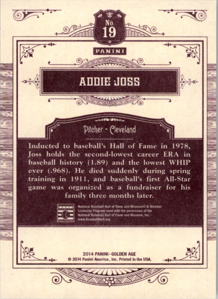 Check our other listings for more cards from this set as well as other great vintage, autographs, game used, rookie, star, short print and insert cards! WE WILL COMBINE SHIPPING! Order as many cards as you want and you will only be charged shipping on the first card! WE ARE CURRENTLY SHIPPING ALL ORDERS OUT WITHIN 24-48 HOURS! Shipping includes padded envelope and tracking number. WE SHIP WORLDWIDE! All orders shipped in padded envelopes with protection and USPS tracking. DJ's Sportscards is located in Renton, Wa. We have been a full time card store since 1988. 2014 Panini Golden Age #19 Addie Joss - NM-MT Front Back Sport: Baseball Set: 2014 Panini Golden Age Year: 2014 Item#: 19 Player: Adrian Joss Brand: Panini Golden Age Manufacturer: Panini Group Grading Company: Raw Grade SetType: Main Item Condition: Near Mint/Mint 2014 Beckett Collectibles, LLC. All Rights Reserved Powered by: Check our other listings for more cards from this set as well as other great vintage, autographs, game used, rookie, star, short print and insert cards! WE WILL COMBINE SHIPPING! Order as many cards as you want and you will only be charged shipping on the first card! WE ARE CURRENTLY SHIPPING ALL ORDERS OUT WITHIN 24-48 HOURS! Shipping includes padded envelope and tracking number. WE SHIP WORLDWIDE! All orders shipped in padded envelopes with protection and USPS tracking. DJ's Sportscards is located in Renton, Wa. We have been a full time card store since 1988.