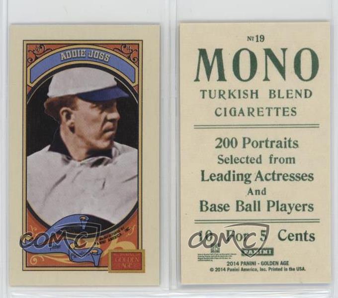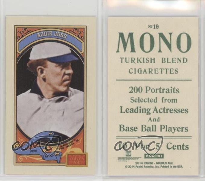 2014 Panini Golden Age - [Base] - Mini MONO Green Back #19 Addie Joss - Rookie - Baseball Card - Featuring the Cleveland Indians - Featuring Addie Joss Search for more: 2014 Panini Golden Age Search for more: 2014 Panini Golden Age - [Base] - Mini MONO Green Back View all of our Listings Auctions Buy It Now About Us Located in the beautiful Pacific Northwest, COMC (Check Out My Cards) is the world's largest consignment service for trading card singles. More than 10,000 people have used our consignment service to list over 50 million trading cards. Find out how we can help you consign your items on eBay by contacting us through eBay messaging. COMC -- "The Safe & Easy Way to Buy & Sell" Representative Image - Select Specific Item above to see image of actual item Representative Image - Select Specific Item above to see image of actual item Raw Condition for Modern Cards Unless otherwise noted, raw modern cards are listed in Near Mint-Mint condition or better. A NM-MT card appears to be Mint at first glance, but upon closer inspection, may exhibit some of the following: minor print defects (e.g. roller marks, print line, dimple), minor scratches, slight edge wear, and slight corner wear. Centering is clearly visible in the images provided and does not factor into our condition assessment. Raw Condition for Vintage Cards Unless otherwise noted, raw vintage cards are listed in Excellent condition or better. An EX card may exhibit some of the following: minor rounding of corners, surface wear, print defects, light scratches, and slight edge wear/chipping. Centering is clearly visible in the images provided and does not factor into our condition assessment. Domestic Shipping Combined shipping for multiple items is available. To receive combined shipping, please ensure all desired items are in your eBay shopping cart before proceeding to checkout. eBay limits orders to 40 items per order. We automatically combine multiple orders placed on the same day. If you place multiple orders on the same day, please contact us to request a refund of applicable shipping costs. Signature confirmation may be required on invoices over $400. All cards are protected and shipped securely. International Shipping COMC offers eBay's International Shipping (EIS) for international orders under $2,500* (see country exceptions below). All duties and import fees are paid at checkout; in the rare event that there are additional import fees upon delivery, these are borne by the buyer. EIS packages route through a shipping hub in Erlanger, KY before shipping to their final destination. Please note that EIS does not allow for combined shipments. The shipping rates are determined by eBay and cannot be adjusted. *Maximum sale price exceptions: Colombia, Kuwait ($2,000); Taiwan ($1,539); Chile, Costa Rica, Guatemala, Honduras, Trinidad and Tobago ($1,000); Antigua and Barbuda, Aruba, Belize, Dominica, Grenada, Philippines, Saint Kitts and Nevis, Saint Lucia, Montserrat, Turks and Caicos Islands ($500); Dominican Republic, El Salvador ($200). Please request a shipping quote through eBay messaging for orders that exceed the maximum sale price supported by eBay's International Shipping. You will be responsible for all duties and import fees for international orders shipped outside the EIS. All cards are protected and shipped securely. Payment COMC does not accept offers on our cards through our eBay storefront. COMC utilizes eBay’s managed payments system. If you are experiencing difficulties making a payment, please contact eBay for assistance. Return Policy Returns are only accepted on the rare occasion the item is not as described. If you are making a return, please initiate the return process through eBay so a mailing label can be provided for you. Prior to listing, our expert team carefully assessed this item to represent it accurately. Please review the description and high-definition images prior to purchasing to ensure this item meets your satisfaction. We welcome you to contact us if you have further questions about this item. Trust and Integrity COMC carefully assesses each item consigned to us to prevent fraudulent items from entering the marketplace. If you believe an item offered on COMC may be fraudulent, please contact us with details so we can investigate the issue. Items we determine are outside our supported items policy may be removed. Last Modified: 5/31/2025 1:41:58 AM PDT
