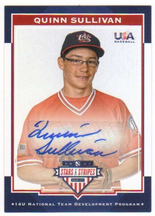 2017 Panini Stars and Stripes 14U National Team Signatures AUTO /399 #22 Quinn Sullivan Bleacher Seats Card Profile Year / Season - 2017 Manufacturer - Panini Brand Name - Stars and Stripes Sub Set - 14U National Team Signatures Card Number - 22 Player - Quinn Sullivan Team - USA Baseball 14U National Team Development Program Serial Numbered Numbered to only /399 Card Type - Autograph This base card is number 22 from the 14U National Team Signatures set from 2017 Panini Stars and Stripes Baseball. You can find more Quinn Sullivan or USA Baseball 14U National Team Development Program cards in our ebay store. Visit Our Store - Browse Our Full Inventory Find More 2017 Baseball Cards Here! * All Cards at Bleacher Seats Collectibles are verified to be of NRMT-MT condition or better. Product: Single-Insert Player: Quinn Sullivan Team: USA Baseball 14U National Team Development Program Season: 2017 Era: Modern (1981-Now) Card Manufacturer: Panini Brand: Panini Stars and Stripes Series: Stars and Stripes Set: 14U National Team Signatures Card Number: 22 Print Run: 399 Card Attributes: Serial Numbered,Autograph Need Supplies? We Carry Everything! 100,000's of cards In stock now! Purchase Multiple Cards, One Low Rate Covers Your Entire Order Trading cards only, all cards must be combined and paid for on a single order to qualify for Flat Rate Shipping . IMPORTANT! During checkout be sure that you have the same shipping service selected for all of your cards (Economy, Standard, etc.) Doing so will ensure that you are charged the Flat Rate and all cards will ship together. If multiple payments are sent or different shipping services are selected during checkout, orders will be split and shipped separately. We ship Worldwide, please see International Rates below. CHEAPEST! Economy Shipping ($0.99) Additional cards ship free if purchased on the same order. Orders are sent economically. Single Card orders of 1-2 cards will be shipped securely within semi-rigid holders and mailed within a plain envelope. Large orders will be upgraded free of charge. Economy shipping is not available for higher value cards, super thick or jersey cards, team sets, or player lots. (Most orders arrive in 5-7 business days) FASTER-SAFER! Standard Bubble Mailer Shipping - ($2.99) Additional cards ship free if purchased on the same order. Orders are packaged with extreme care. Cards will arrive within a soft sleeves and toploaders. Orders are shipped in bubble cushioned mailers for extreme protection via USPS First Class Package Service and online tracking will be provided. (Most orders arrive in 3-5 business days.) INTERNATIONAL Canada ($2.49), Worldwide ($2.99) For Interntional Orders Only, Additional Single Cards are $0.25 each, Team Sets and Multi-Card lots are $0.75 each Your first stop for new release trading card singles on the web. We are the most diverse case breaker on Ebay or anywhere else on the web. Breaking cases of every new set across all major sports as well as many non-sport and even more obscure releases. We also stock a full line of collecting supplies for collectors of all types, as well as novelty and gift items for special occasions. Whether you're looking to have fun just getting in (or back into) the hobby, or you're the extreme collector looking for constant everyday value and hard to come by gems, be sure to check us out first.