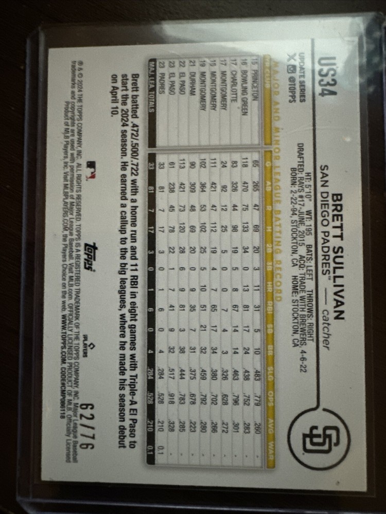 Capture a piece of baseball history with the 2024 Topps Update Series Stars and Stripes card featuring Brett Sullivan of the San Diego Padres. With its limited print run of just 76, this card is a unique collector's item for fans and card enthusiasts alike. The card, numbered US34, showcases the promising talent of Brett Sullivan in the iconic stars and stripes parallel/variety design that is always a crowd-pleaser. As part of the Major League Baseball (MLB) memorabilia, this sports trading card is a must-have for your collection. Manufactured by Topps, known for their quality and attention to detail, this card from the 2024 season is a great way to commemorate the game and its players. Whether you're a die-hard fan of the Padres or a dedicated collector of rare sports cards, this exclusive piece is an impressive addition to any collection.