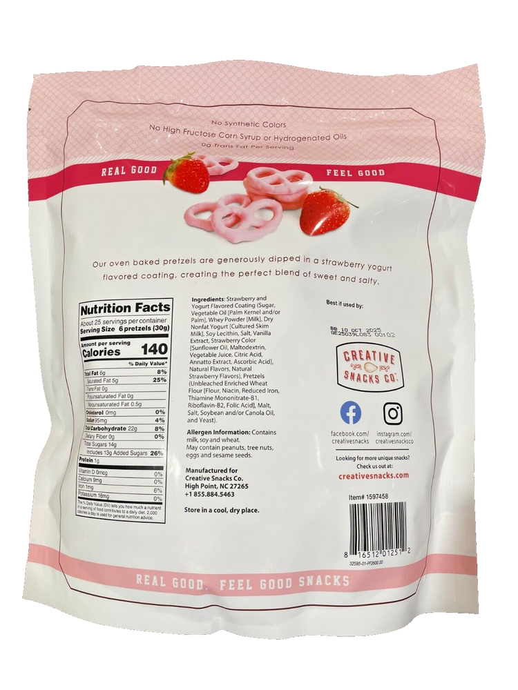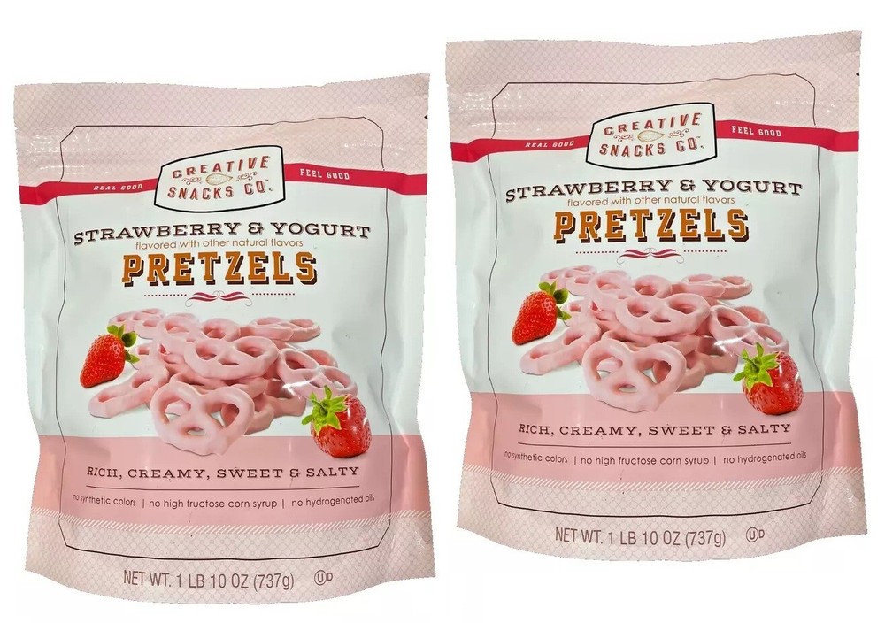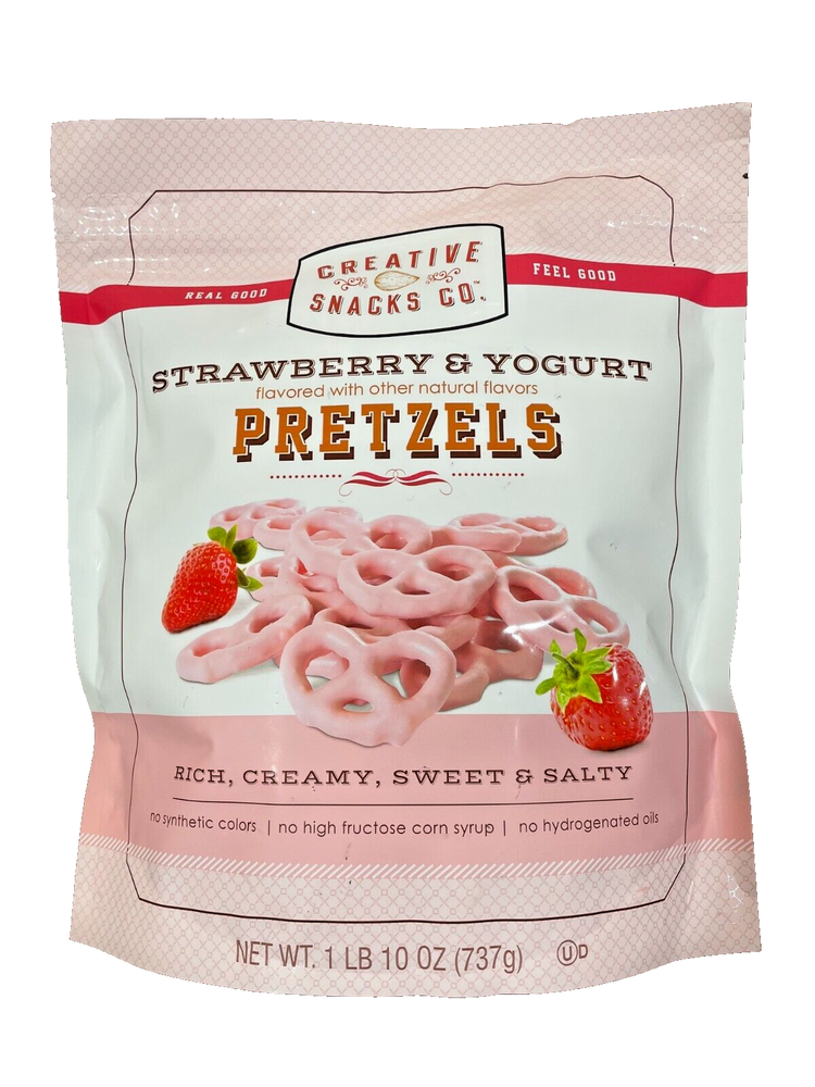 2 bags Creative Snacks Co Strawberry & Yogurt Pretzels 1 LB 10 Oz (737 g) each Rich, Creamy, Sweet & Salty Creative Snacks Strawberry & Yogurt pretzels are oven baked and generously dipped in naturally flavored strawberry yogurt coating. No artificial flavors, synthetic color, no high fructose corn syrup or hydrogenated oils, 0 trans fat. Allergen: contains milk, soy, and wheat.