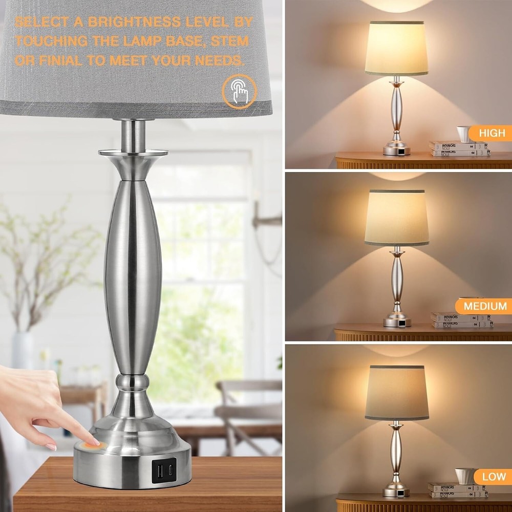 Finish Type Brushed Base Material Metal Bulb Base E26 Product Dimensions 11"D x 11"W x 22.5"H Lamp Type Table Lamp About this item 【Touch Control & 3 Way Dimmable】This lamps for bedrooms set of 2 controls the brightness with a high-quality metal body and comes in 3 Way Dimmable: Low, Medium and High(30%, 65% and 100%). No more struggling around at night to find the switch for your bedside lamps set of 2, just touch the table lamps body, you can choose different modes to create different atmospheres to meet your daily needs. 【Upgraded USB C & USB A】This table lamps for living room set of 2 is designed with a USB-C charging port (5V/2.1A) and a USB-A port on the base of nightstand lamps, you can charge four devices at a time, perfect for charging phone, kindles, pad, watche, humidifiers and other electric devices. The usb port works whether the end table lamps are on or off. 【Two E26 LED Bulbs Included】No need to buy table lamp for bedroom bulbs separately. To perfectly match the 3 Way Dimmable table lamps for living room set of 2, we have specially prepared LED bulbs. Our bedside table lamp has no flicker, no glare, no sound when using it. Low light helps you fall asleep easily. Medium light provides the friendliest light for your eyes as you read. High light allows you to focus on your work. 【Widely Application】Our desk lamp is made of sturdy brushed nickel metal base and high quality grey linen fabric shade. It's elegant enough to be perfect your modern, minimal or vintage home decor. You can place this table lamp for bedroom anywhere you want to be illuminated, such as living room, guest room, family room, spare room, nursery, apartment, bedroom nightstand, sofa table, coffee table, minimalist style condo and more. 【Easy Installation】The installation of this touch lamps for bedrooms is very simple, just 4 steps to get a beautiful bedroom lamp in no time. At the same time, we are committed to providing our customers with an excellent buying experience. If you have any questions about our table lamps, please contact us, we will provide you with the fastest and friendly service within 24 hours.