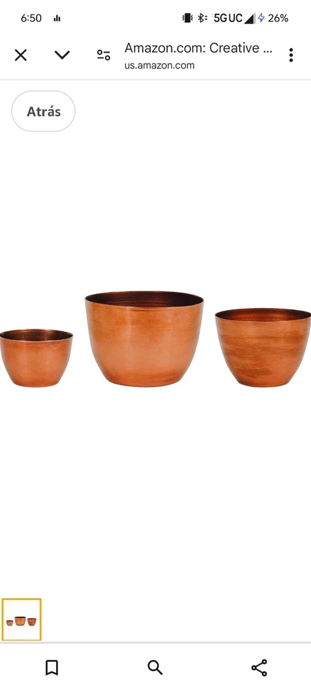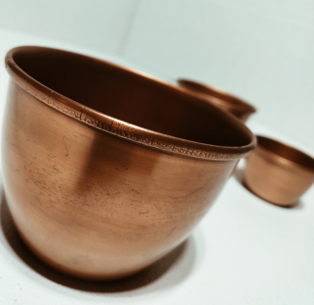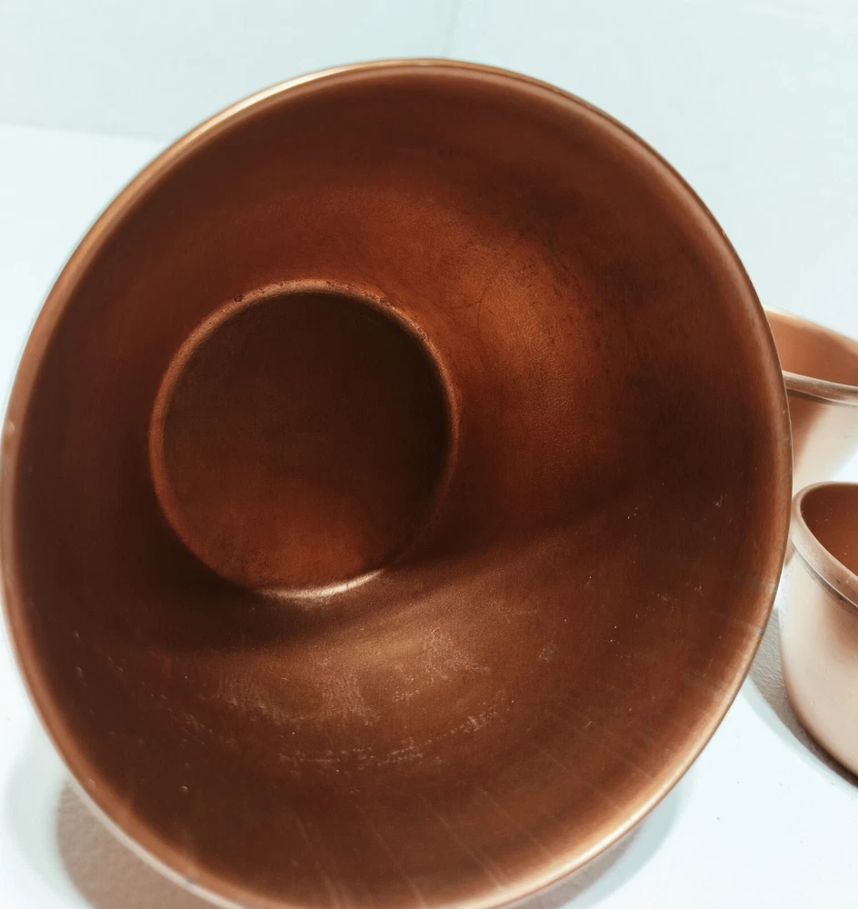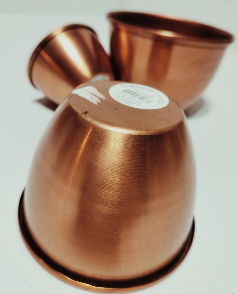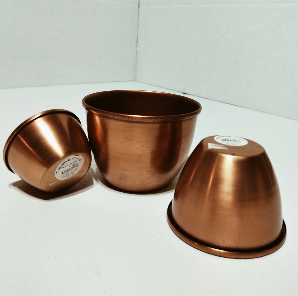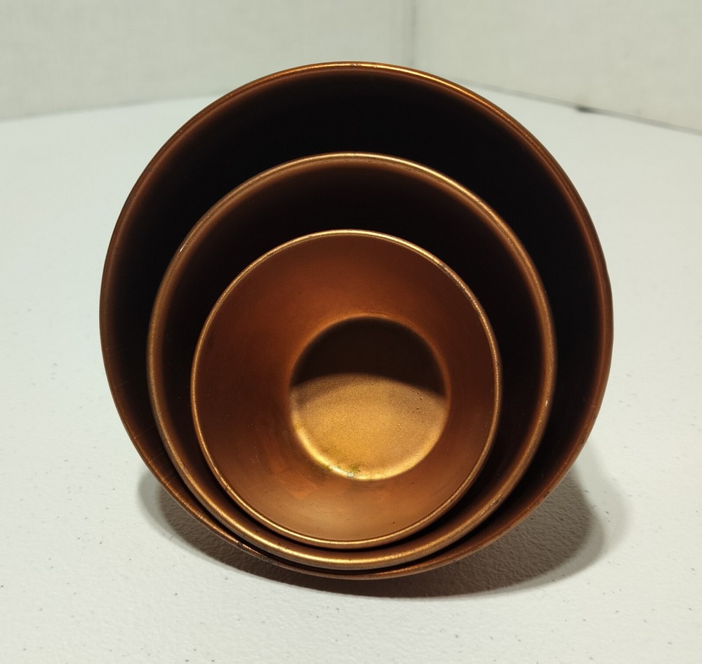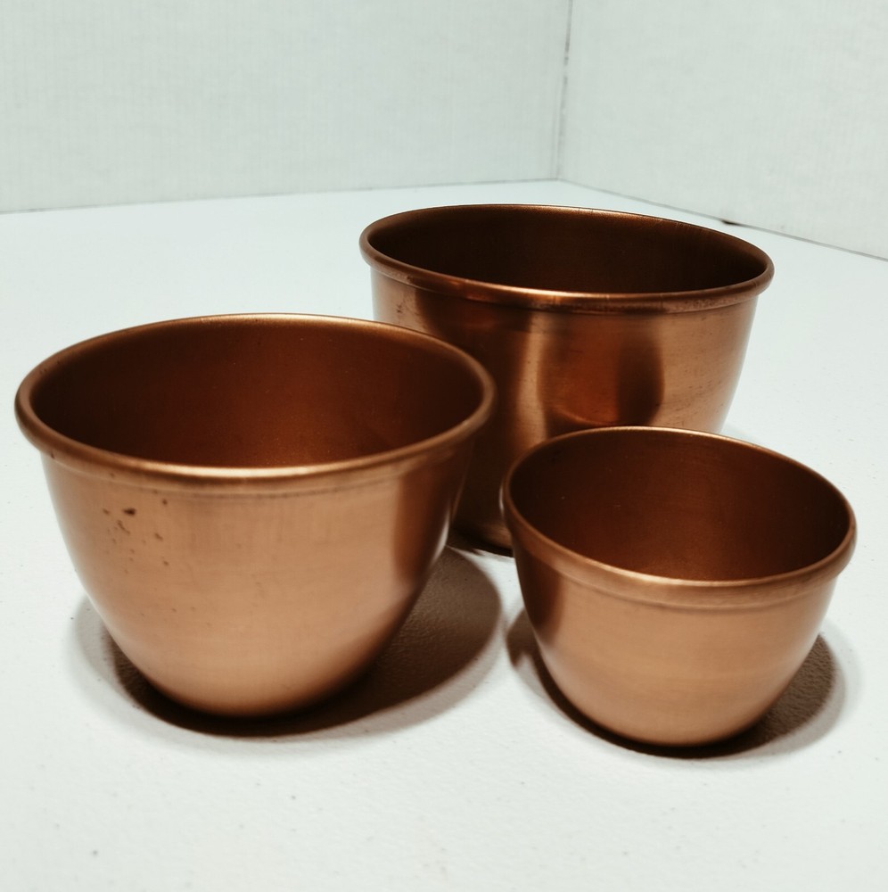 The Creative Co-Op Aluminum Copper Bowls Set includes three geometric-shaped bowls in varying sizes (5", 4", and 3" in diameter) made of durable aluminum with a copper finish. These art deco style bowls have a solid pattern and are designed for decorative purposes. Each bowl has a height of 3", 2.5", and 2" respectively, adding to their visual appeal. These original pieces are crafted in India and weigh approximately 0.13 oz. Perfect for adding a touch of sophistication to any space.