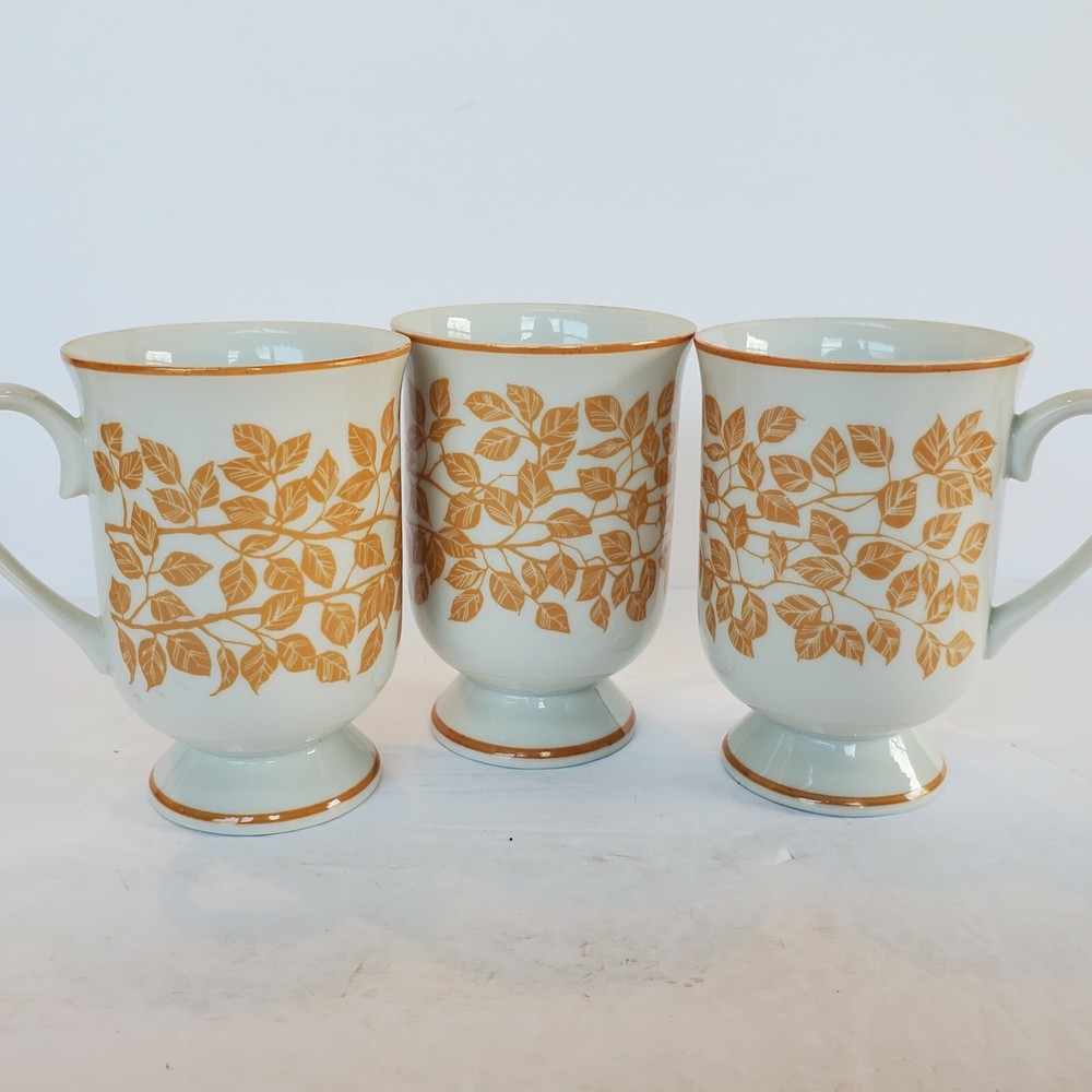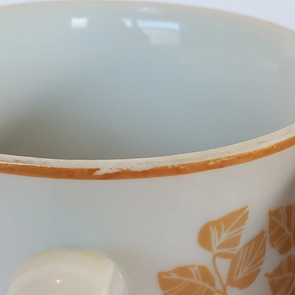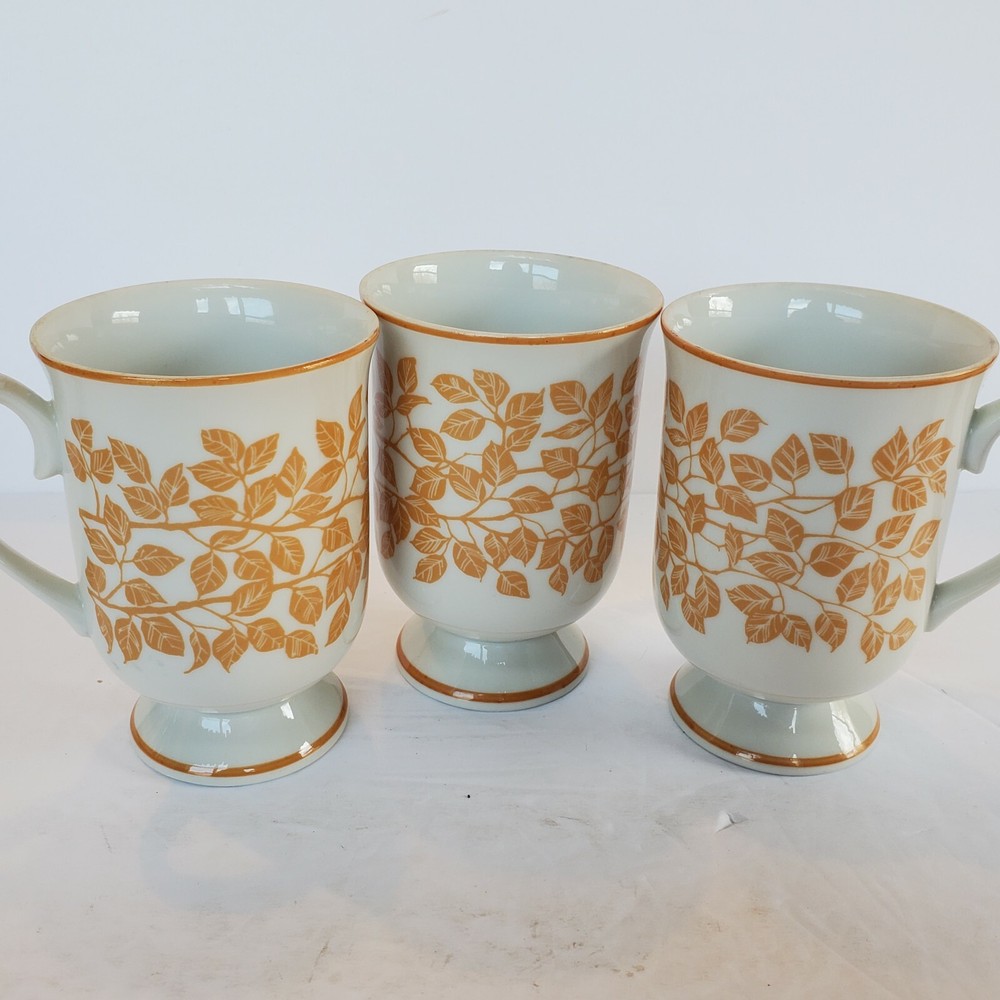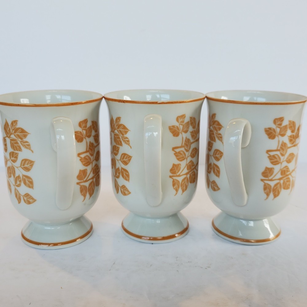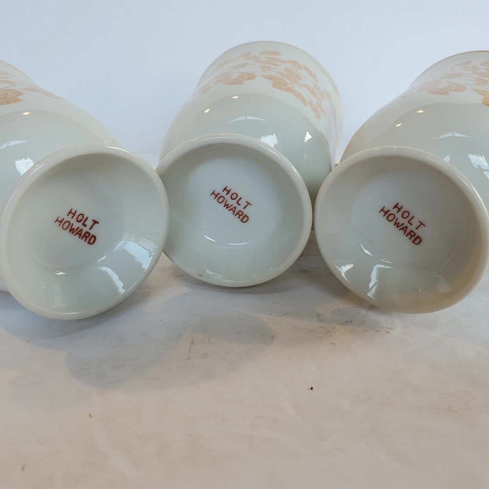 3 Holt Howard Pedestal Leaf Mugs Orange Mid Century Footed Vine Cups 1960s MCM Very popular orange color leaves and vines. Mid-Century Modern No chips or cracks. There is a 1/8" spot of paint inconsistency on the rim done during the manufacturing process. See the last picture. 4.5" Tall 3" Wide at Mouth