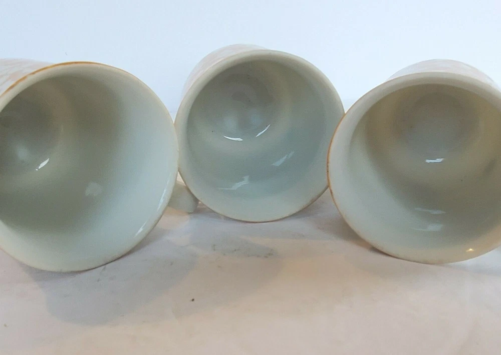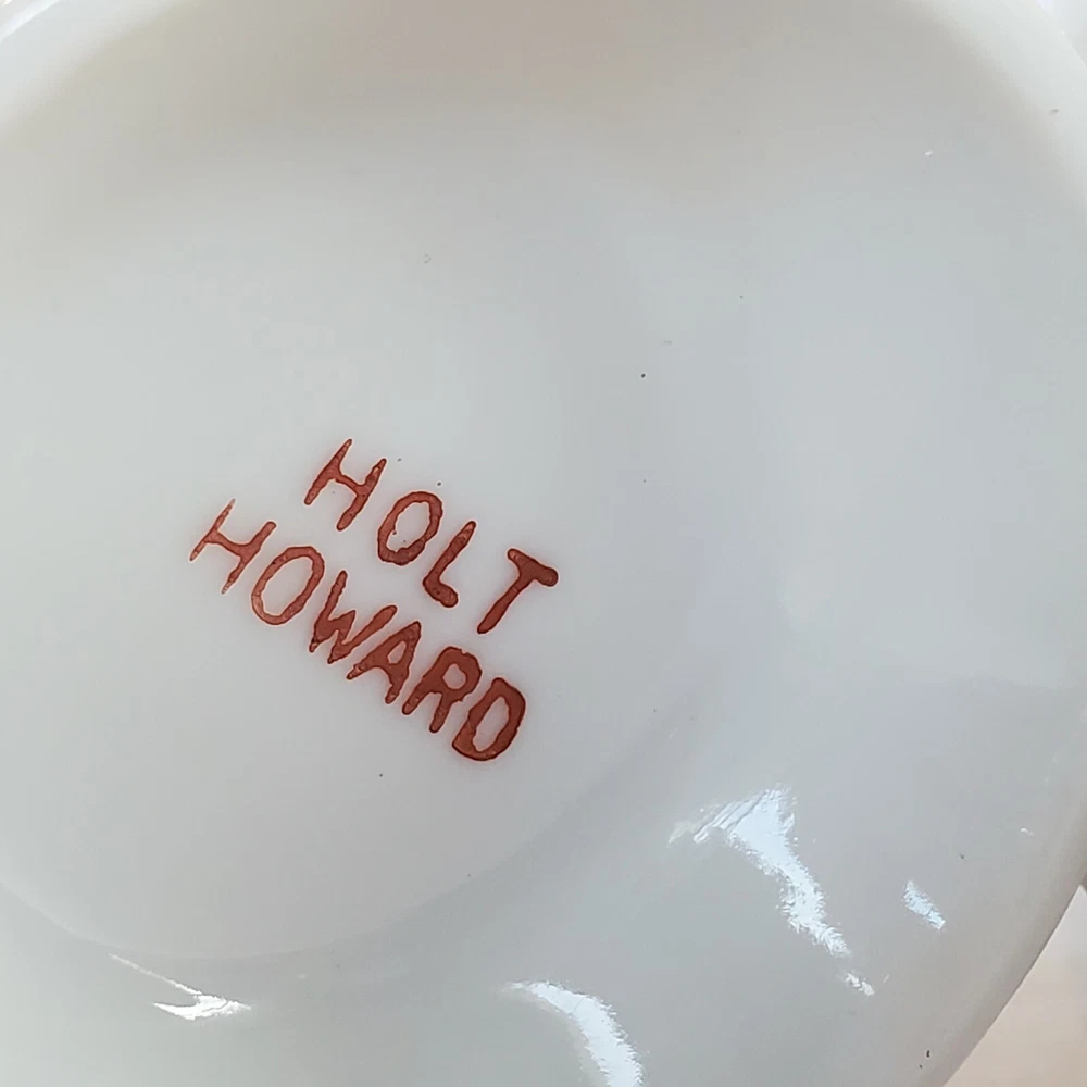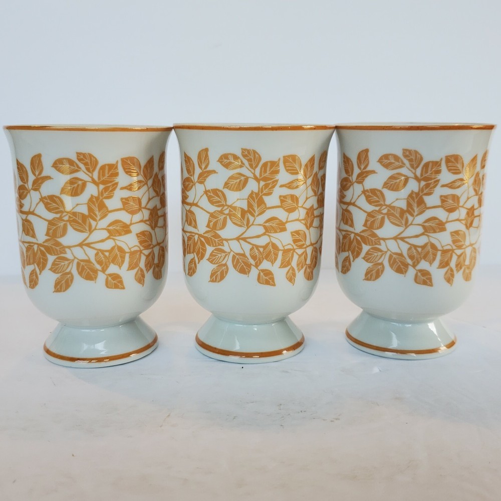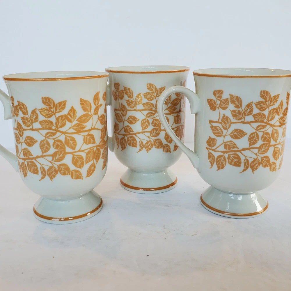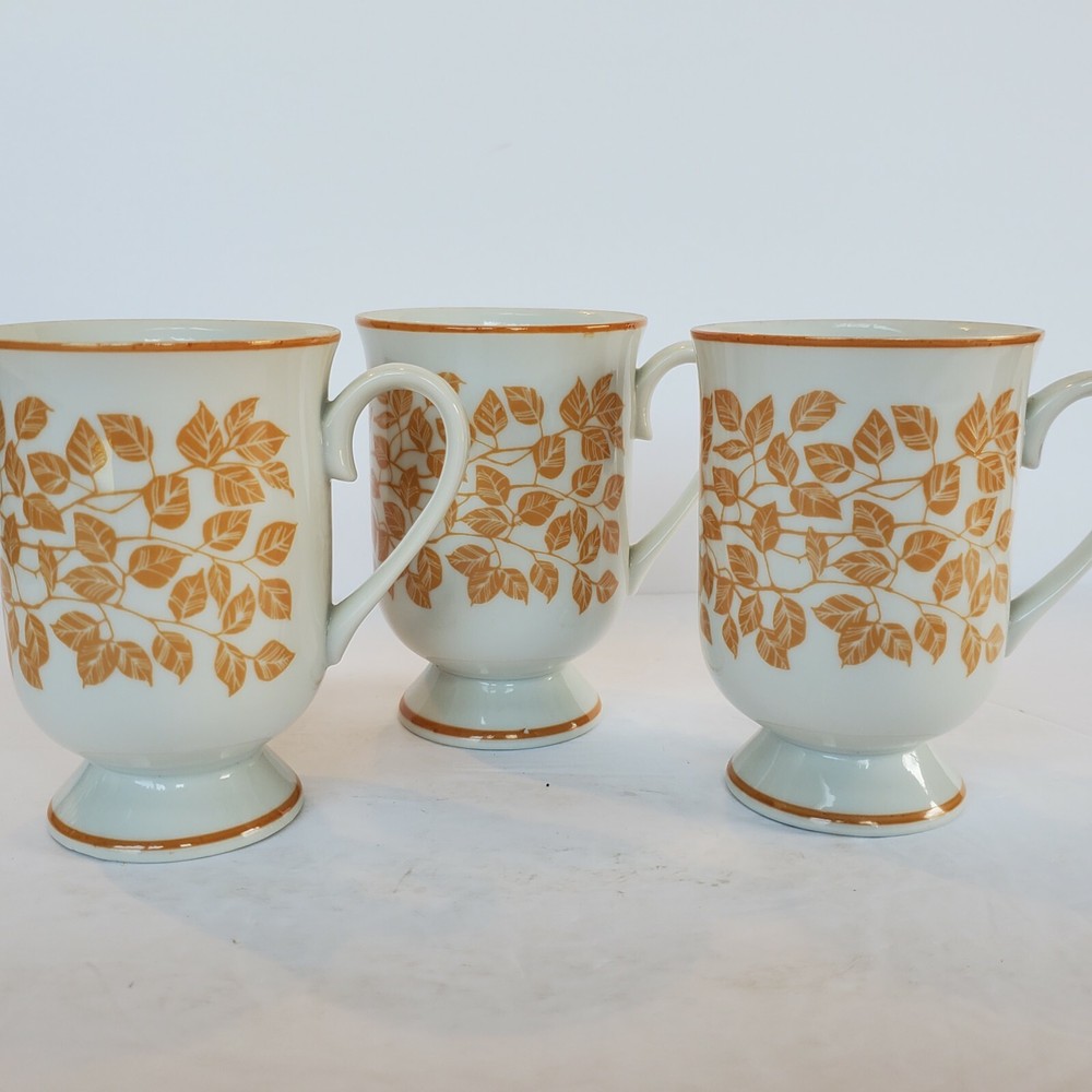 3 Holt Howard Pedestal Leaf Mugs Orange Mid Century Footed Vine Cups 1960s MCM Very popular orange color leaves and vines. Mid-Century Modern No chips or cracks. There is a 1/8" spot of paint inconsistency on the rim done during the manufacturing process. See the last picture. 4.5" Tall 3" Wide at Mouth