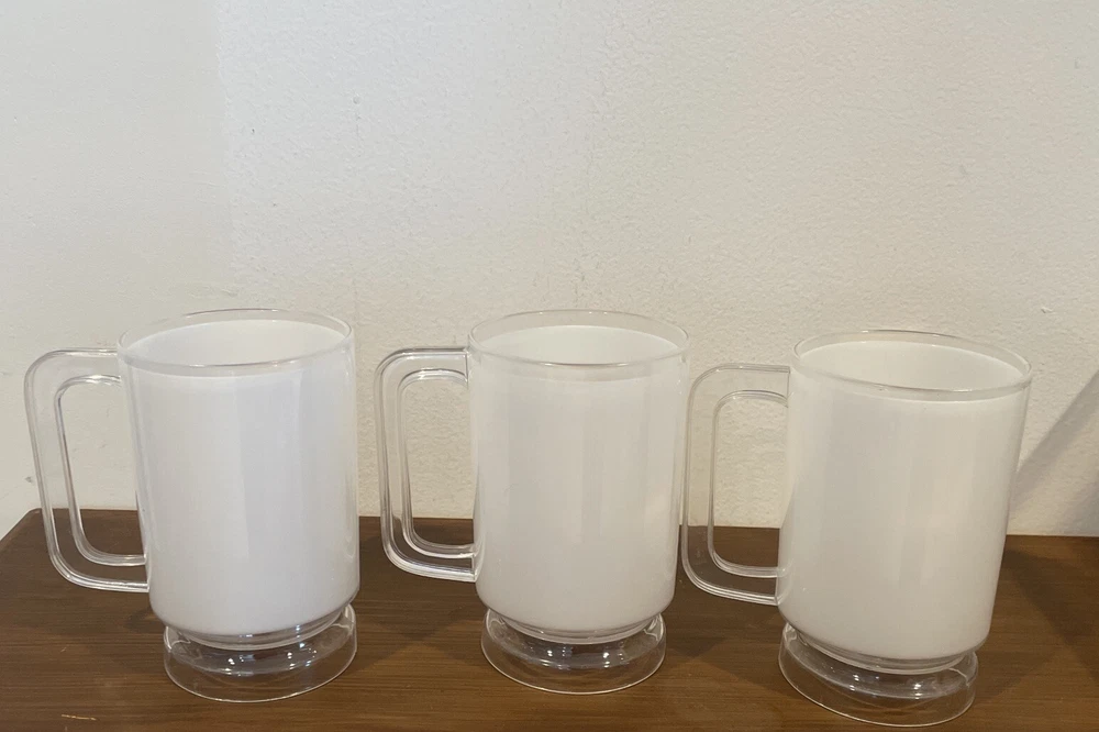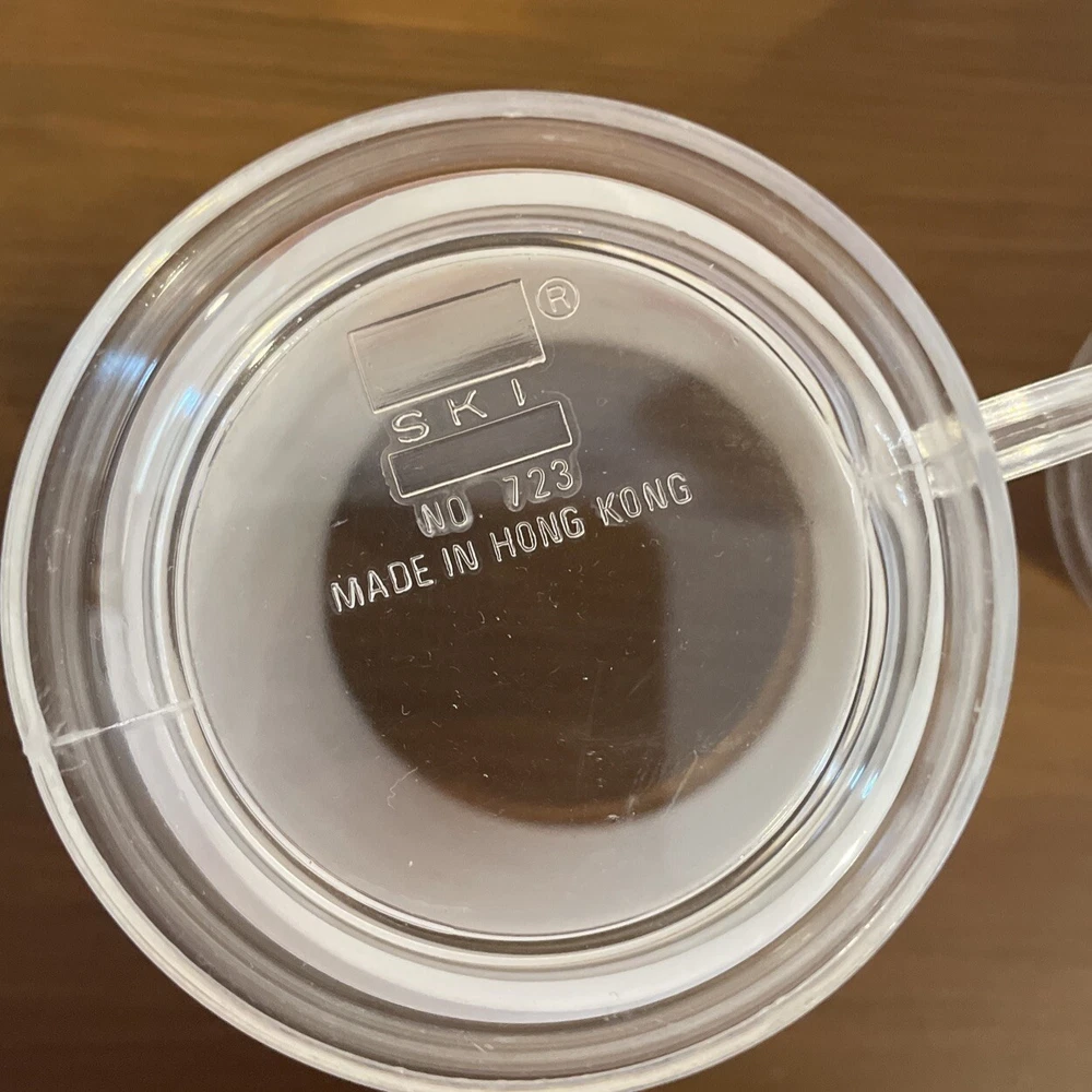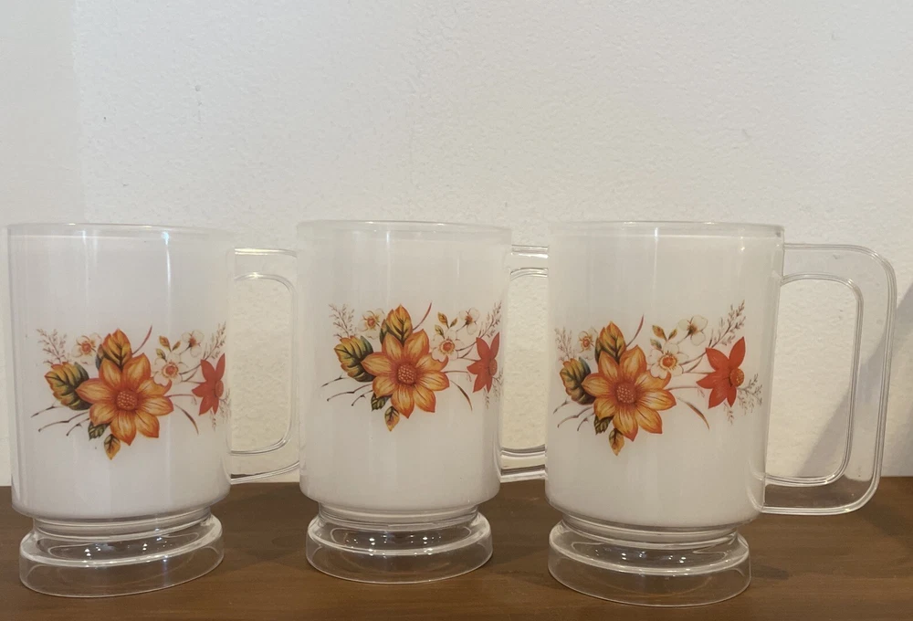 Transport yourself back to the 1960s with these delightful vintage plastic cups from SKI. The set includes three cups, each with a colorful floral pattern in white, orange, and yellow. These cups are perfect for hot or cold beverages and have a 12 oz capacity. With a mid-century modern style and a break/chip-resistant design, these cups are both functional and decorative. The cups are 5 inches tall and come with a handle for easy use. Add some retro charm to your home or office with these rare and collectible cups.