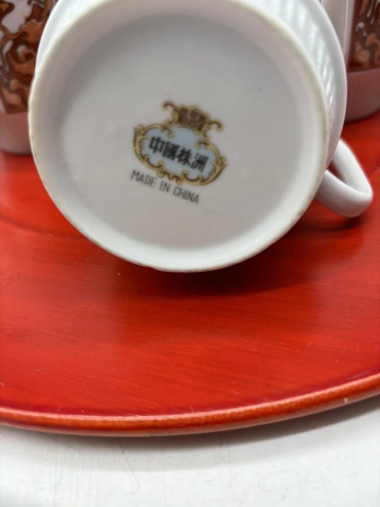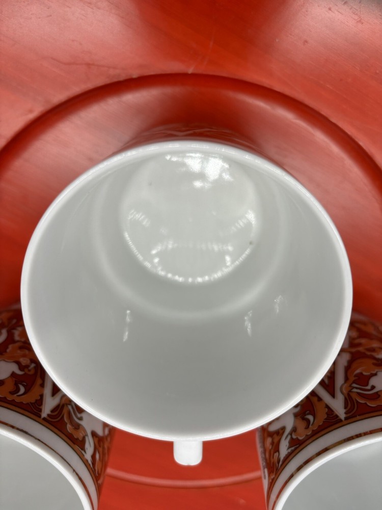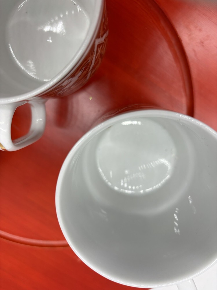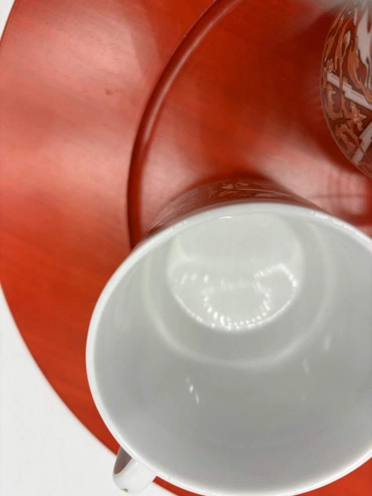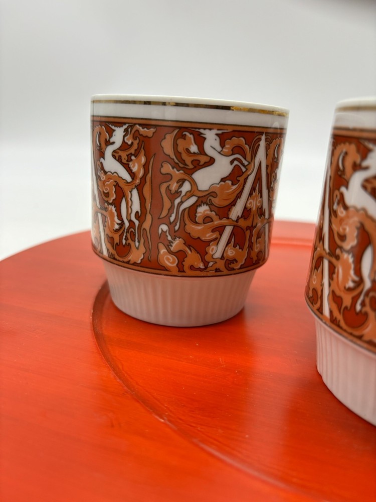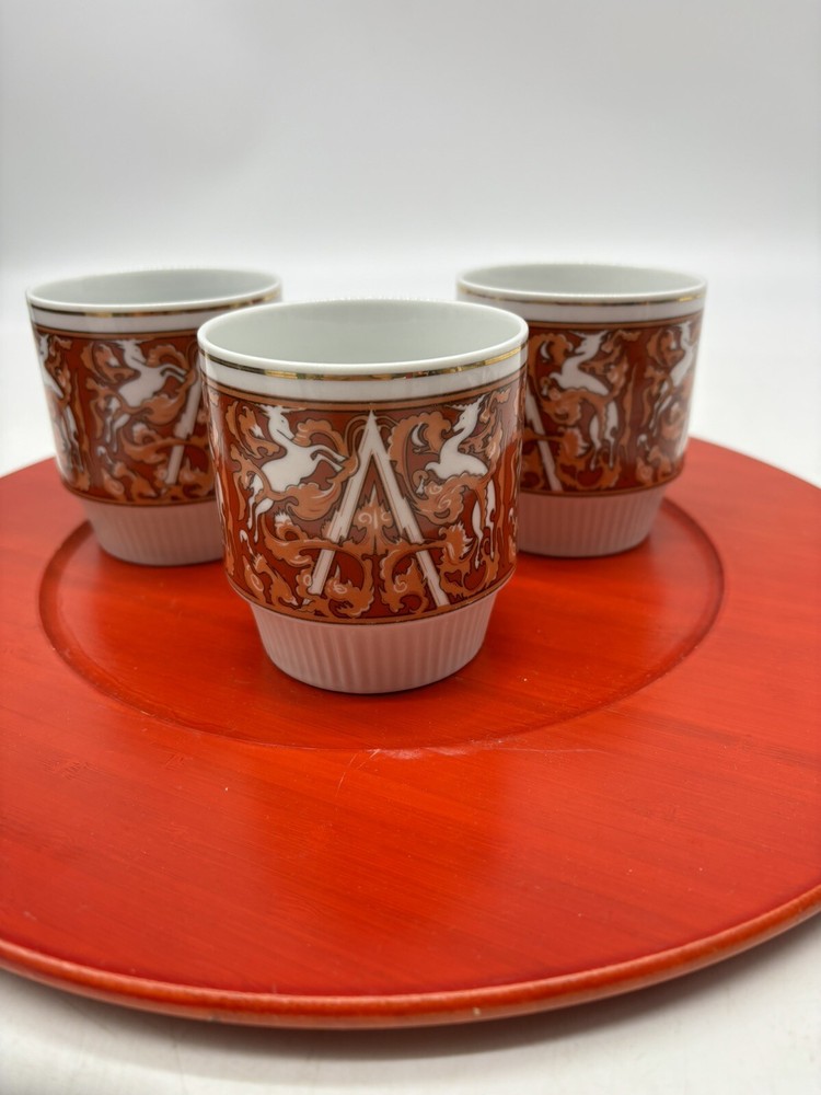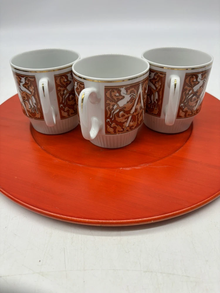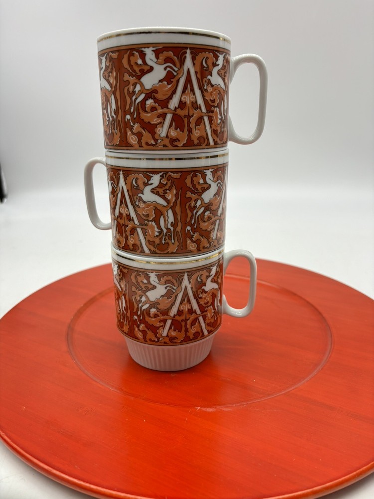 3 Unicorn Stacking Coffee Mugs, White & Orange, China Tapestry MCM Mid Century Gold trim at top and accent on handle No chips or cracks 2 business days shipping and handling Thanks for looking