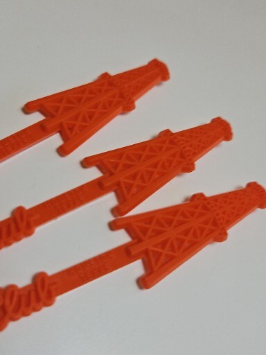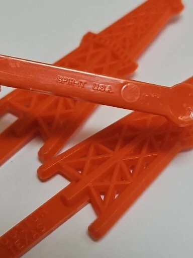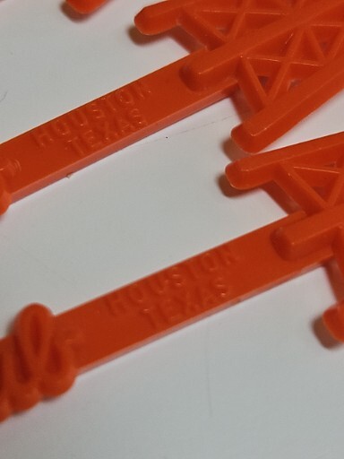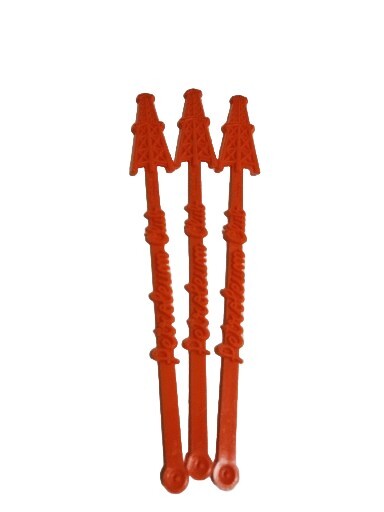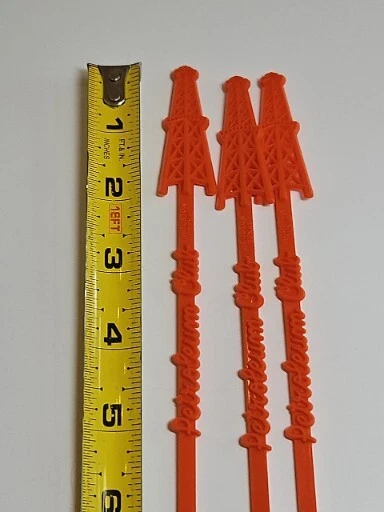 Spice up your barware collection with this vintage set of 3 swizzle sticks drink stirrers from the Houston Petroleum Club. The OILWELL pattern and orange color add a pop of color to any occasion, while the oil well shape and oil and gas theme bring a touch of uniqueness to your drinks. Made of lightweight and washable plastic, these original swizzle sticks are 6 inches in length.... Perfect for all occasions and handmade with great attention to detail, these Houston Texas Petroleum Club swizzle stirrer sticks are a must-have for any collector or lover of unique barware.