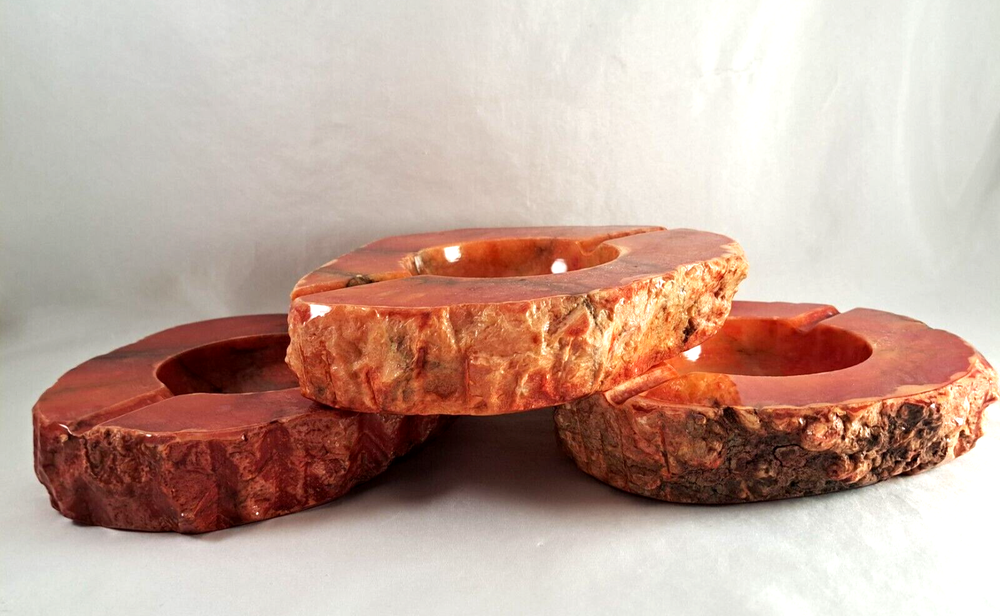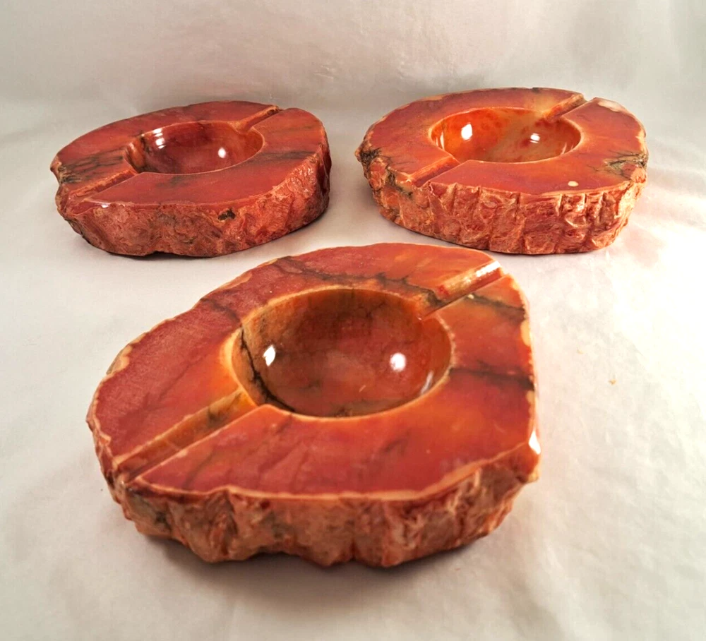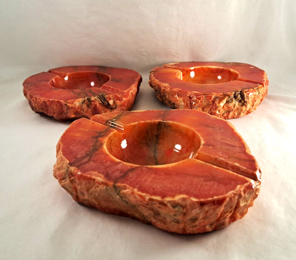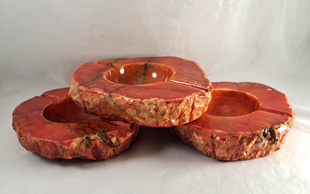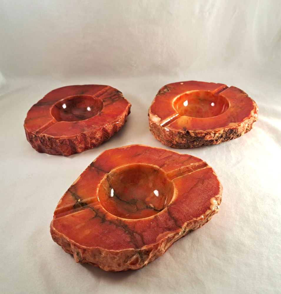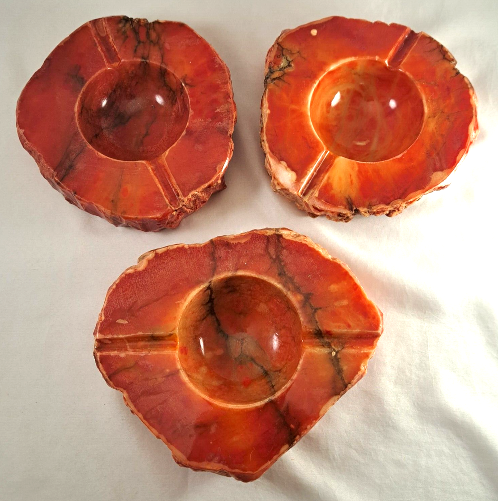 This is for a trio of vintage Italian alabaster ashtrays, done in a wonderful red orange color that's p erfect for the modernist home. Please be aware that these are not colorfast as some color leached out as I was removing tags. Avoid water and use a soft cloth to clean. Condition is very good with no chips or cracks; these have a shiny urethane top which is mostly intact. There are normal signs of use commensurate with age. Please view all pictures. Approx measurements: 7 1/2" x 7" x 1 3/4" high . Weight: 11 lbs prior to packing. RETURN POLICY: Returns are only accepted if the item is not as described. Contact me immediately if there’s an issue, so that we may resolve it quickly. Your positive feedback will be left once I receive yours, which lets me know that everything arrived to your satisfaction.