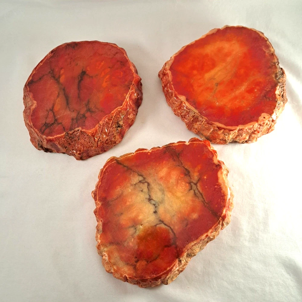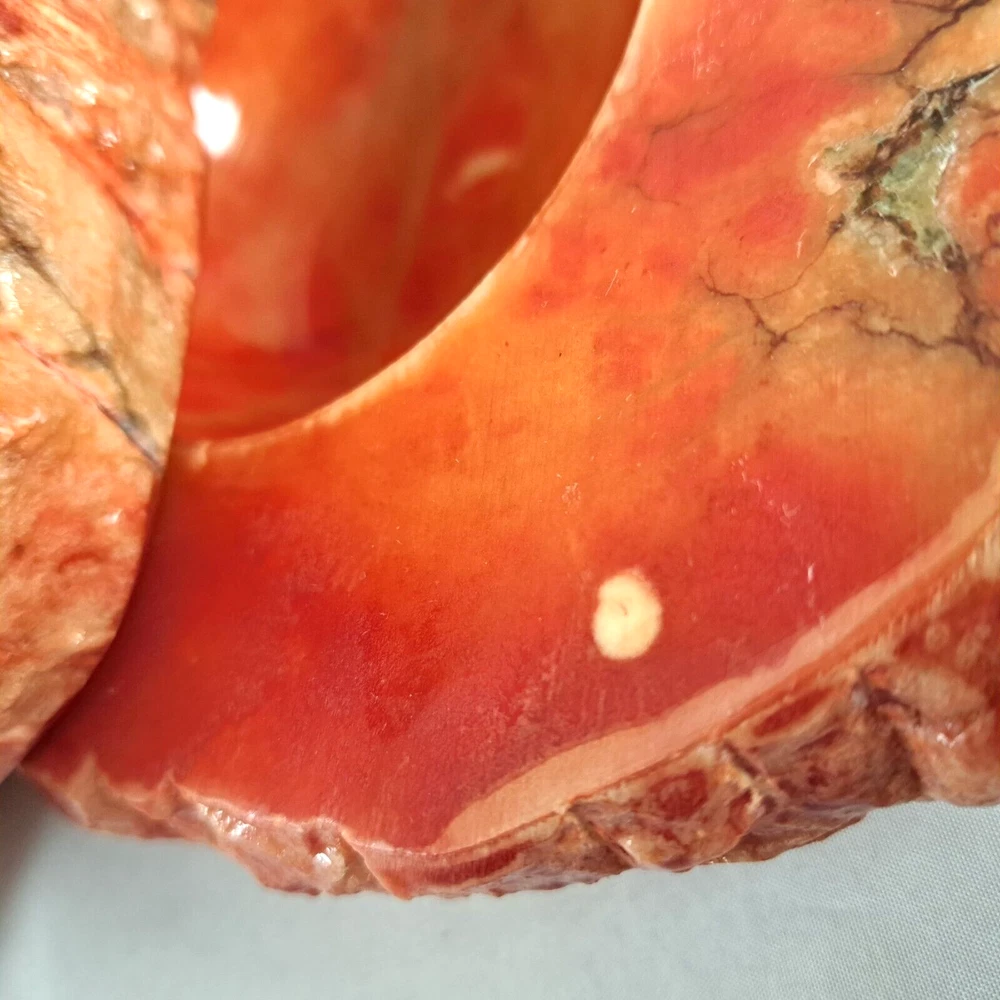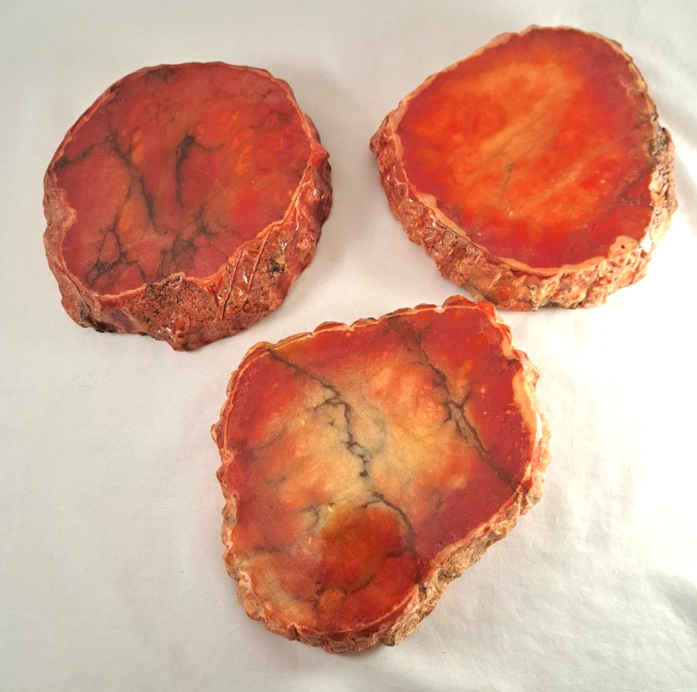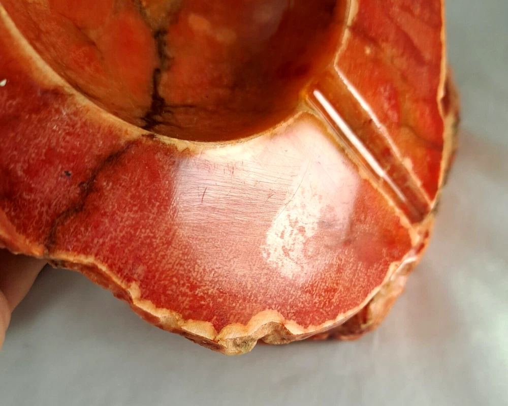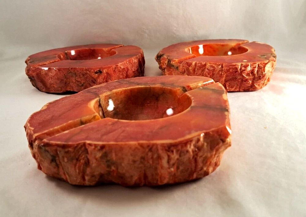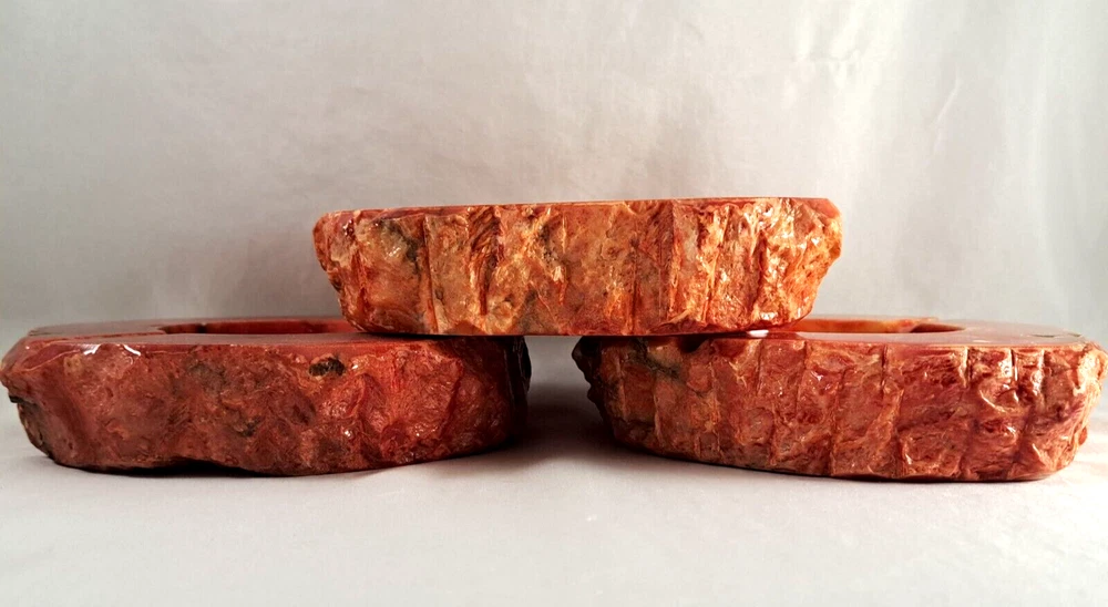 This is for a trio of vintage Italian alabaster ashtrays, done in a wonderful red orange color that's p erfect for the modernist home. Please be aware that these are not colorfast as some color leached out as I was removing tags. Avoid water and use a soft cloth to clean. Condition is very good with no chips or cracks; these have a shiny urethane top which is mostly intact. There are normal signs of use commensurate with age. Please view all pictures. Approx measurements: 7 1/2" x 7" x 1 3/4" high . Weight: 11 lbs prior to packing. RETURN POLICY: Returns are only accepted if the item is not as described. Contact me immediately if there’s an issue, so that we may resolve it quickly. Your positive feedback will be left once I receive yours, which lets me know that everything arrived to your satisfaction.