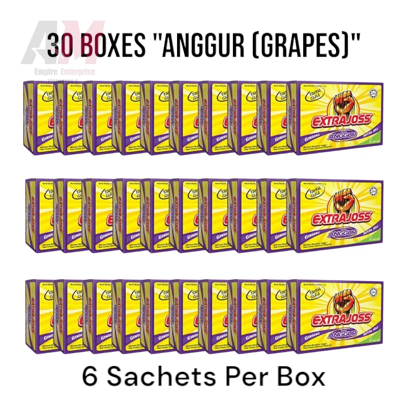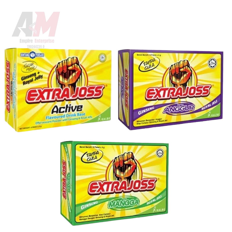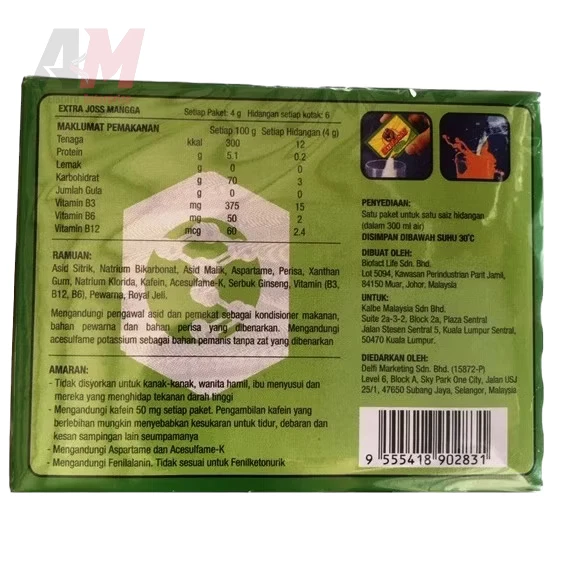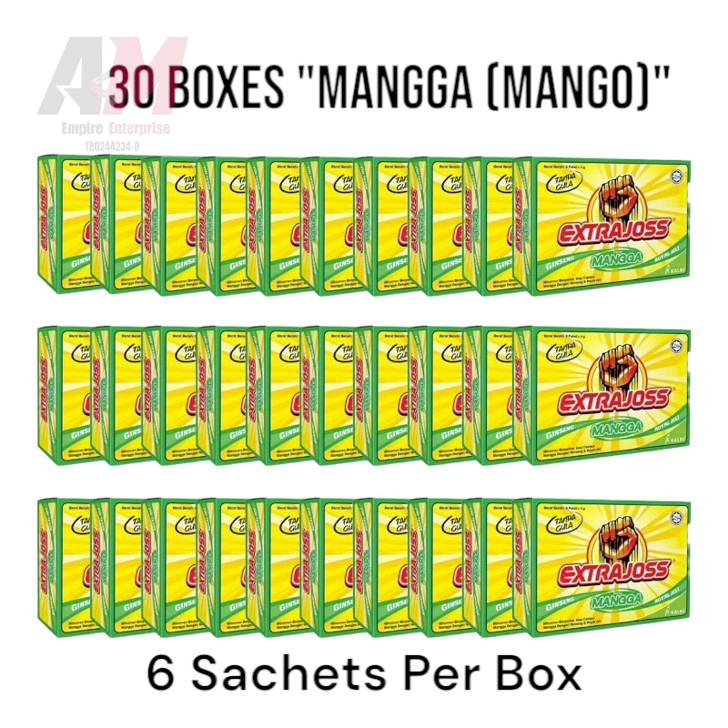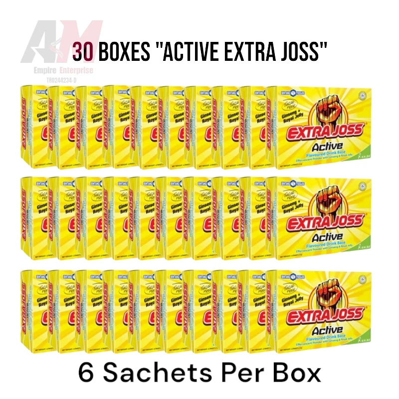 EXTRA JOSS - 30 Boxes Active Energy Drink Powder Ginseng/Grape/Mango Flavour (180 SACHETS) HALAL FREE SHIPPING Extra Joss ( Active, Grape, Mango) Product Description : 4 grams x 6 sachet x 30 boxes (180 sachets) Extra Joss is a refreshment drink that give fruity taste, with additional benefit of Power from Extra Joss endorsement Boost Body's Immune System Royal Jelly Helps Enhance Immune System With Vitamin B6,B9 and B12 Directions : Take and tear I sachet of Extra Joss Pour the powder in to glass Pour cold water (300 ml) to the glass The powder will dissolved immediately Serve it immediately while chilled Ingredients : Compositions: Grape, Mango & Extract 150 mg, Ginseng Extract 35 mg, Vitamin B11.5 mg /1.1 mg, Vitamin B6 2 mg,Vitamin B12 2.4 mcg/2.0 mcg, Taurine 100 mg, Caffeine 50 mg. Sugar, Aspartame, Citric Acid, Royal Jelly Caution : Not advisable for children below 12 years old and pregnant women. Storage Instruction : Store below 30°℃ Packaging : 30 boxes x (6 Sachets x 5.5 g) Nutritional Information (Per 100g) Energy: 295 cal Total Carbohydrate: 69 g Total Sugar: 0 g Protein: 4.9 g Fat: 0.9 g Vitamin B3: 375 mg- Vitamin B6: 50 mg-Vitamin B12: 60 mcg PAYMENT Only accept payment through PAYONEER. We will proceed to process your order after receiving a cleared payment to our PAYONEER account. IMPORT, DUTIES AND TAX INTERNATIONAL CUSTOMERS ARE RESPONSIBLE FOR ALL IMPORT/CUSTOMS/LOCAL TAX FEES THAT MAY BE INCURED UPON RECEIPT YOUR PACKAGE. International orders are subject to the receiving country's import fees, duty, taxes and/or brokerage fees. These funds are not paid to seller nor are they set by eBay rather they are paid to and set by your home country's government as per import/export regulations and charged by your local postal carrier. Funds are due upon receipt in accordance with your local import and postal regulations. SHIPPING Shipping rates will vary depending on the size of the item and on your country. We strive to keep our shipping rates as low as possible, and we offer greatly reduced shipping rates on multiple item orders. Please contact us if you have any plan to buy multiple items, as we would not able combine the shipping once the sales are final. We are operating on GMT+8 time that might be different on your time zone. All orders will be dispatched within 3 business days after receive cleared payment. There is no shipment on Saturday,Sunday and our Public holiday. International orders are shipped via Singpost (Quantium Solutions). This offers tracking and approximately 10-20 days in transit. Express shipment service available via DHL Express and FedEx. This offers tracking and approximately 4-7 days in transit. RETURNS Please take the time to do the research before committing to a purchase. We are unable to accept returns if you’re ordered the wrong items. We are open Monday thru Friday 9:00AM to 4:00PM GMT+8 time. If you have any issue regarding your purchase please contact us before leaving any feedback. We will try our best to solve the problem and provide amicable solution. FEEDBACK : PLEASE CONTACT US BEFORE LEAVE ANY NEGATIVE FEEDBACK! Our feedback rating is very important to our companies success. Please take the time to look at each sellers feedback and rating before buying a product. You will find that we work hard to maintain our positive feedback rating and will do the same for you.