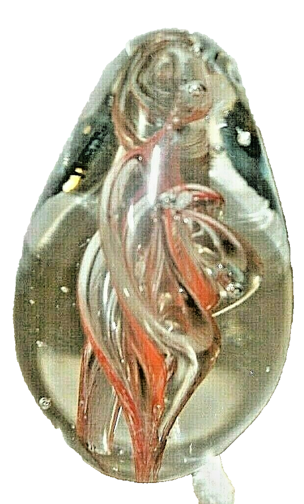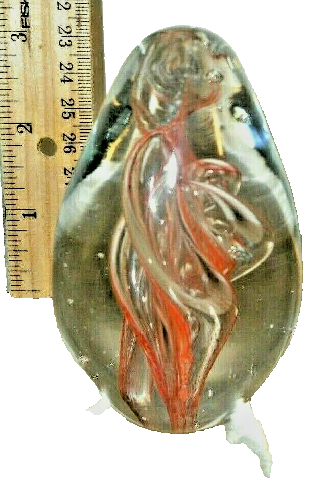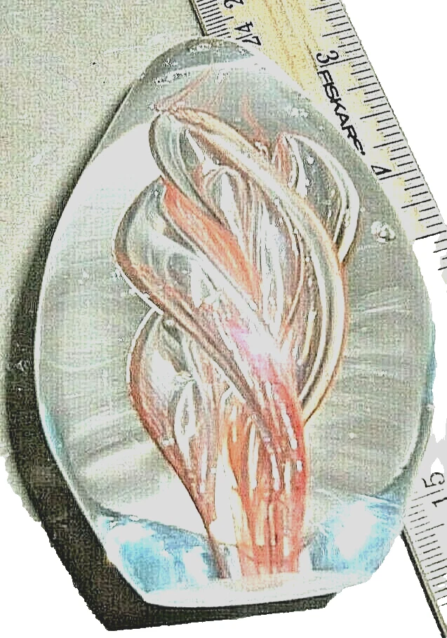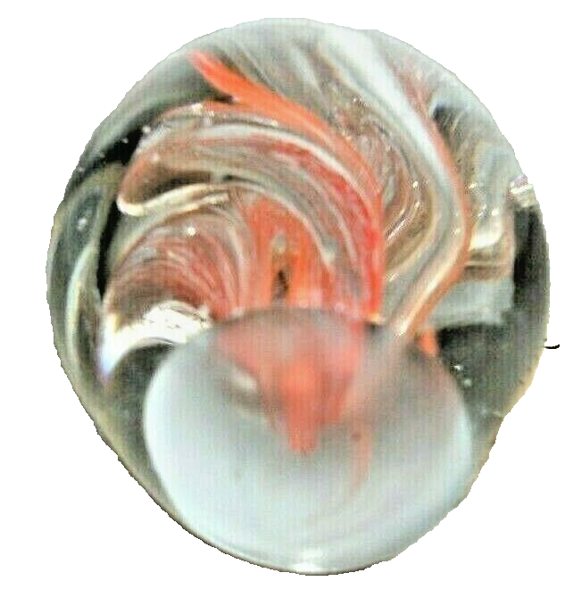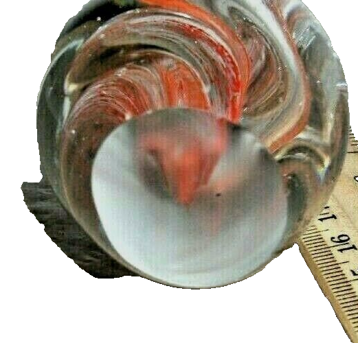 This auction is for a 3.5" glass paperweight. I don't know much about them, I buy them to sell and keep the ones I like. I bought a bunch at a thrift store that are all pretty similar. I can't keep them all, so I'm selling the ones I can't keep. This one is orange and clear glass swirl, with bubbles. No marks to indicate age or maker, no base or box. Not sure of age or maker.