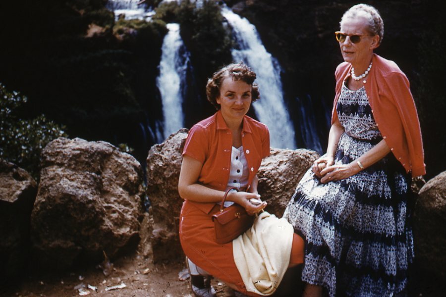 This vintage 35mm slide captures a stunning moment of women on a cliff with a breathtaking waterfall behind them. The vivid Kodachrome colors still pop with a warm orange border that screams 1950s charm. Some age-appropriate wear adds character, but the image remains sharp and full of nostalgia. A gorgeous piece of mid-century Americana perfect for collectors or decor!