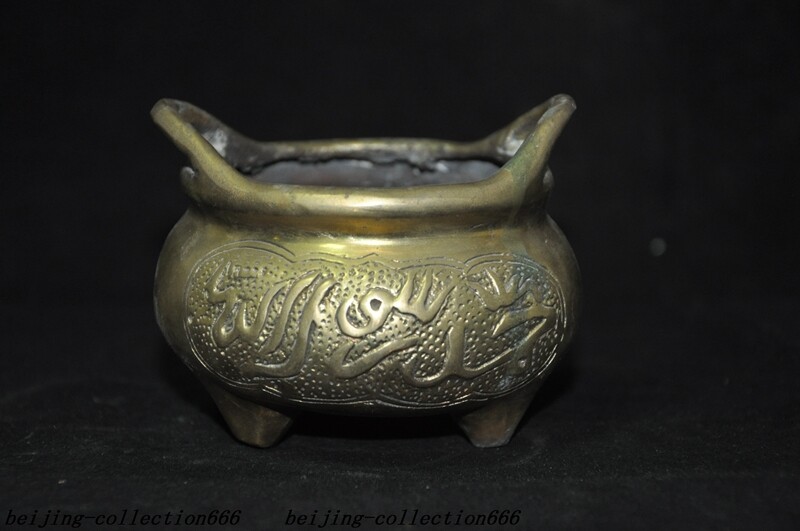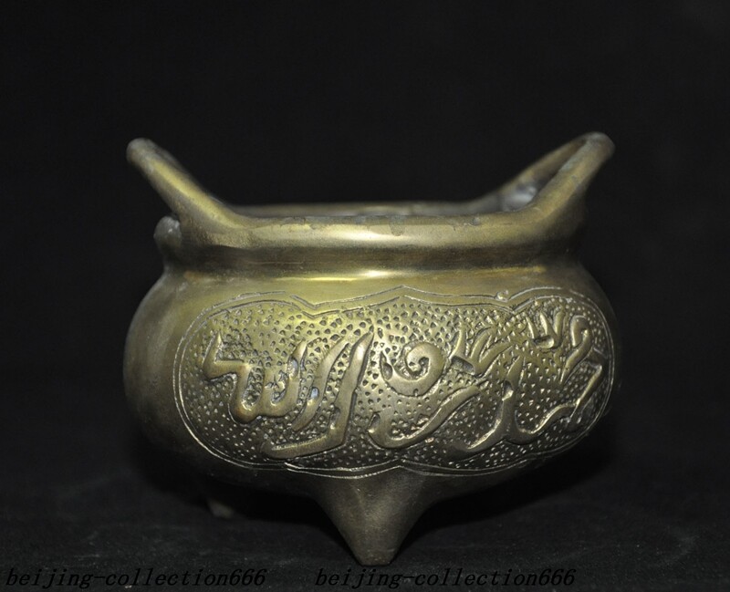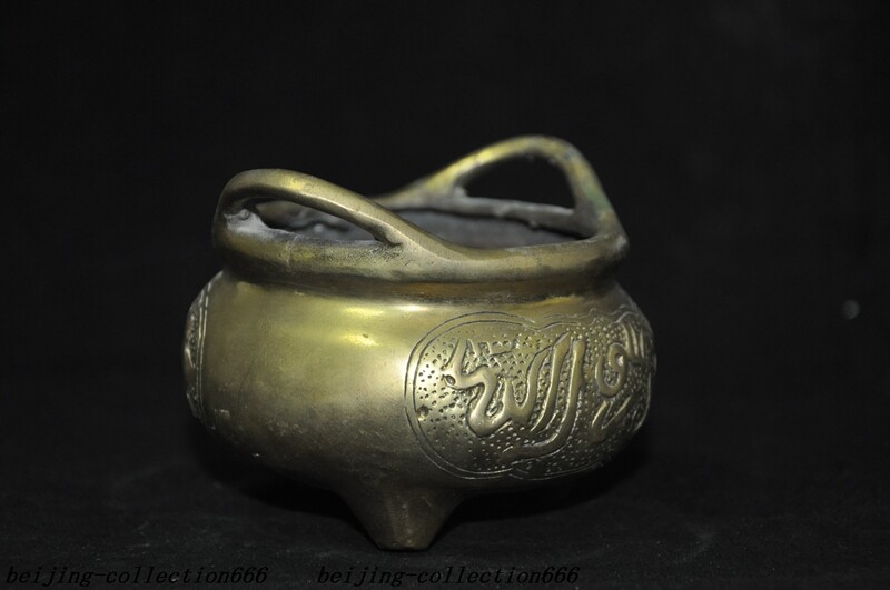 Here is an 3.6'' Marked old Chinese bronze Buddhism Islamic text joss Incense Burner censer , As you can see the image, It is in good condition, and was created by skilled craftsmen in traditional style with fine handcrafts . This is a great piece of valuable collection, a valuable personal alter or a very good present. the handwork is very fine with incredible detailing. Don't miss out this chance to get it .Wish you good luck! Size: Height: 2.8 inch .Long: 3.6 inch . breadth: 3.6 inch Size: Height: 7 cm .Long: 9 cm . breadth:9 cm Weight: 0.4 KG----included the weight of packing materials Materials: bronze Origin: China Shipping cost by EMS Express Mail ( 7------15 days ) : $Free B.I.AG Z