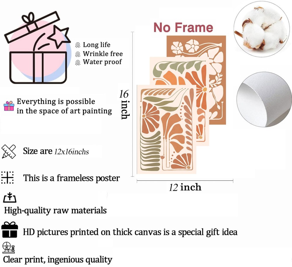 3Pcs Burnt Orange Floral Canvas Wall Art Mid-Century Neutral Botanical Pictures Vintage Boho Farmhouse Floral Poster Prints Abstract Flower Wall Decor for Living Room Bedroom 12x16in Unframed Product Details Size: 16L" x 12W" Color: Poster Brand: LWJARTFY MPN: Does not apply UPC: Does not apply EAN: Does not apply Product Dimensions: 16 x 12 x 0.2 inches Item Weight: 5 ounces Country of Origin: China Date First Available: July 29, 2024 Burnt Orange Floral Art Prints Set of 3: Size is12x16in(30x40cm), Unframed. Boho Floral Wall Art: The minimalist orange botanical art print feature minimalist flower and botanical designs, creating a calming and soothing atmosphere. Bring a touch of nature indoors and enjoy the tranquility and serenity that these farmhouse bathroom art bring to your bathroom, bedroom, living room, or any space in need of a peaceful retreat Neutral Home Decor: Whether your style is boho, minimalist, or modern, this flower wall paintings are the perfect addition to your home decor. The neutral color scheme complements a variety of interior design styles, making it easy to incorporate into your existing decor. They will effortlessly enhance the aesthetic appeal of your space and create a warm and inviting atmosphere Thoughtful Gifts: This flowers wall decor makes a thoughtful and unique gift for housewarmings, birthdays, holidays, or any special occasion. The flower prints and calming color palette bring a sense of tranquility and beauty to any space, making it a perfect gift for friends, family, or loved ones who appreciate nature-inspired decor.The Vintage Flowers Canvas Painting Wall Art Is The Perfect Piece To Complete Your New Home'S Decor, And It Can Also Be As Gift For Christmas, Birthdays, Father'S Day Or Mother'S Day, Thanksgiving Day, Or Valentine'S Day Etc After-Sales Service: Your satisfaction is our only pursuit. If you have any problems with the art prints you received, please feel free to contact us. we will answer you in the shortest time.