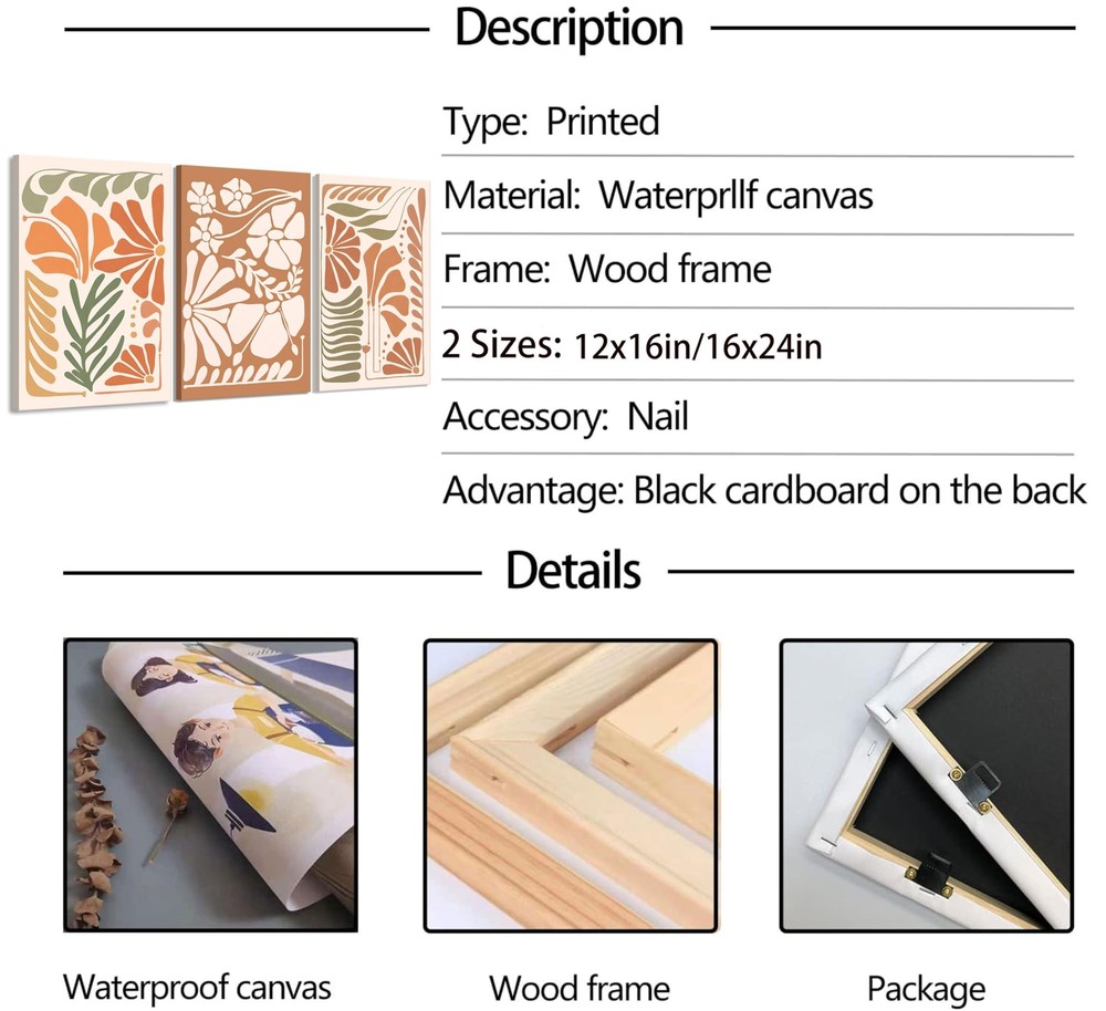 3Pcs Burnt Orange Floral Canvas Wall Art Mid-Century Neutral Botanical Pictures Vintage Boho Farmhouse Floral Poster Prints Abstract Flower Wall Decor for Living Room Bedroom 16x24in Framed Product Details Size: 24L" x 16W" Color: Canvas Brand: LWJARTFY MPN: Does not apply UPC: Does not apply EAN: Does not apply Product Dimensions: 24 x 16 x 0.2 inches Item Weight: 2.55 pounds Country of Origin: China Date First Available: July 29, 2024 Burnt Orange Floral Art Prints Set of 3: Size is16x24in(40x60cm), Flower wall art is already perfectly stretched over a solid wooden frame and hooks have been mounted on panels, you could easily hang the framed canvas wall art on at any time Boho Floral Wall Art: The minimalist orange botanical art print feature minimalist flower and botanical designs, creating a calming and soothing atmosphere. Bring a touch of nature indoors and enjoy the tranquility and serenity that these farmhouse bathroom art bring to your bathroom, bedroom, living room, or any space in need of a peaceful retreat Neutral Home Decor: Whether your style is boho, minimalist, or modern, this flower wall paintings are the perfect addition to your home decor. The neutral color scheme complements a variety of interior design styles, making it easy to incorporate into your existing decor. They will effortlessly enhance the aesthetic appeal of your space and create a warm and inviting atmosphere Thoughtful Gifts: This flowers wall decor makes a thoughtful and unique gift for housewarmings, birthdays, holidays, or any special occasion. The flower prints and calming color palette bring a sense of tranquility and beauty to any space, making it a perfect gift for friends, family, or loved ones who appreciate nature-inspired decor.The Vintage Flowers Canvas Painting Wall Art Is The Perfect Piece To Complete Your New Home'S Decor, And It Can Also Be As Gift For Christmas, Birthdays, Father'S Day Or Mother'S Day, Thanksgiving Day, Or Valentine'S Day Etc After-Sales Service: Your satisfaction is our only pursuit. If you have any problems with the art prints you received, please feel free to contact us. we will answer you in the shortest time.