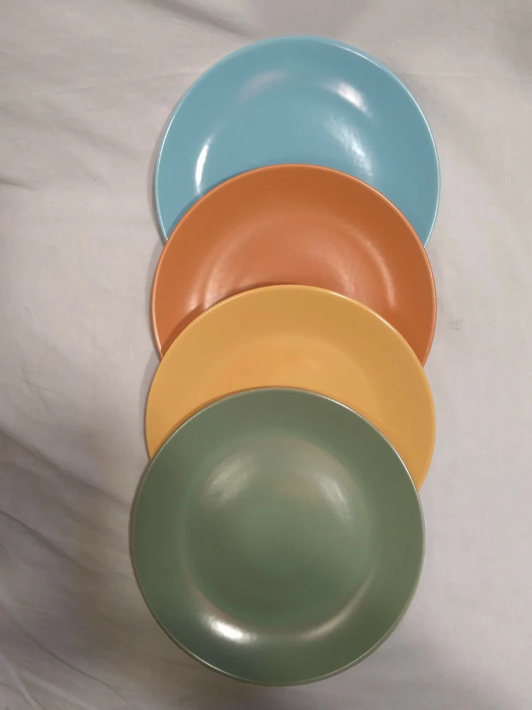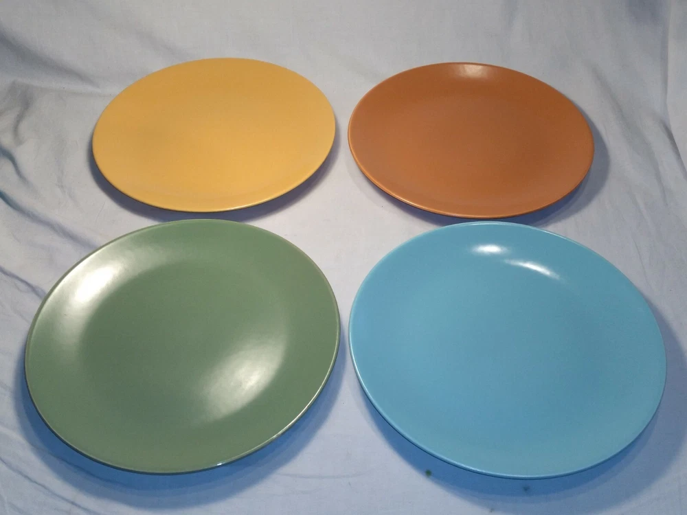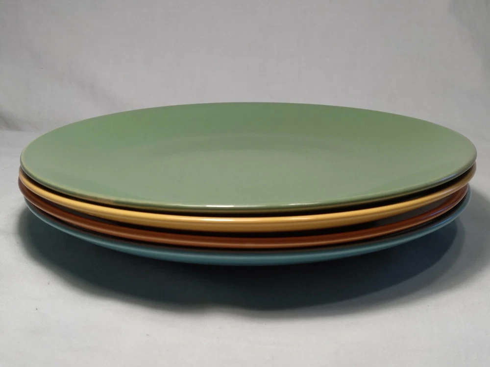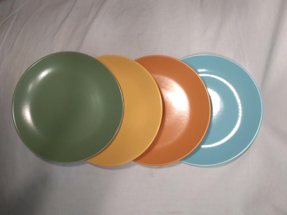 MCM Solid Color Dinner Plates Green Yellow Orange Blue 9" Set Of 4 Rare. Fantastic set of colorful retro dinner plates! Plates measures 9 inches in diameter. Plates are in very good condition overall, some utensil marks from prior use. A real unique set!