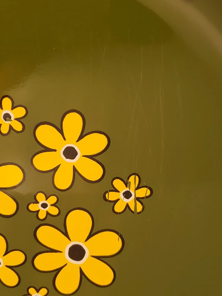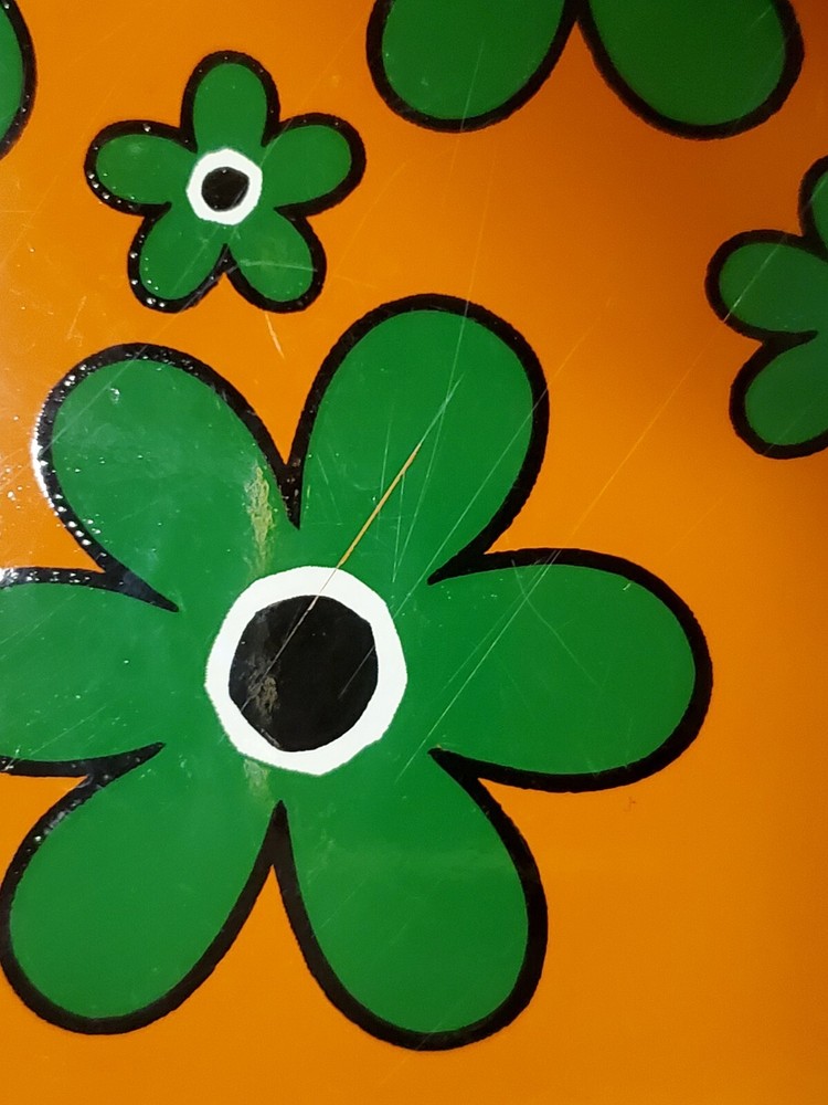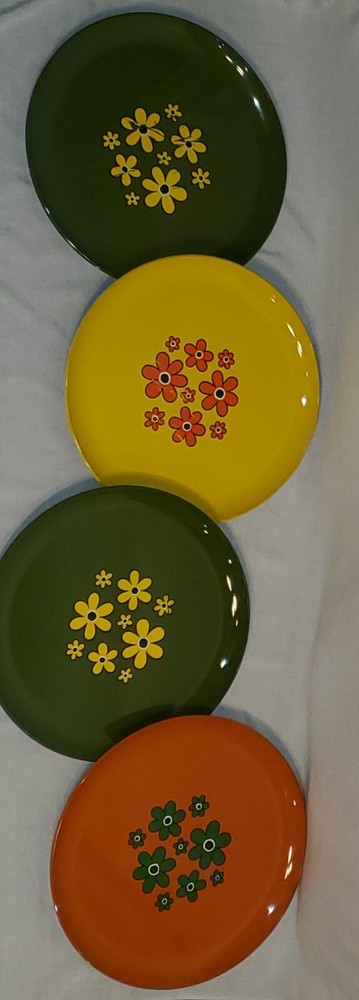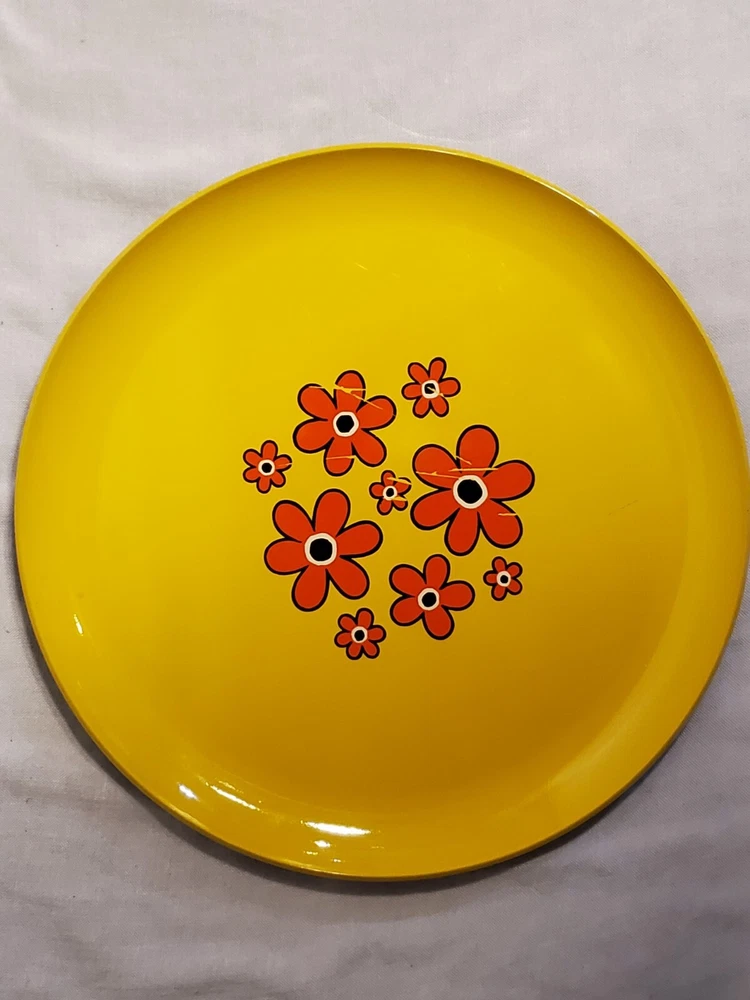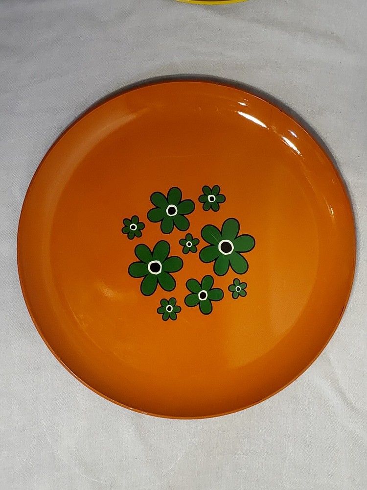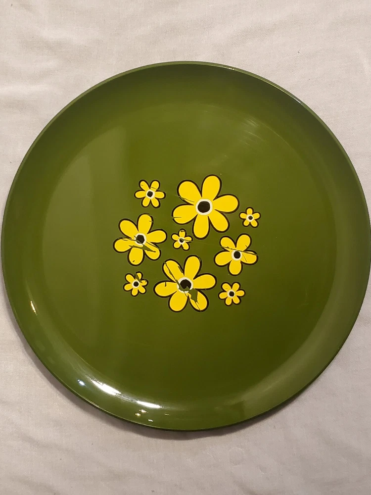 These are vintage so there us some scratches on all of them. Some more scratches than others (see pics) This stunning platter, measuring 13 inches in diameter, is a true representation of the mid-century modern style. The vibrant yellow, green and orange flower power design adds a touch of retro charm to any decor. The lucite material of this platter ensures durability and longevity. This platter belongs to the decorative cookware, dinnerware and serveware category and is perfect for serving up your favorite dishes at dinner parties or family gatherings. The brand, Flower Power, is known for their unique and colorful designs. The platter's color, type, theme, and style are all important aspects that make it a must-have for any mid-century modern enthusiast.