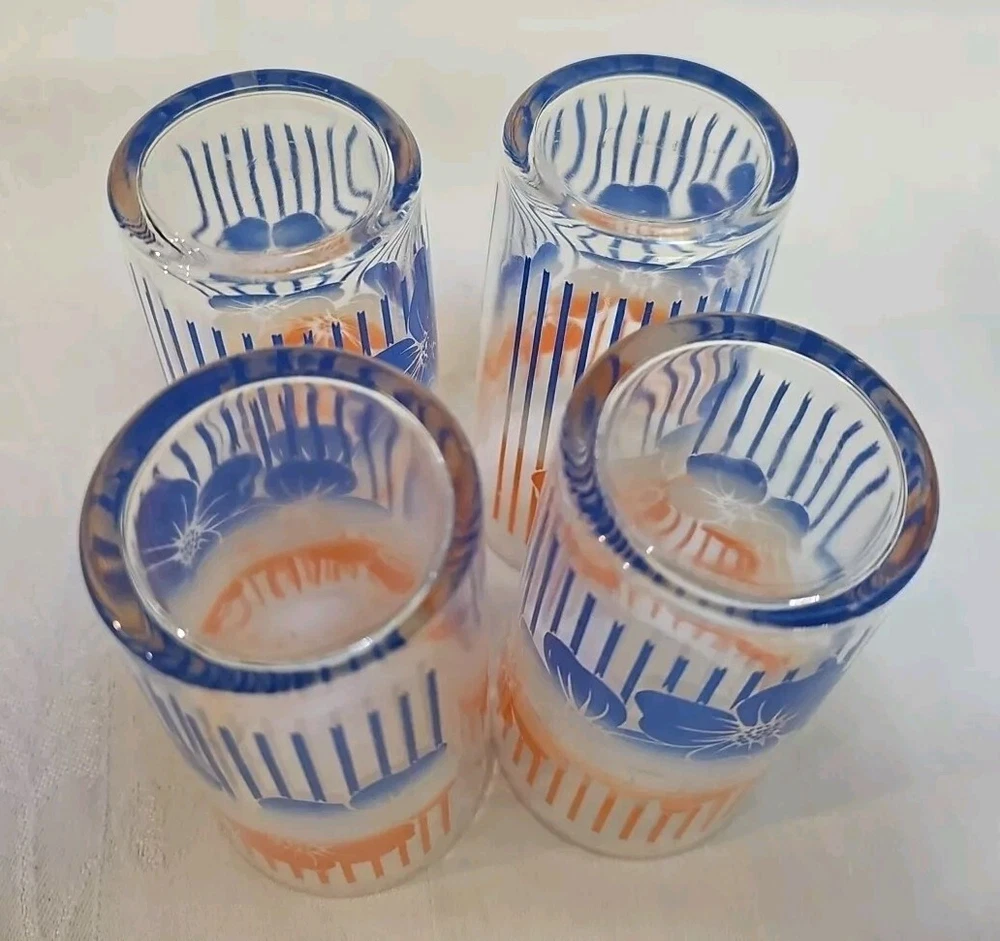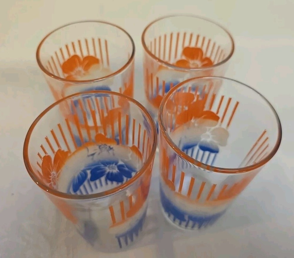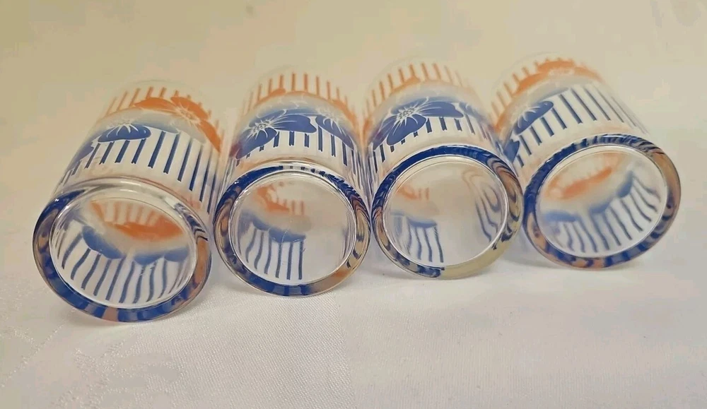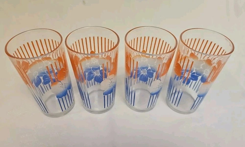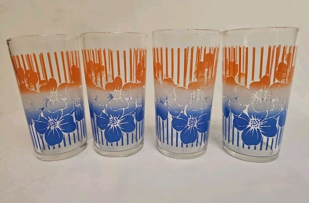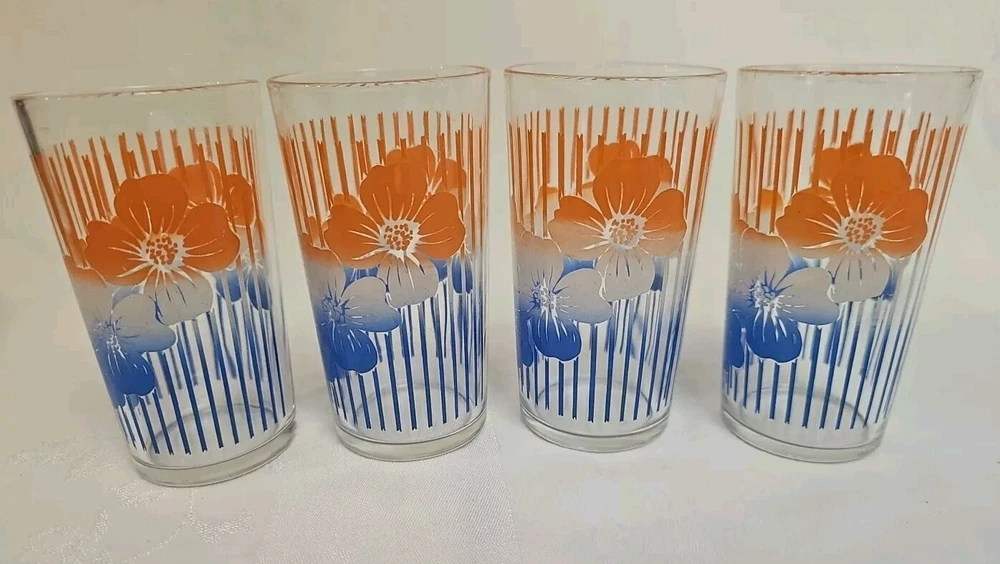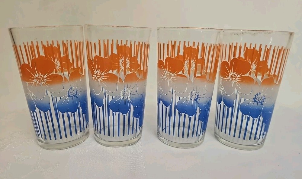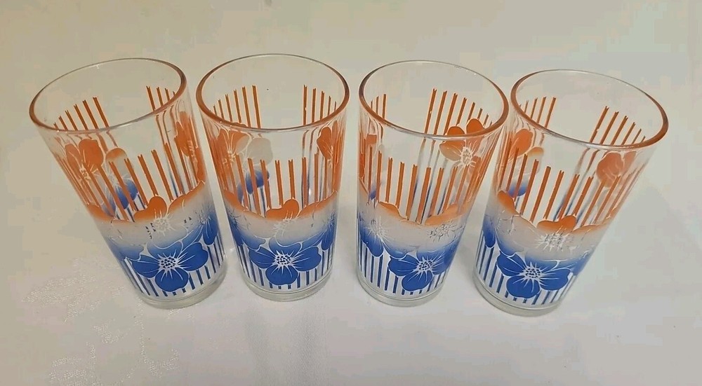 Description Four (4) Mid-Century Modern 9 oz. glasses, well-kept and in excellent used condition (EUC). Pyroglaze ombré flowers design Orange, white, blue Condition No chips, cracks, haze, or repairs. Glass finish and pyroglaze colors are bright. Overall shows quite low wear. Dimensions ~4.25" tall ~3" diameter Capacity ~10 oz. Total weight (unboxed) ~1 lb. 9 oz. Multiple photos showing different angles are a guide to determining condition. Please ask any questions before purchase. We make every effort to fully describe items in words and pictures, and welcome your questions if you need more information or requests for additional photos. Come see all our other beautiful vintage items on eBay: http://stores.ebay.com/AConnecticutCook