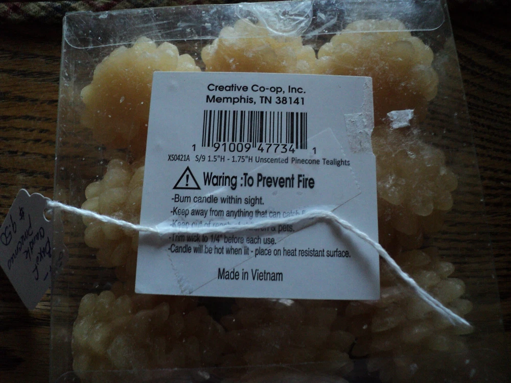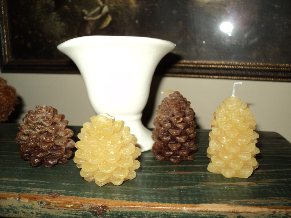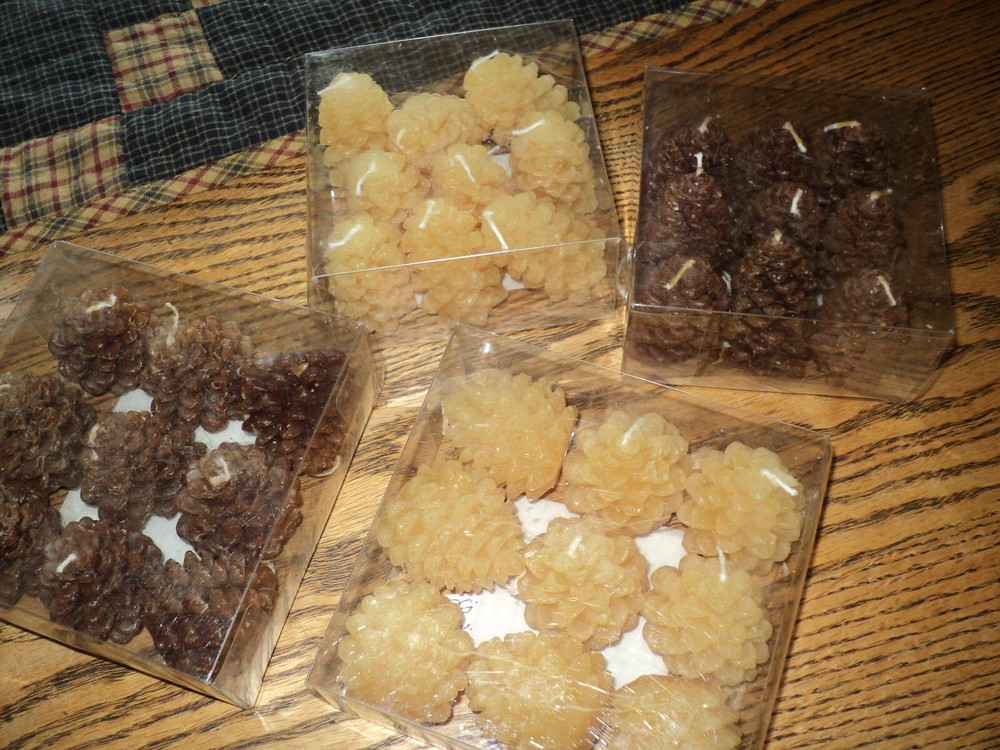 You are bidding on 4 boxes of 9 Unscented Pinecone Shaped Tealights. 36 pine cones in all. Set of 9 in a box- all boxes are different..2 are buttercream color and other 2 are brown with different heights. see photos for best description. You will only receive the candles...other items in photos are for display only Dimensions: 1.5" to 1.75" Material: 100% Paraffin Wax Approximate Burn Time 20 Min Email me with questions prior to bidding. Sorry, no returns. Shipping to USA. Check out my other listings too!