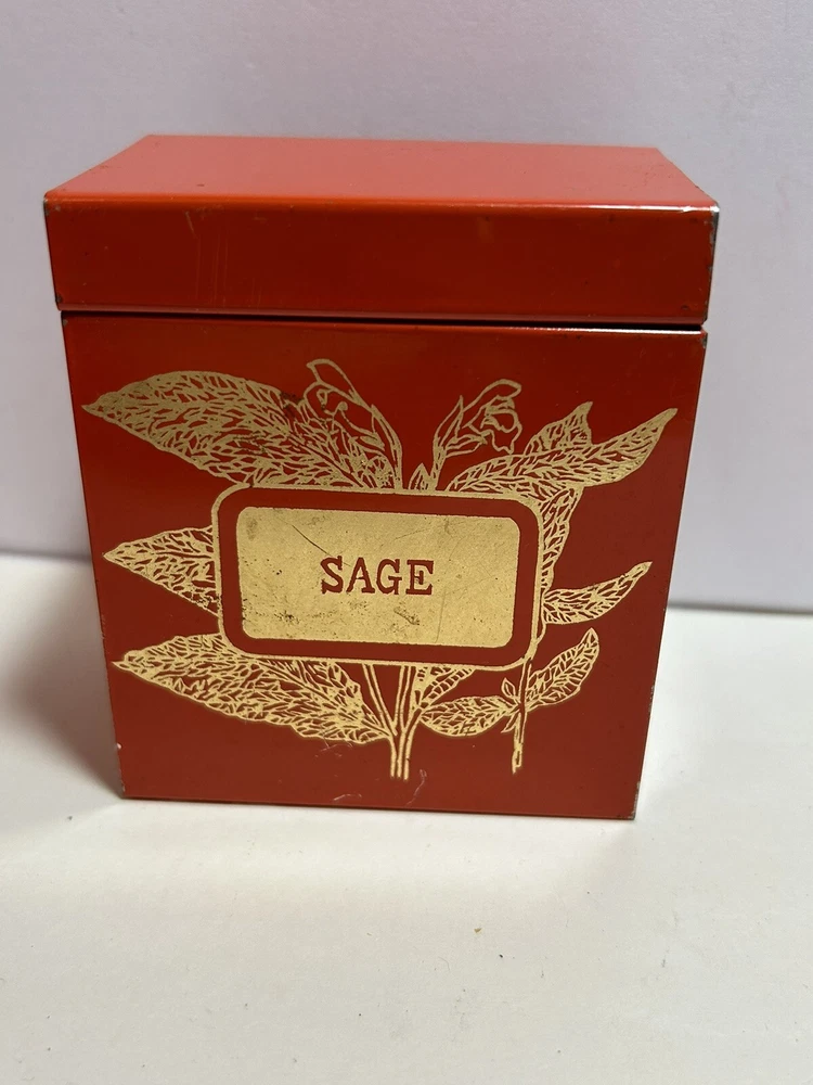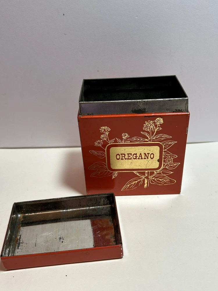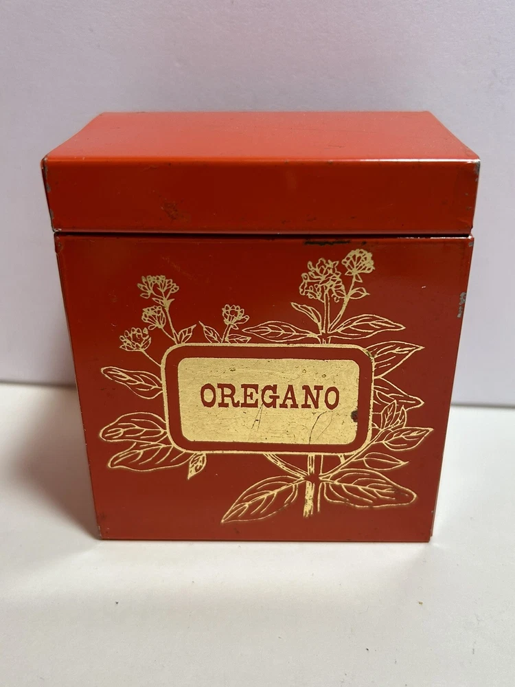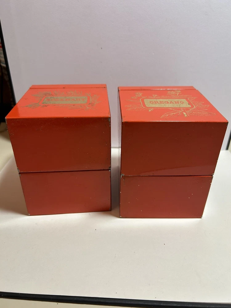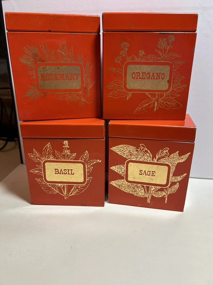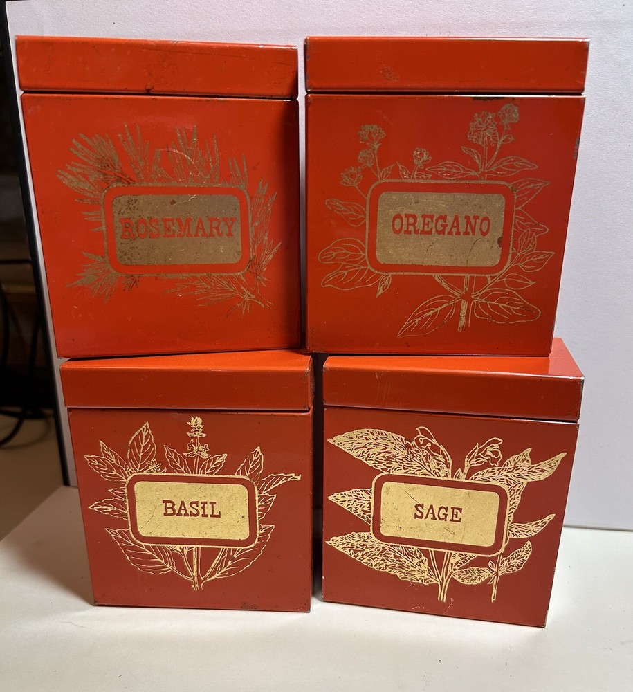 Add a touch of vintage Mid Century Modern / MCM charm to your kitchen with this 4-piece spice tin set. The rectangular tins come in a classic MCM shade of orange with gold accents, giving them a mid-century modern appeal. Each tin is labeled in gold with a different herb - basil, sage, oregano, and rosemary and an etching of them in gold - making it easy to store and identify your favorite spices. These tins feature a lid to keep your spices fresh and flavorful. They measure 3 inches in length, 2 inches in width, and 3.5 inches in height, making them the perfect size for any kitchen. This original 1950s set is sure to add a pop of color and style to your spice storage. Wear inside / tarnish - as is to be expected given they are many decades old. See pictures for details and condition. Packaged carefully and shipped with tracking.