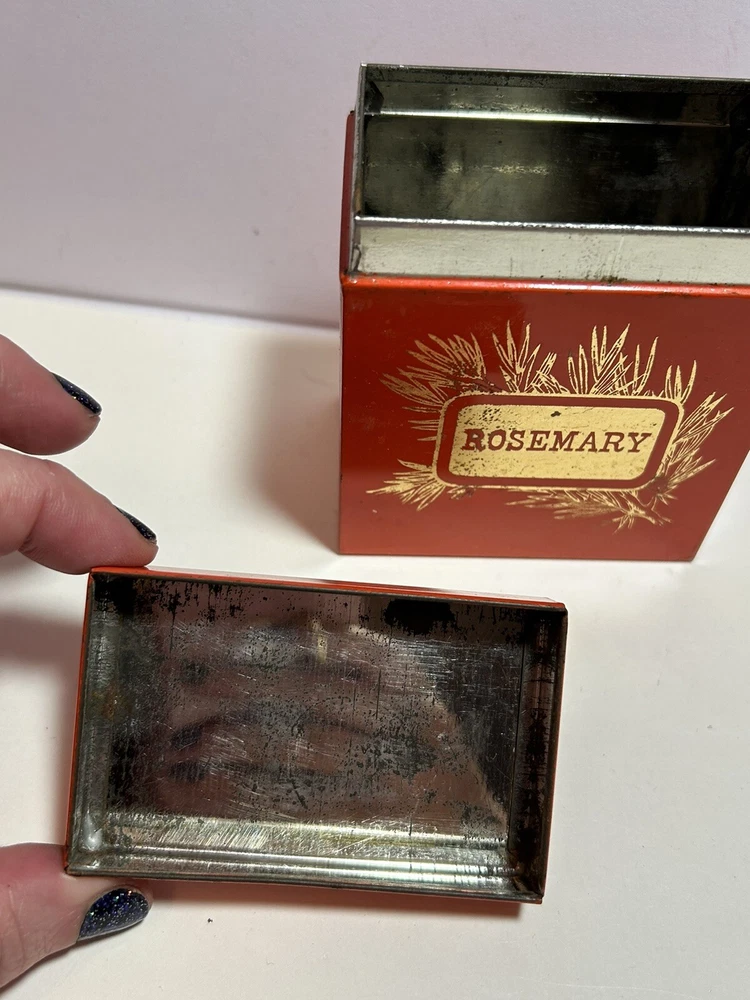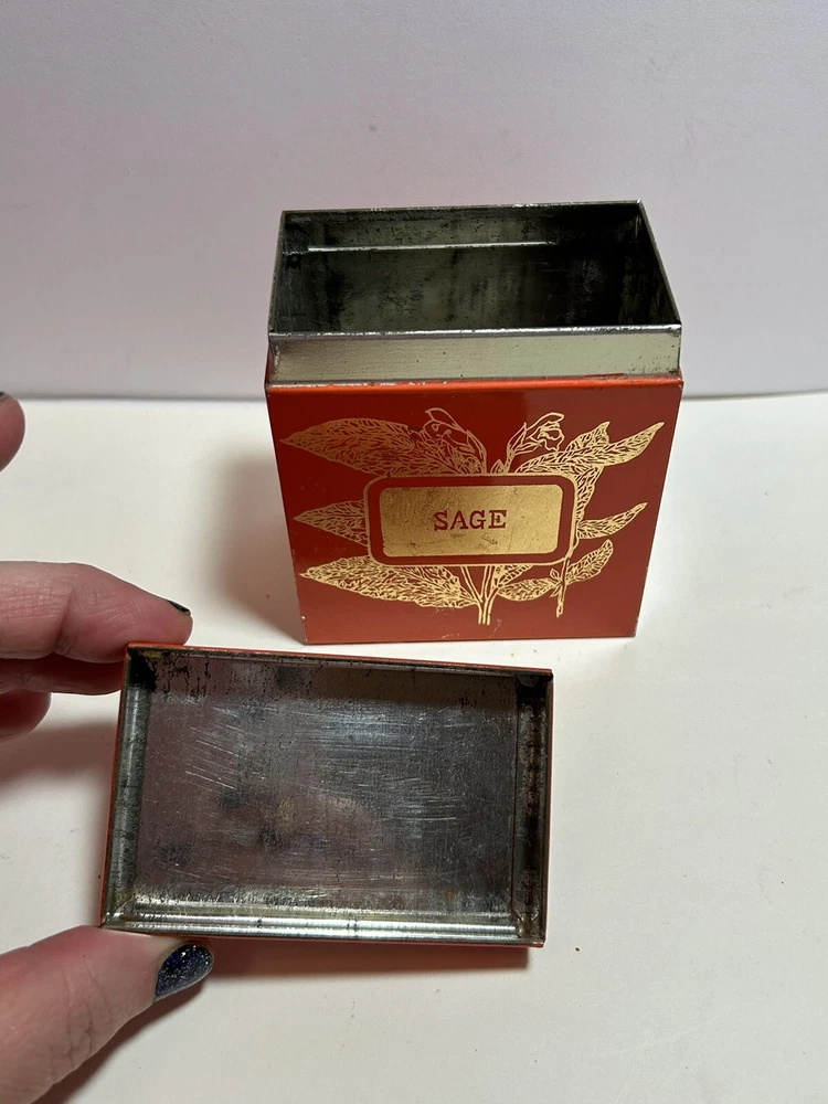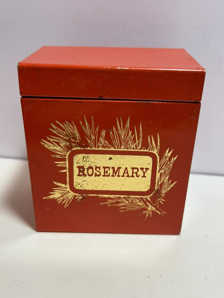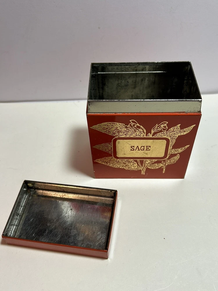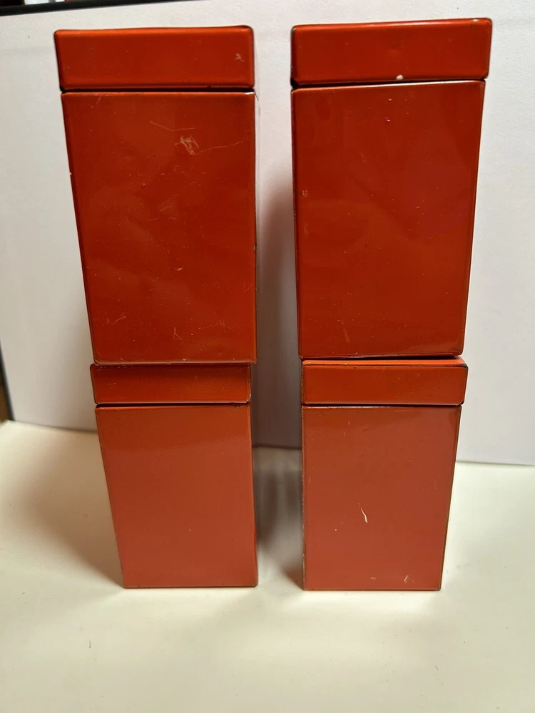Add a touch of vintage Mid Century Modern / MCM charm to your kitchen with this 4-piece spice tin set. The rectangular tins come in a classic MCM shade of orange with gold accents, giving them a mid-century modern appeal. Each tin is labeled in gold with a different herb - basil, sage, oregano, and rosemary and an etching of them in gold - making it easy to store and identify your favorite spices. These tins feature a lid to keep your spices fresh and flavorful. They measure 3 inches in length, 2 inches in width, and 3.5 inches in height, making them the perfect size for any kitchen. This original 1950s set is sure to add a pop of color and style to your spice storage. Wear inside / tarnish - as is to be expected given they are many decades old. See pictures for details and condition. Packaged carefully and shipped with tracking.