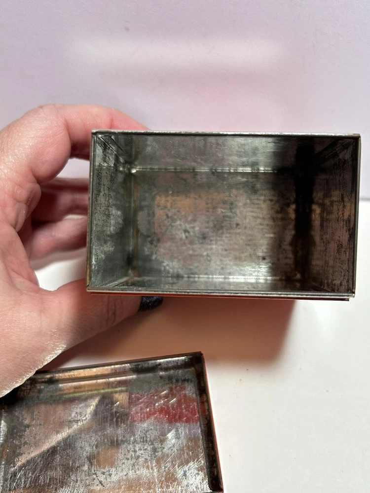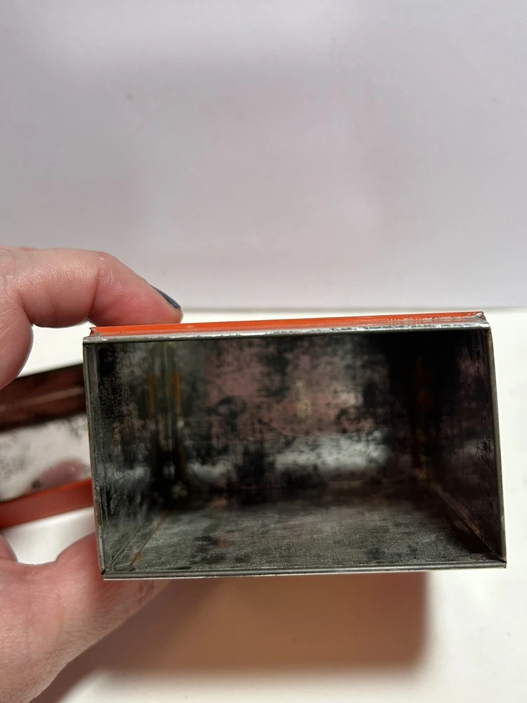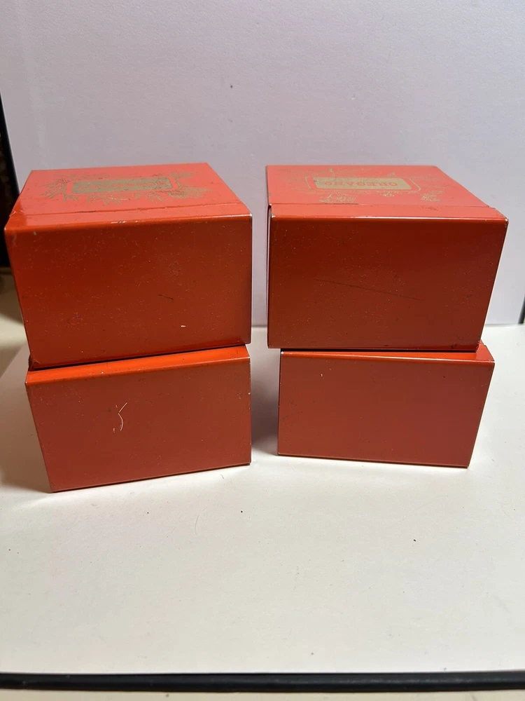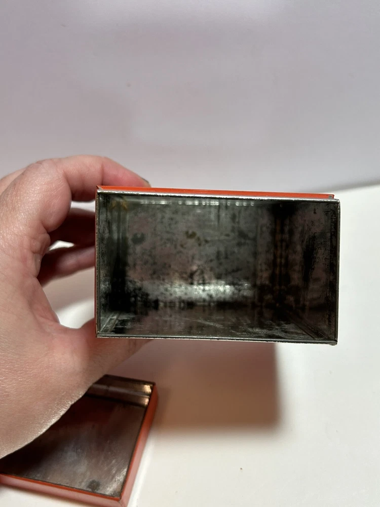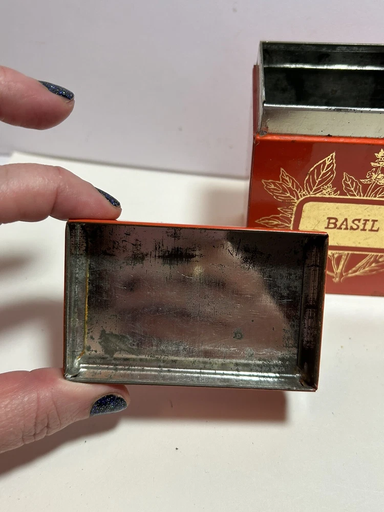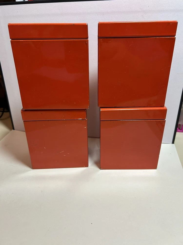 Add a touch of vintage Mid Century Modern / MCM charm to your kitchen with this 4-piece spice tin set. The rectangular tins come in a classic MCM shade of orange with gold accents, giving them a mid-century modern appeal. Each tin is labeled in gold with a different herb - basil, sage, oregano, and rosemary and an etching of them in gold - making it easy to store and identify your favorite spices. These tins feature a lid to keep your spices fresh and flavorful. They measure 3 inches in length, 2 inches in width, and 3.5 inches in height, making them the perfect size for any kitchen. This original 1950s set is sure to add a pop of color and style to your spice storage. Wear inside / tarnish - as is to be expected given they are many decades old. See pictures for details and condition. Packaged carefully and shipped with tracking.
