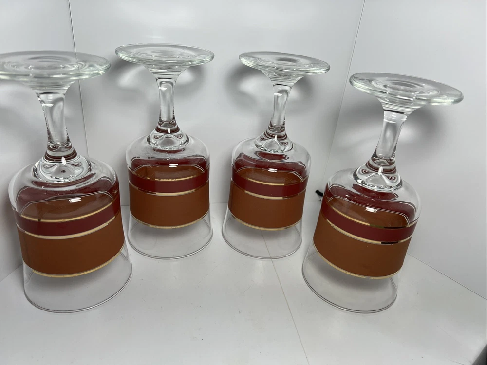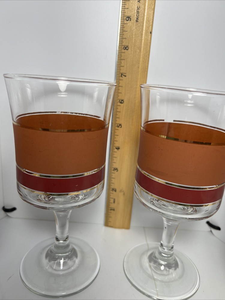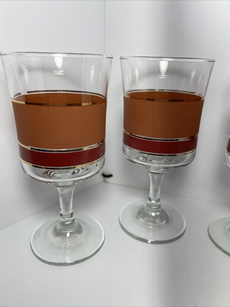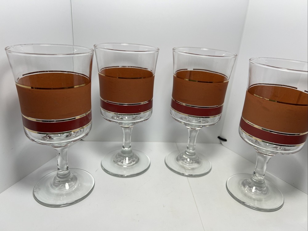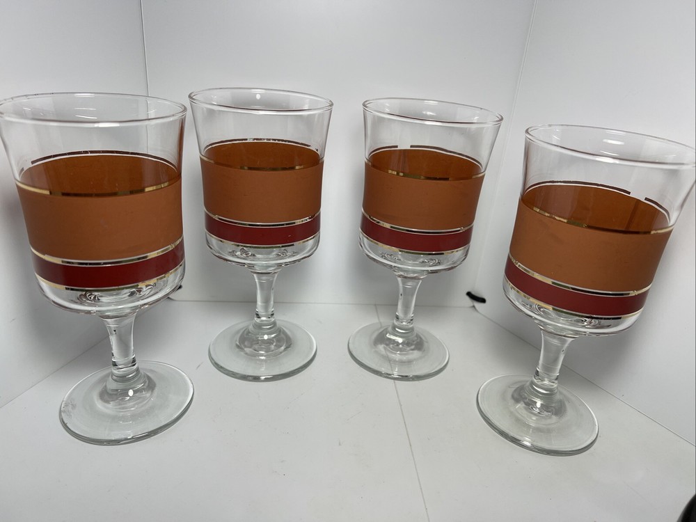Add a touch of vintage charm to your glassware collection with this set of four Denby goblets. The mid-century modern style of these glasses, with their bold burnt orange, red, and gold stripes, is perfect for all occasions. Each cylinder-shaped goblet is made of high-quality glass and has a height of 6 3/4 inches and a width of 3 1/4 inches. These glasses are a true vintage original from the mid 20th century (1941-1969) and are part of the Denby product line. They are perfect for wine or water and come in a set of four. The straight lines theme of these glasses adds a touch of sophistication to any table setting. Don't miss out on the chance to add these unique and stylish glasses to your collection.
