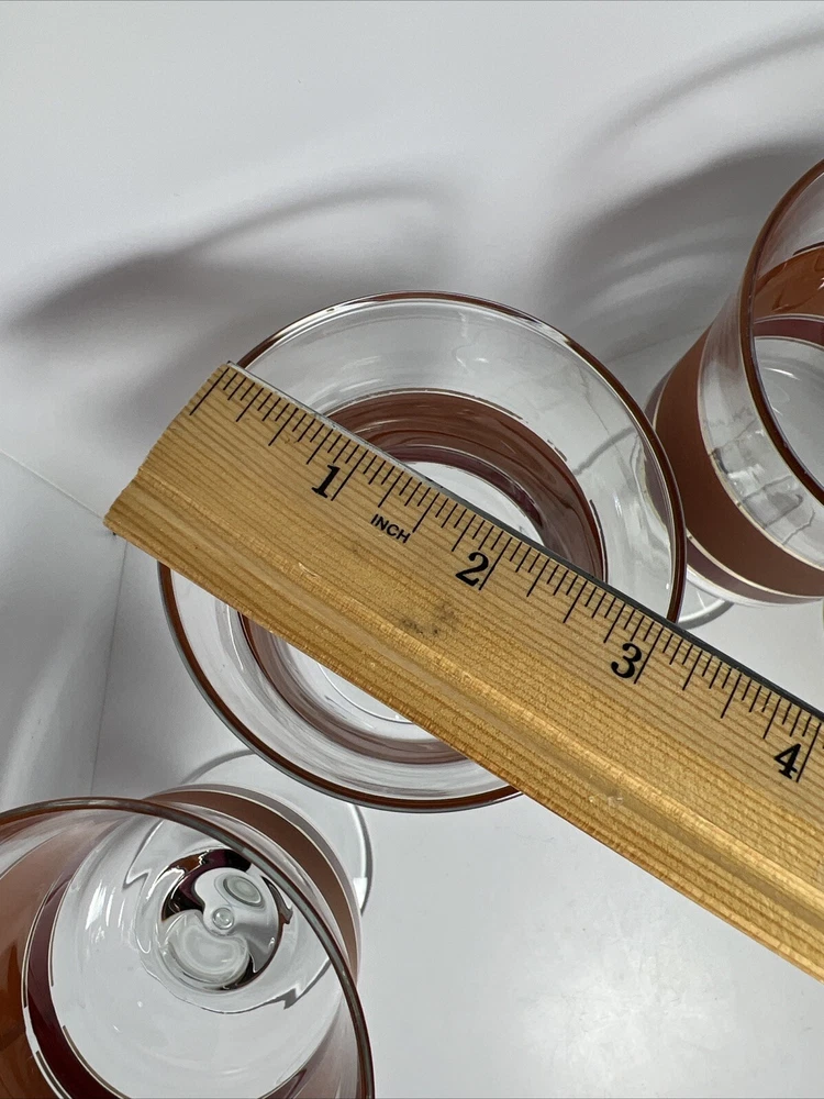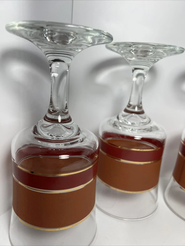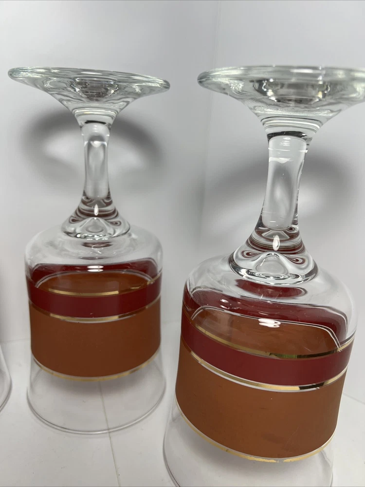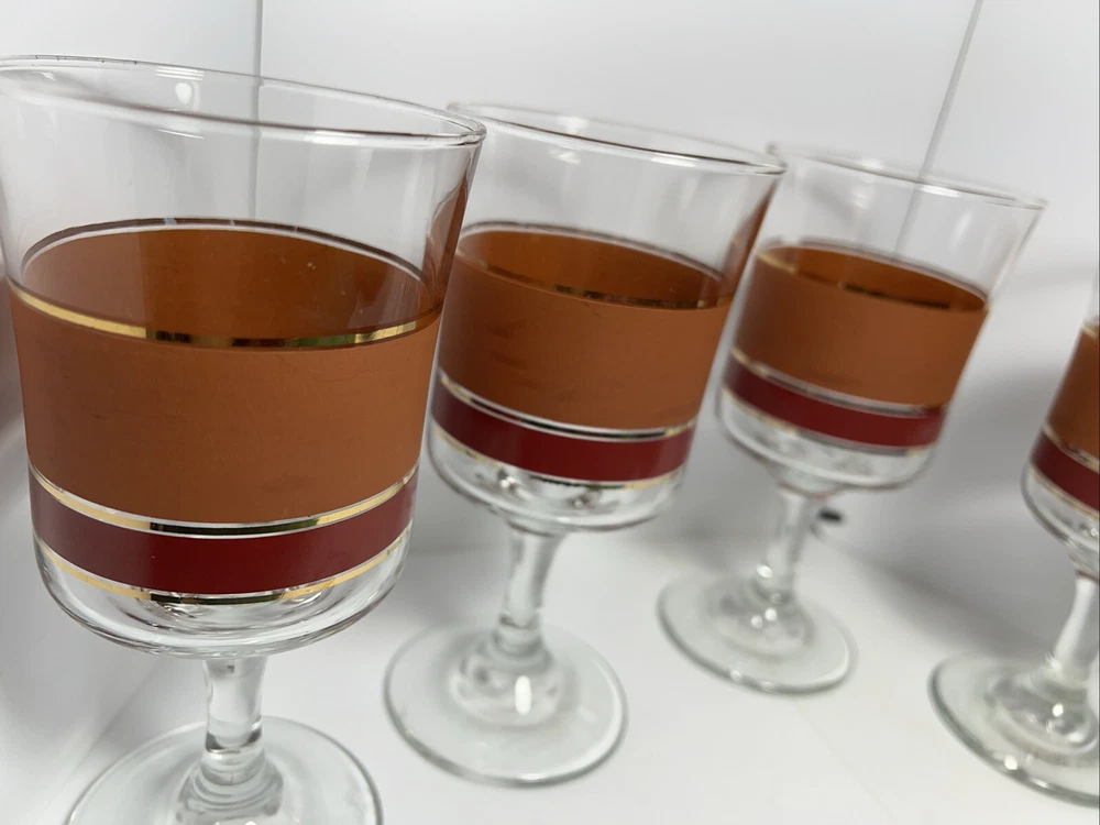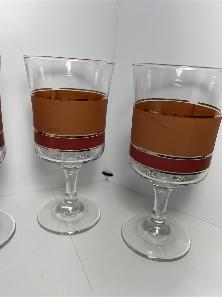 Add a touch of vintage charm to your glassware collection with this set of four Denby goblets. The mid-century modern style of these glasses, with their bold burnt orange, red, and gold stripes, is perfect for all occasions. Each cylinder-shaped goblet is made of high-quality glass and has a height of 6 3/4 inches and a width of 3 1/4 inches. These glasses are a true vintage original from the mid 20th century (1941-1969) and are part of the Denby product line. They are perfect for wine or water and come in a set of four. The straight lines theme of these glasses adds a touch of sophistication to any table setting. Don't miss out on the chance to add these unique and stylish glasses to your collection.
