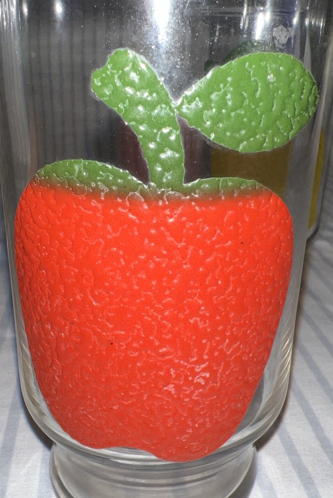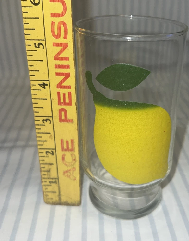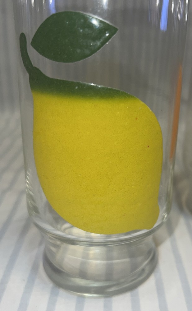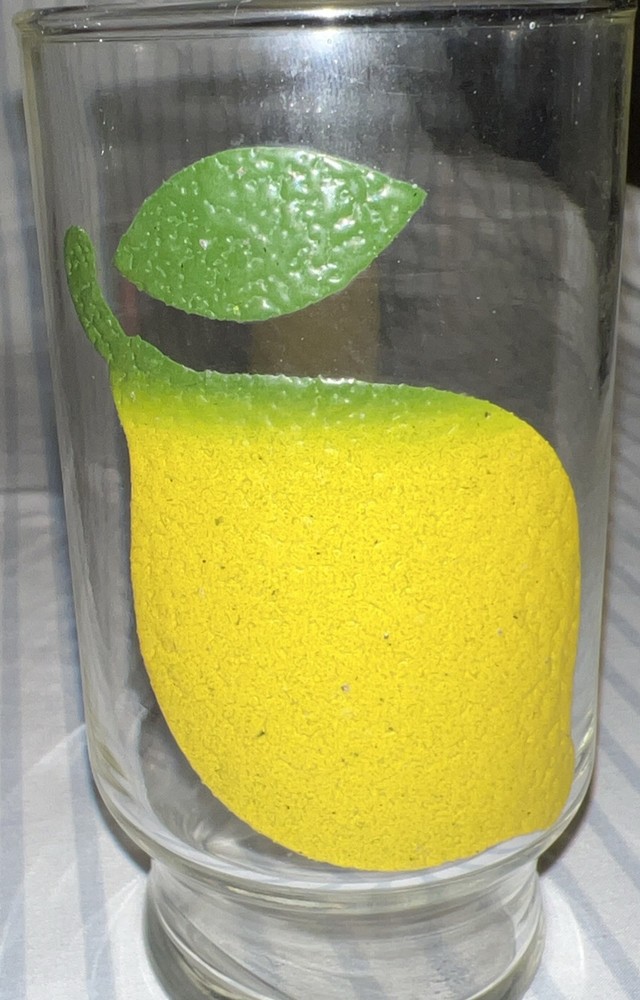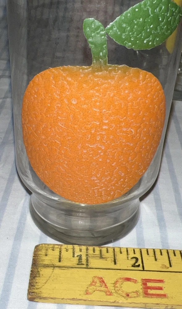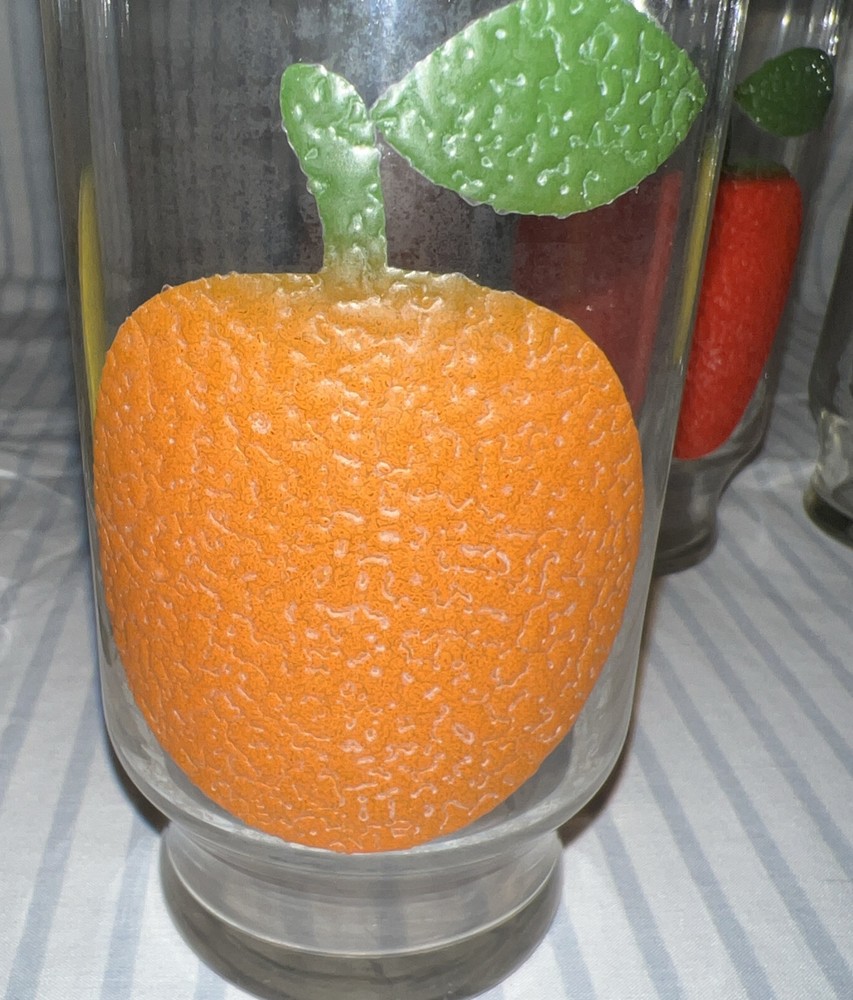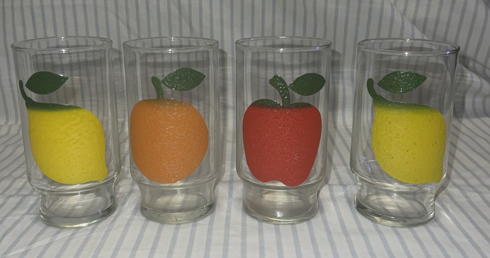 Elevate your drinkware collection with this charming set of four textured fruit juice glasses. Each glass features a unique design inspired by apples, lemons, and oranges, bringing a touch of vintage charm to any table setting. With their mid-century modern style, these glasses are a perfect match for any retro-themed decor or collection. Crafted from durable glass material, these glasses are an original production from the 1970s, and their color scheme is a delightful array of multicolours. Though the country of origin is unknown, the quality and craftsmanship speak for themselves. Add a touch of nostalgia to your drinkware with this four-piece tumbler glass set.