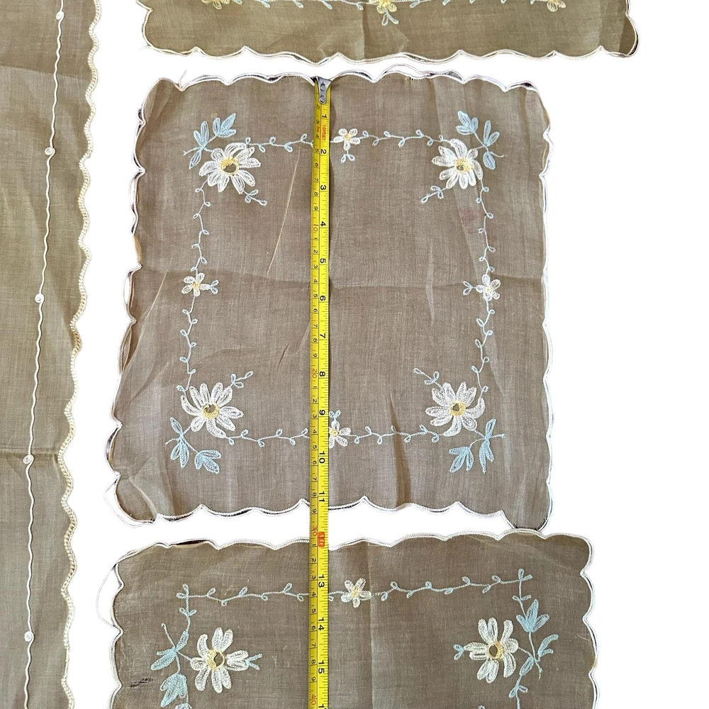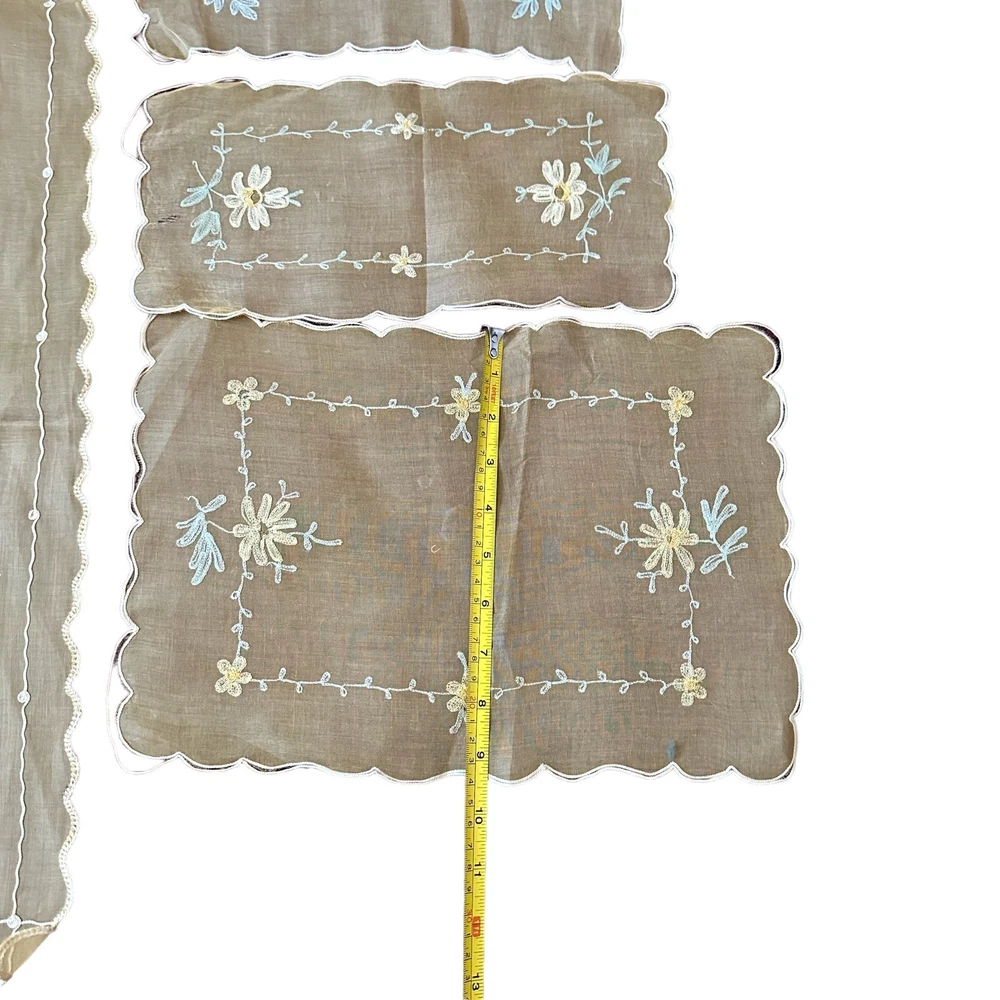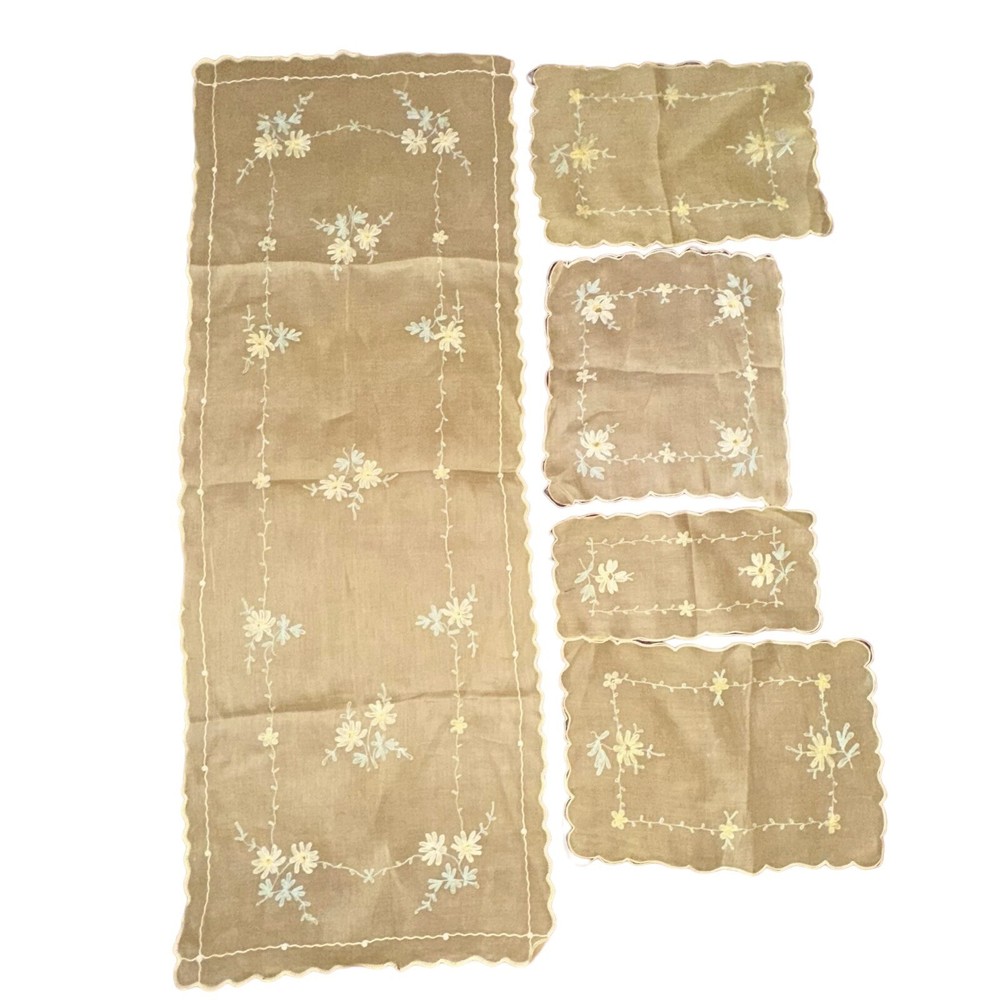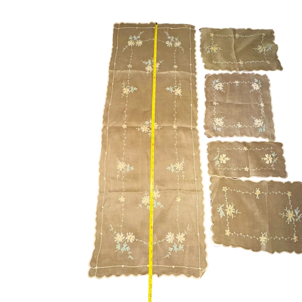 5 Piece Vtg Organza Embroidered Table Runner & Placemats Orange Floral Set READ This set is a light orange color. The 3rd photo shows it in it's truest color There are 2 areas that have wear and thinning The edges of some of the pieces has become unattached If you have any questions, please do not hesitate to ask Thank you