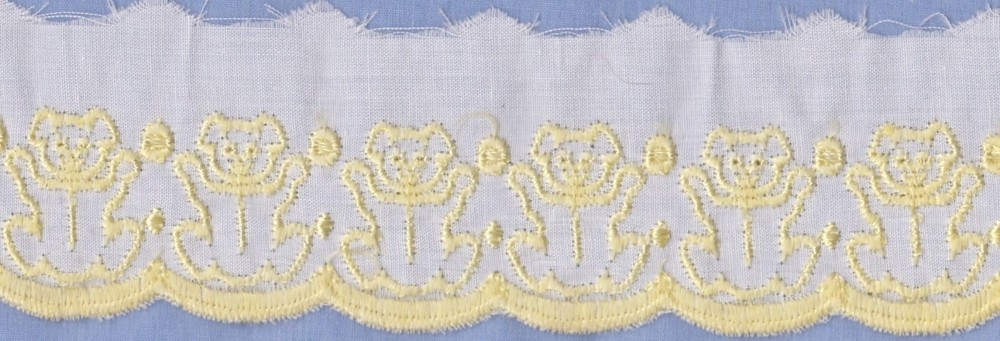 Exquisite Polycotton Teddy Bear Edging. This delightful white polycotton edging, featuring lemon teddy bears with a lemon edge. Measuring 50mm wide, and 1 metre long, this is a truly beautiful edging. Suitable for a wide range of uses, including babywear, nursery sheets and pillowcases, bibs, craft work etc, etc, you will be delighted with this edging. The price is for one metre. If more than one metre is purchased it will come as a continuous length Please feel free to email if you have any questions. We're more than happy to combine purchases to save on postage costs. Happy eBaying!! Stock code 21635
