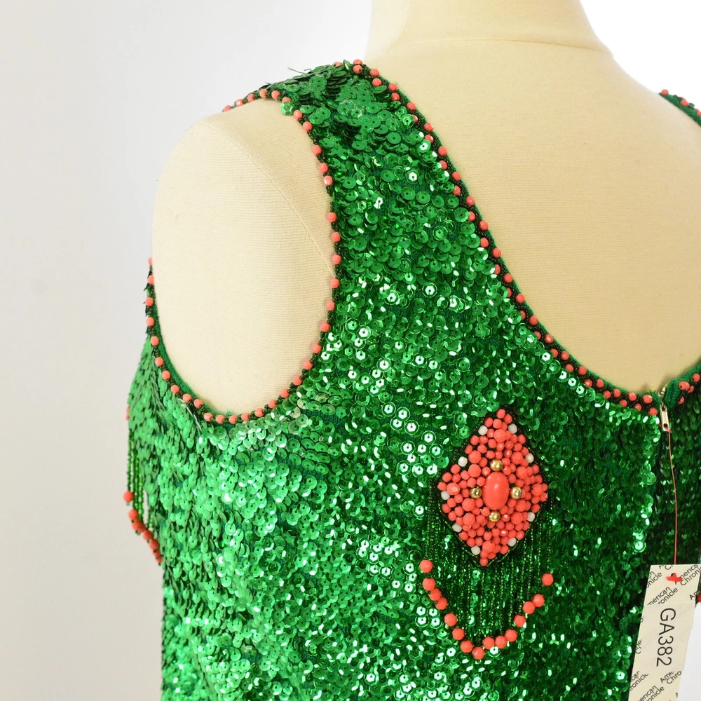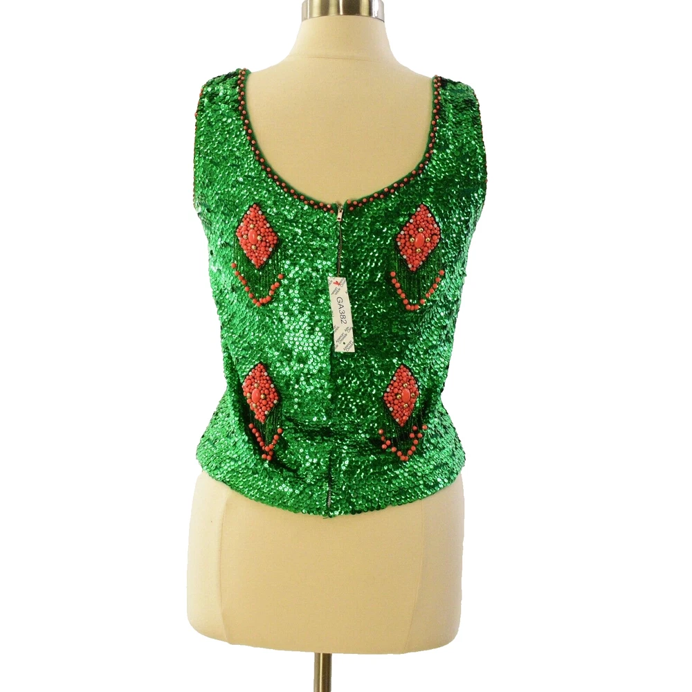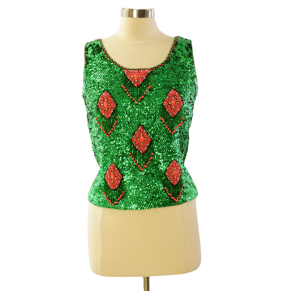 Green sequined sleeveless top. Back zip closure. Orange beading design. 36-inch chest and a 21-inch length. Unbranded and with no material tags, however, the sequin and beading appear to be on a knit wool fabric. From the 1950s, don't miss a chance to have a piece of fashion history! Fits a size small best! This top is in stunning vintage condition, as are most of our items at American Chronicle!