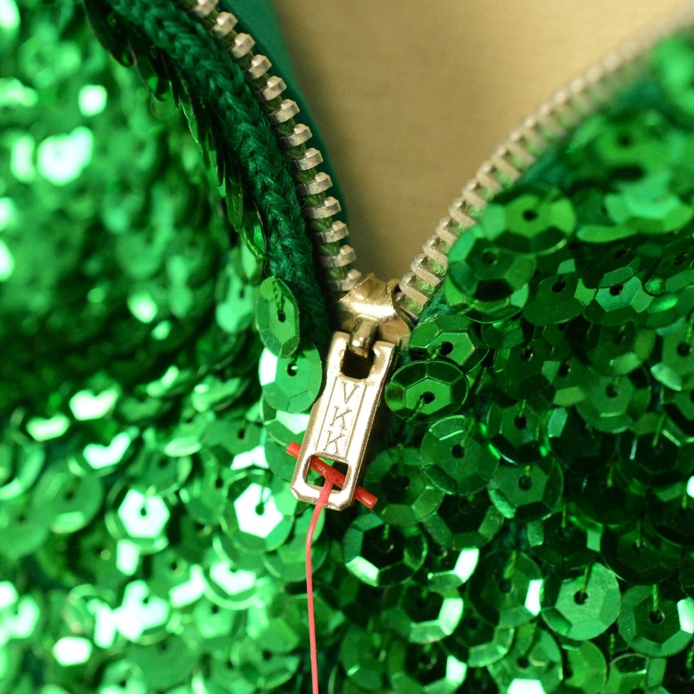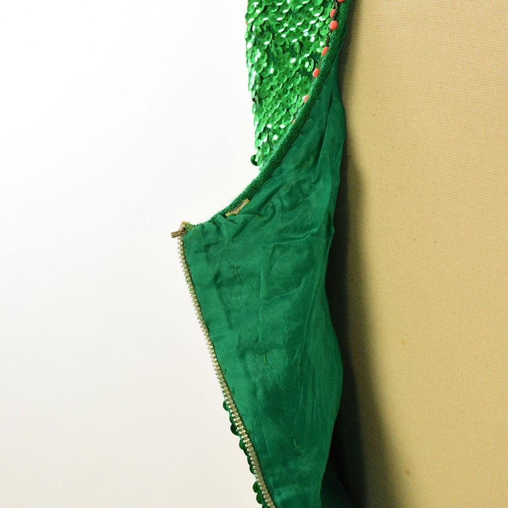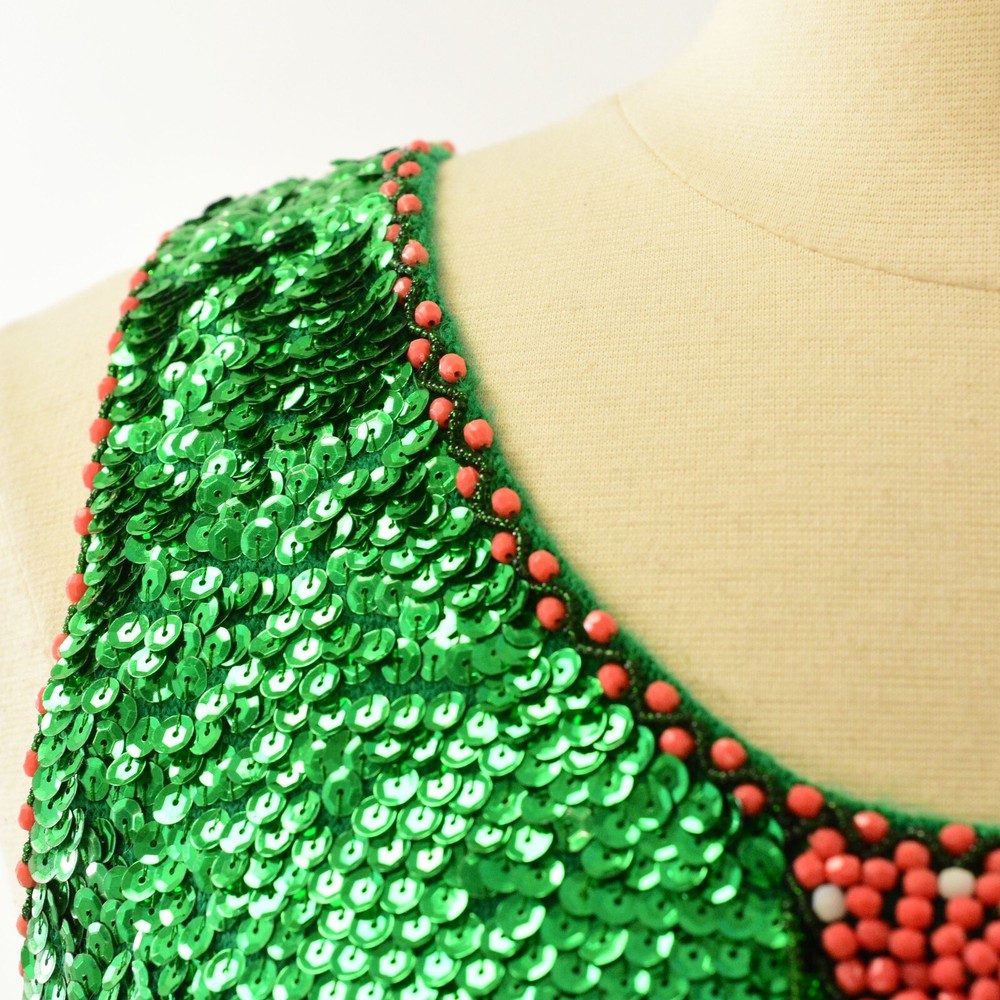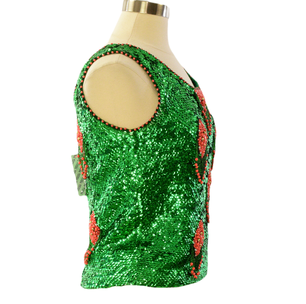 Green sequined sleeveless top. Back zip closure. Orange beading design. 36-inch chest and a 21-inch length. Unbranded and with no material tags, however, the sequin and beading appear to be on a knit wool fabric. From the 1950s, don't miss a chance to have a piece of fashion history! Fits a size small best! This top is in stunning vintage condition, as are most of our items at American Chronicle!