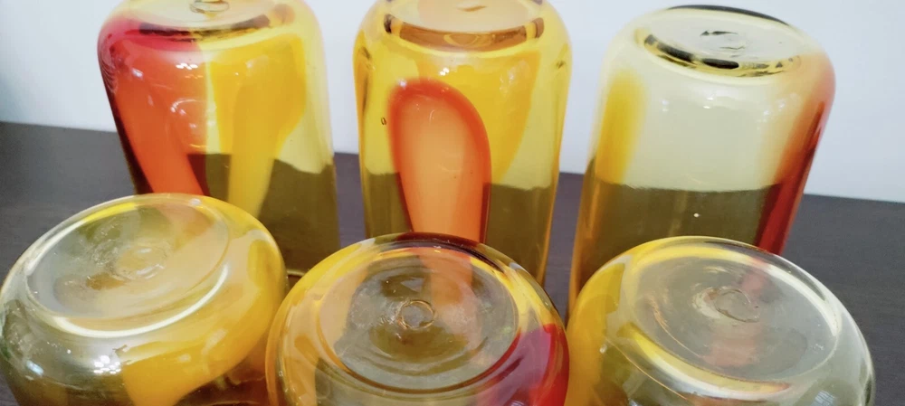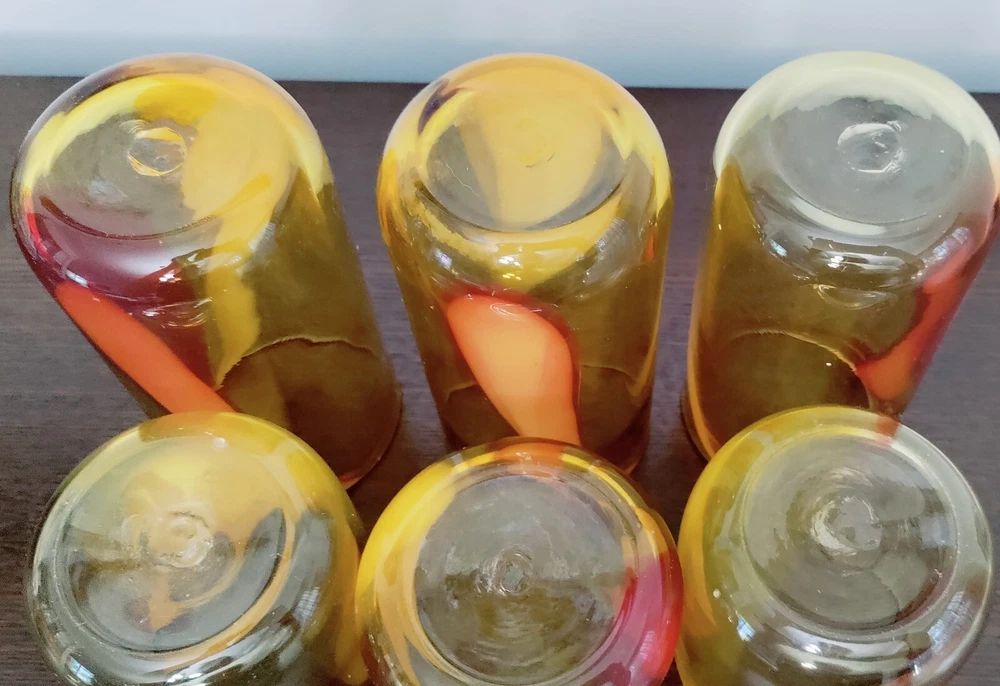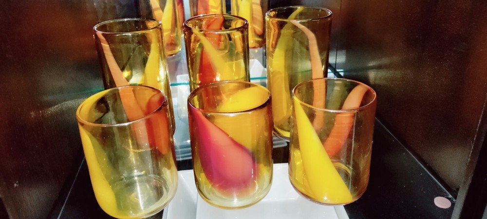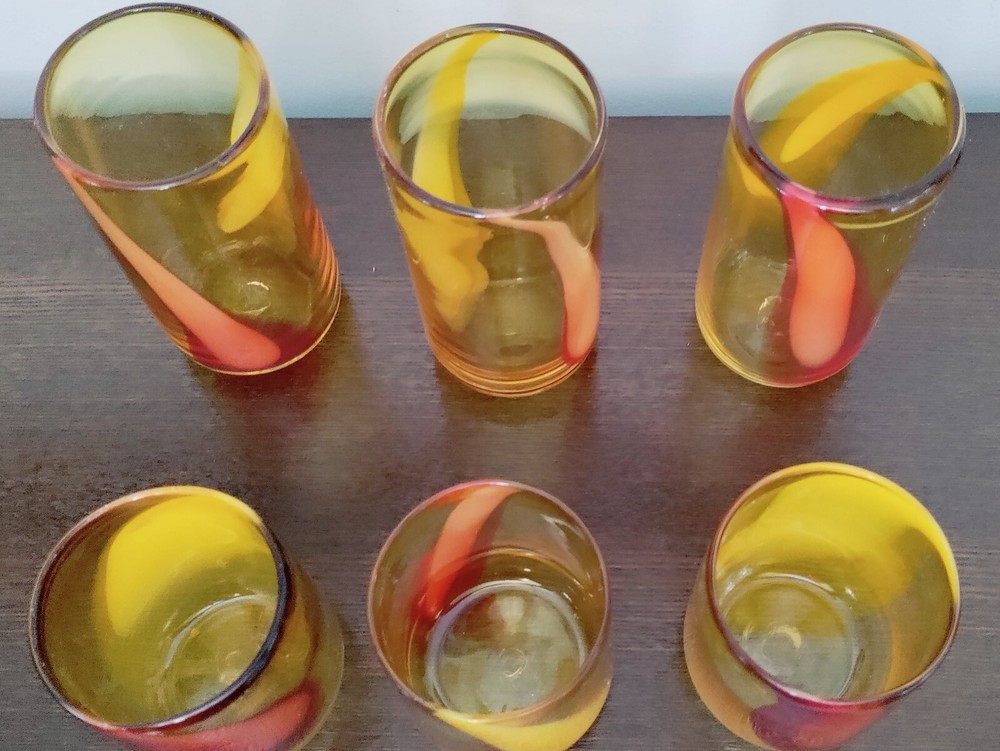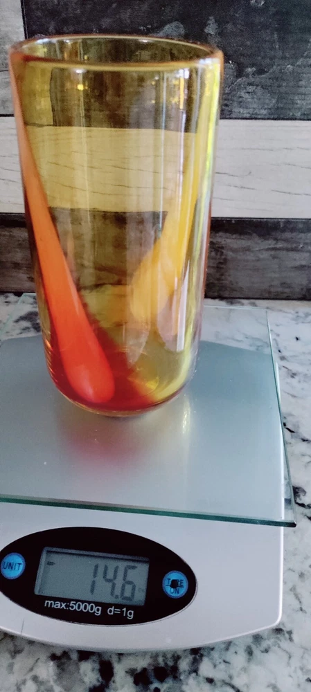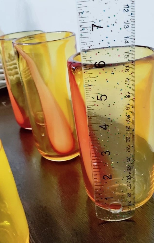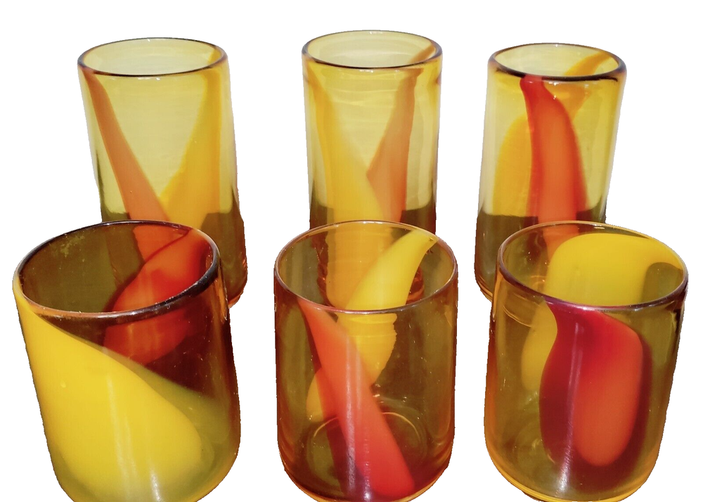 6 Handblown Glasses Blown Orange Red Add a pop of color to your barware collection with this six-piece stemless cocktail glass set. The round glasses feature a wavy line design in a vibrant multicolor swirl pattern. Handcrafted and hand-blown in 1999, these mid-century modern glasses are perfect for all occasions and can hold cold beverages. Care instructions include hand washing only. The set includes six unique glasses and is a mix of orange and red hues. Ideal for collectors or those looking to upgrade their glassware, this art glass set will add some vintage flair to any bar or kitchen. Set Includes: 3 Tall Glasses Approximately 6" inches Tall. Each Big Glass Weight: 14.6 Oz 3 Small Glases Approximately 4" 1/2 inches Tall Each small glass Weight: 9.3 Oz Condition: Used Great Condition. Review photos as they show the exact item you will receive; they are hereby made part of the description. What you see is what you will get. Please ask questions if having any BEFORE bidding. ✔ Check Our Pottery & Glass Collection Eclectic and Beyond | eBay Stores Enter Here ✔ E b a y Shipping information USA Free Shipping ✔ Shipped with USPS Ground Advantage. Please Note: I do my part to reuse and recycle packaging whenever possible. Not only does this help the environment, but it also allows me to keep costs down and offer free shipping on most items. Thank you for supporting sustainable shipping! International Customers IMPORTANT- Customs, import duties, taxes, etc. are not included in the item price or the shipping cost. These charges vary by country and are the buyer's responsibility. Please check with your country's customs office to determine what these additional costs will be prior to purchase. Also Available Boston Terrier Soft Plush Throw Blanket Autumn Fall Frenchie Blanket 50x70 ✔ | eBay LED Capiz-Style Star Tree Top GE StayBright 16ct Warm White | eBay ☆ ☆ ☆ ☆