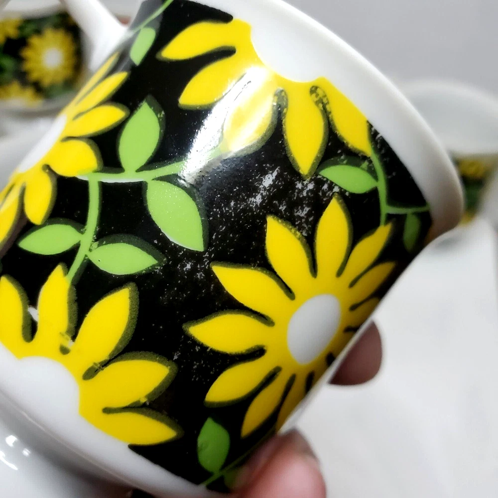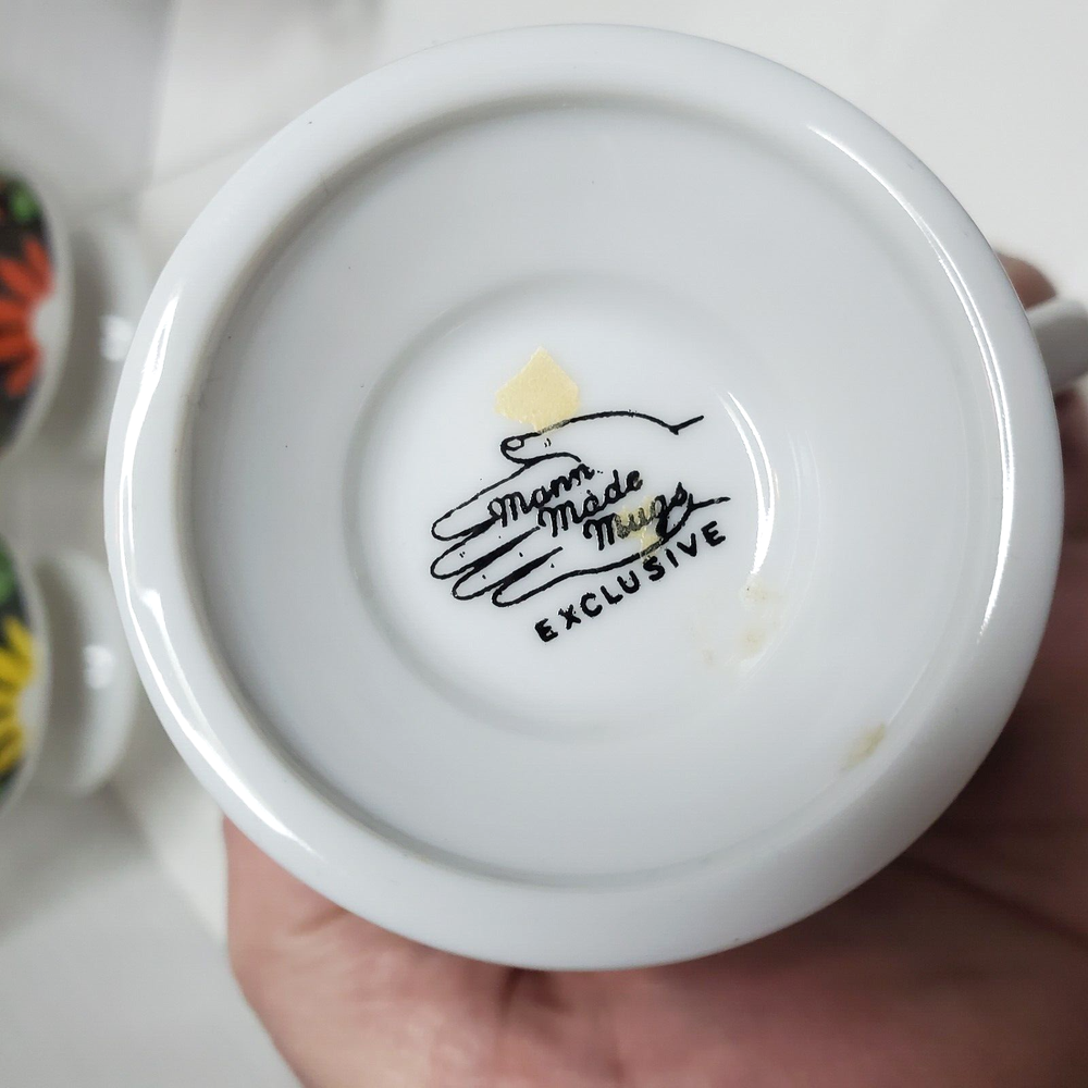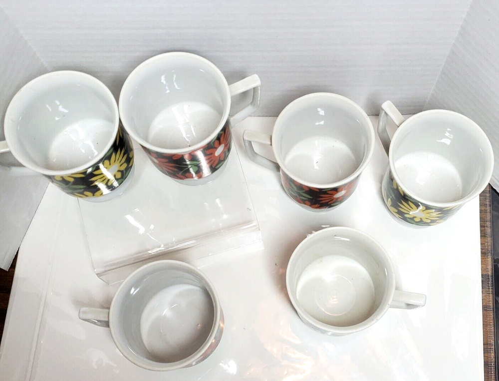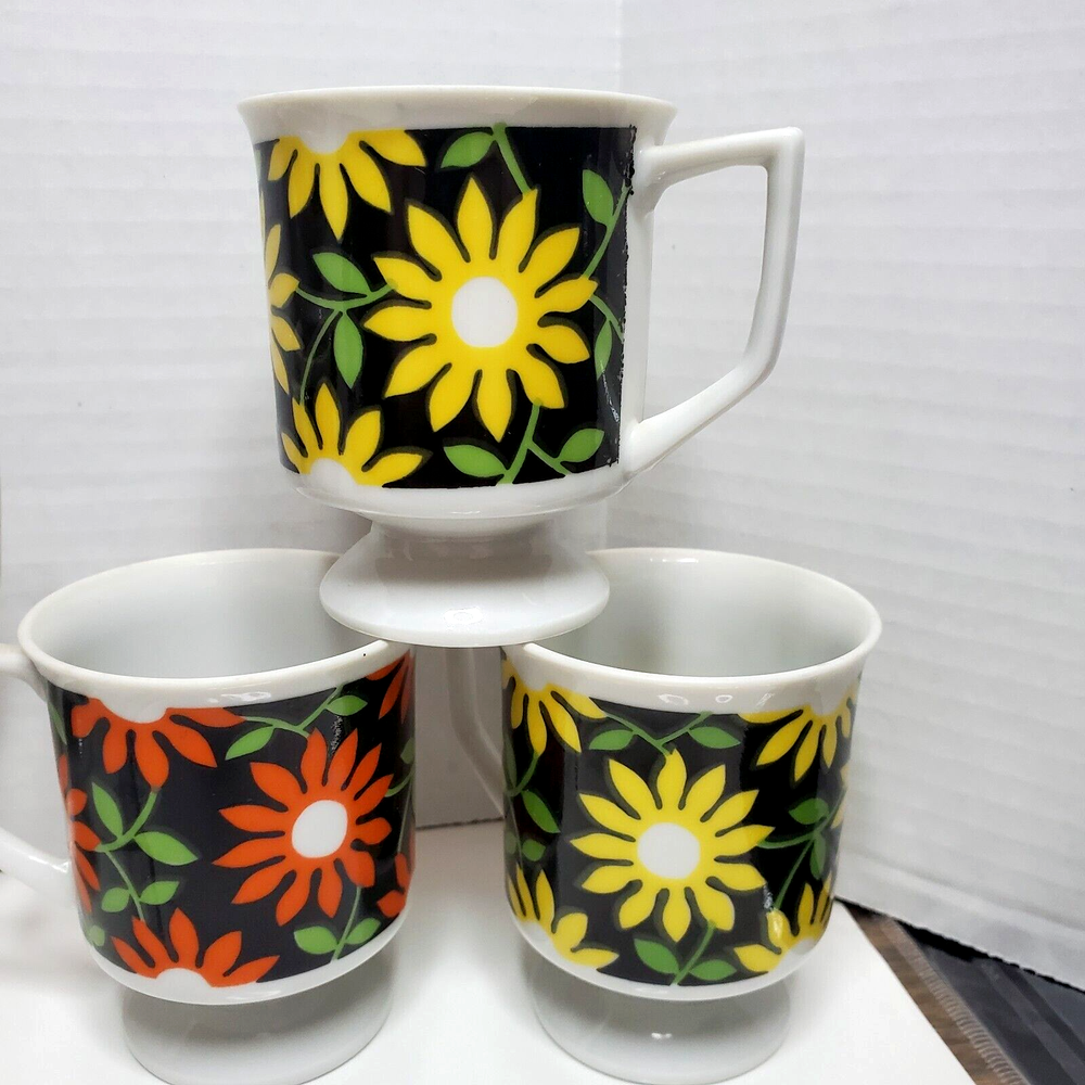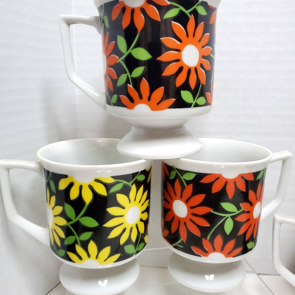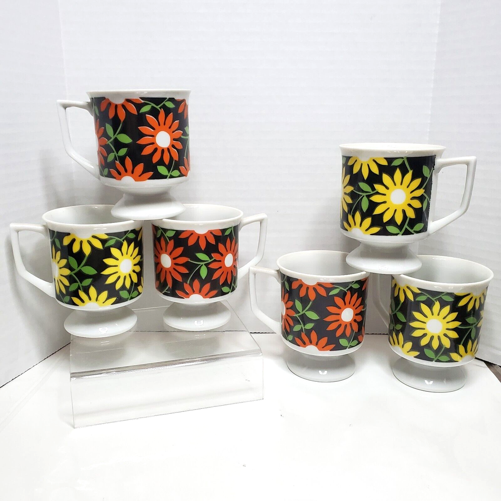 6 Orange Yellow Floral Coffee Tea Cup Mid Century Retro pedestal Mann Made Mug Approx. Size: 2 3/4 " wide 3 1/4" tall Most have manufacturing imperfections in the ceramic | no cracks | several have some manufacturing paint issues Cups will be double boxed to increase a safe delivery.