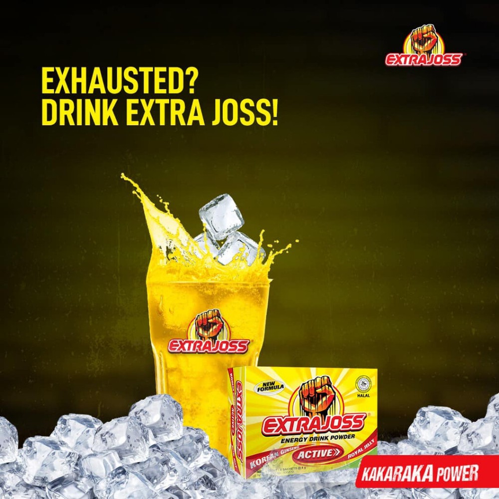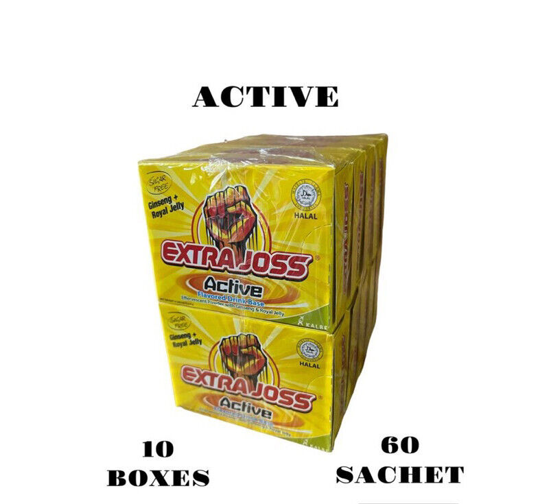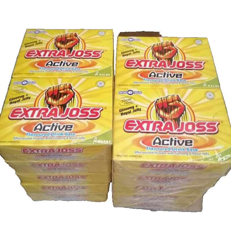 Product Description 4 grams x 6 sachet x 10 boxes (60 sachet) Extra Joss is a refreshment drink that give fruity taste, with additional benefit of Power from Extra Joss endorsement - Boost Body's Immune System - Royal Jelly Helps Enhance Immune System - With Vitamin B6,B9 and B12 Directions - Take and tear 1 sachet of Extra Joss - Pour the powder in to glass - Pour cold water (300 ml) to the glass - The powder will dissolved immediately - Serve it immediately while chilled Ingredients . - Compositions: Grape, Mango& Extract 150 mg, Ginseng Extract 35 mg, Vitamin B1 1.5 mg / 1.1 mg, Vitamin B6 2 mg, Vitamin B12 2.4 mcg/2.0 mcg, Taurine 100 mg, Caffeine 50 mg, Sugar, Aspartame, Citric Acid, Royal Jelly Caution - Not advisable for children below 12 years old and pregnant women. Storage Instruction - Store below 30°C Packaging - 10 boxes x (6 Sachets x 5.5 g) Nutritional Information (Per 100g) - Energy: 295 cal - Total Carbohydrate: 69 g - Total Sugar: 0 g - Protein: 4.9 g - Fat: 0.9 g - Vitamin B3: 375 mg - Vitamin B6: 50 mg - Vitamin B12: 60 mcg